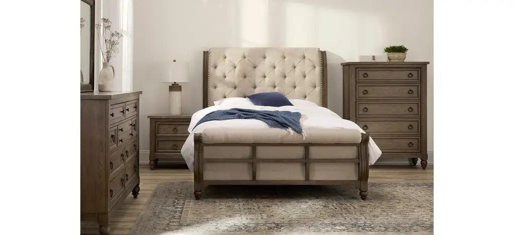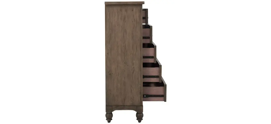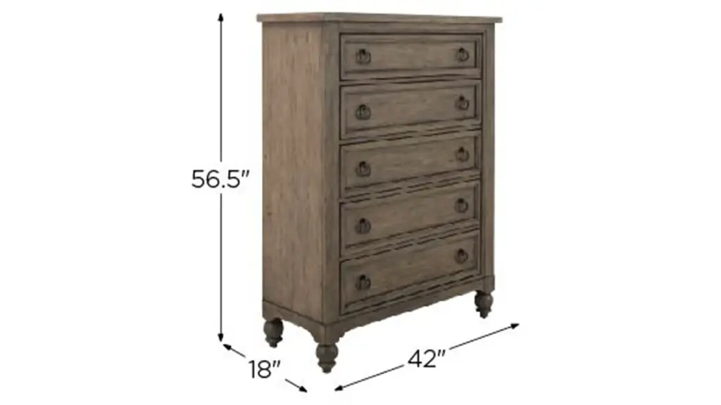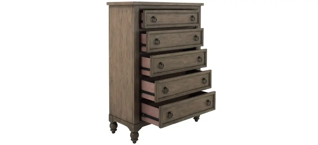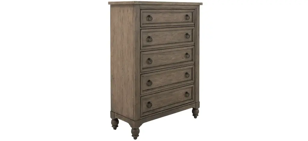 With artistic flair and classic style, the Coventry chest adds a cozy and grand vibe to the bedroom. Crafted of hardwood solids with white oak veneers, it features a wire-brushed finish with worm hole distressing. Five drawers offer plenty of space for essentials and additional items, while antiqued bronze hardware and turned bun feet accentuate the graceful frame.