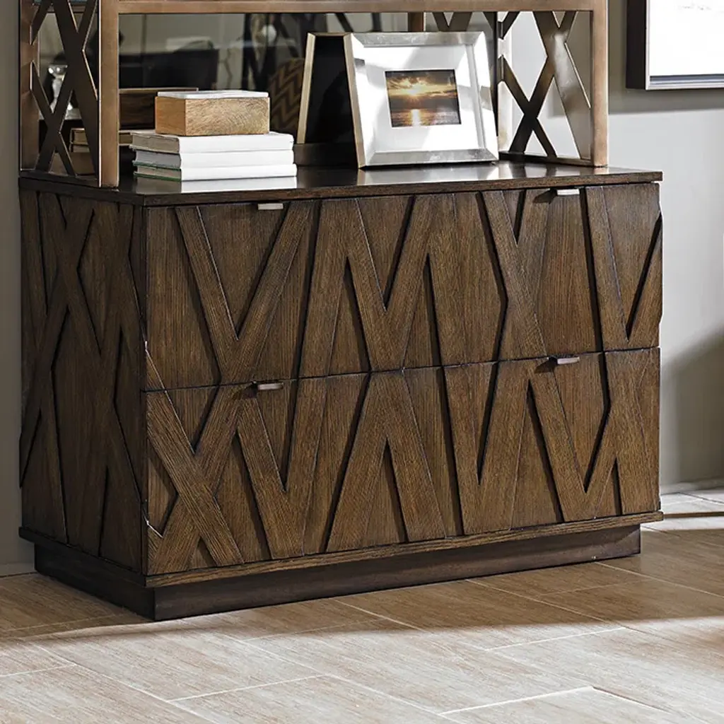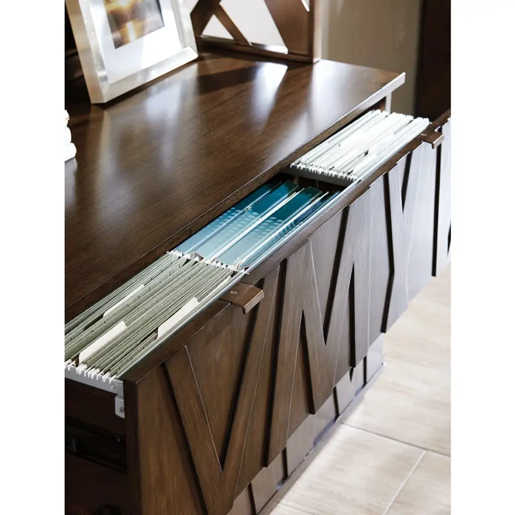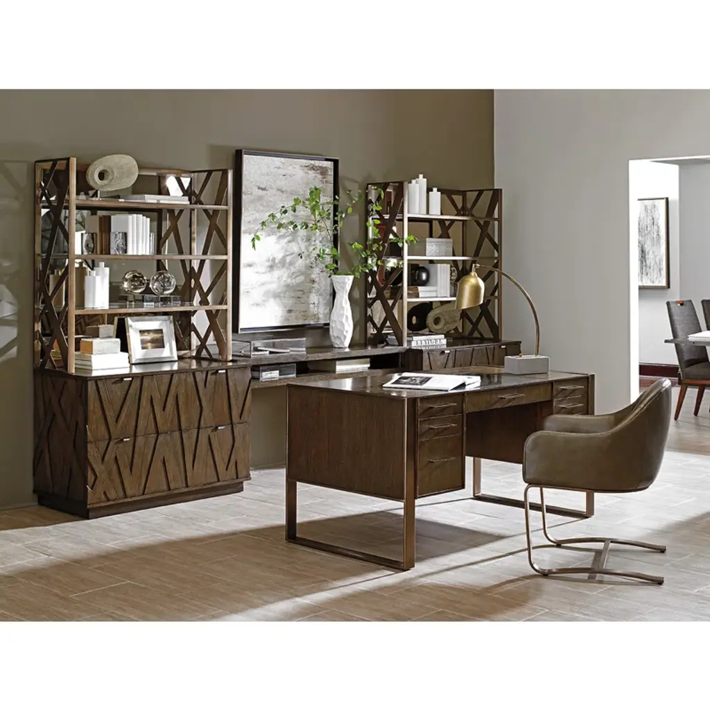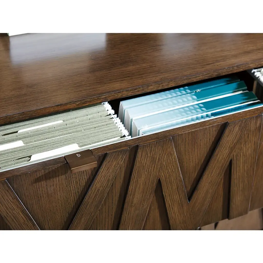 The file chest is a signature piece in the collection, showcasing asymmetrical wooden overlays on the drawers and end panels. The piece features two full-extension letter/legal file drawers. The file chest is designed to pair with the Prism metal deck, which offers three stationary glass shelves, a bronze mirror back panel, and decorative metal fretwork on the end panels.