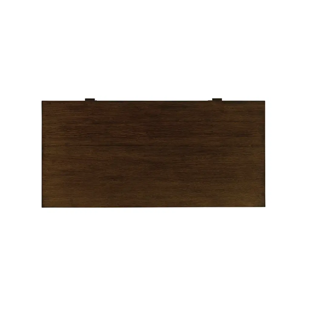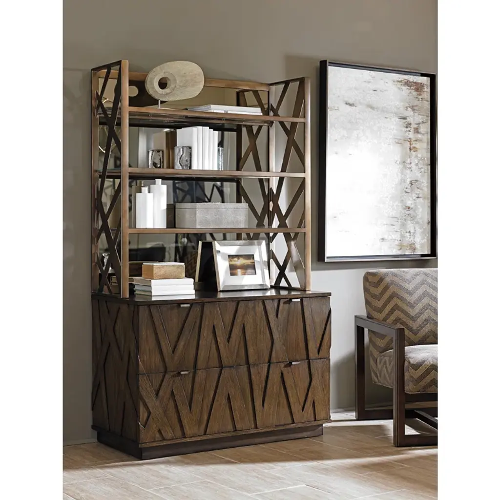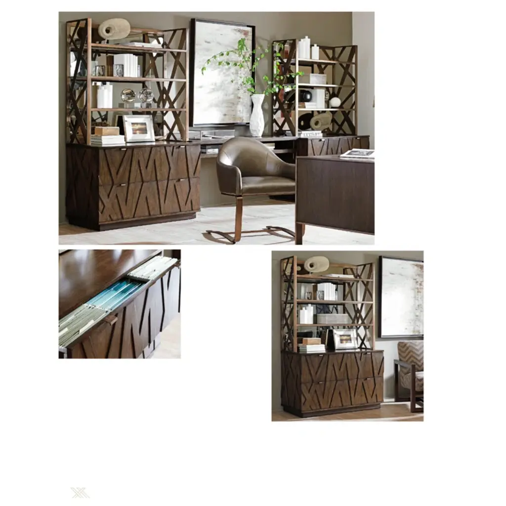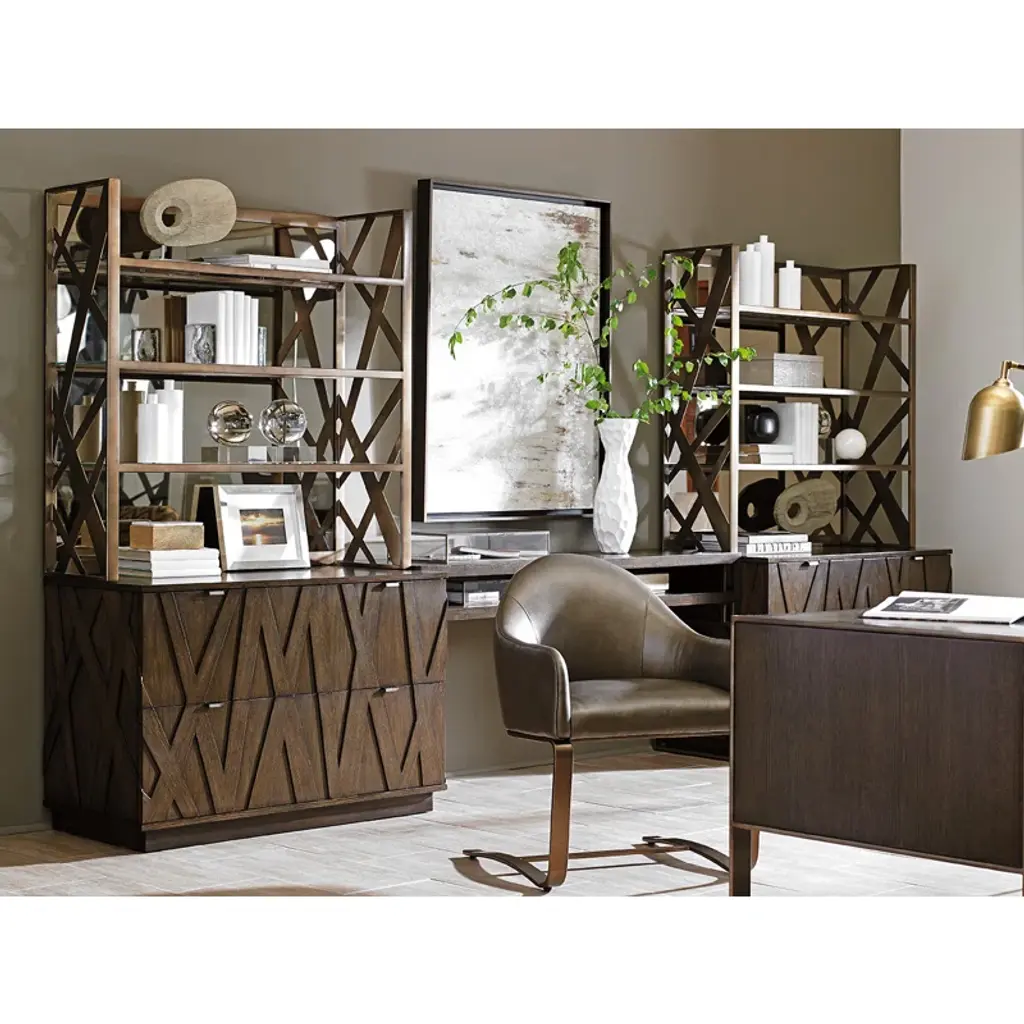 The file chest is a signature piece in the collection, showcasing asymmetrical wooden overlays on the drawers and end panels. The piece features two full-extension letter/legal file drawers. The file chest is designed to pair with the Prism metal deck, which offers three stationary glass shelves, a bronze mirror back panel, and decorative metal fretwork on the end panels.