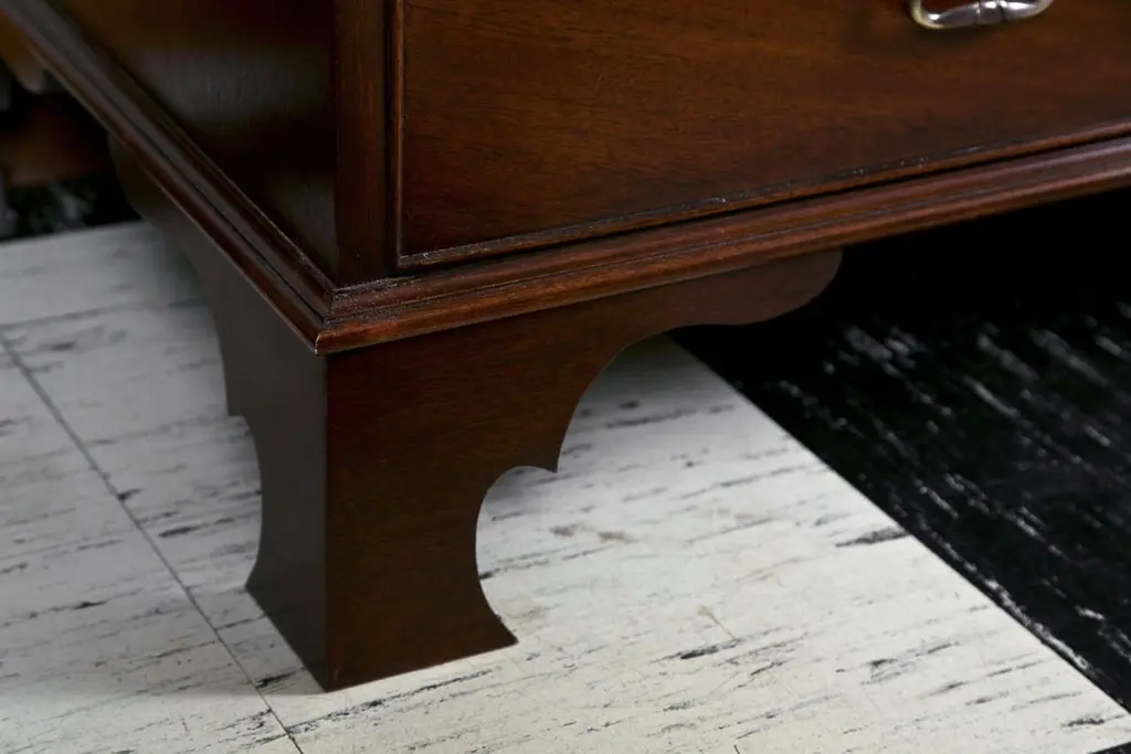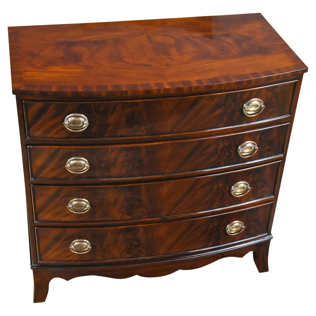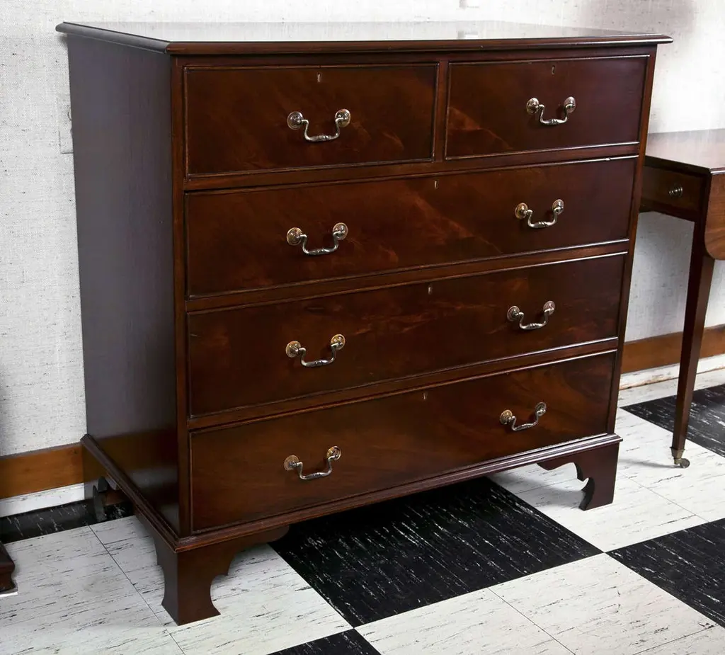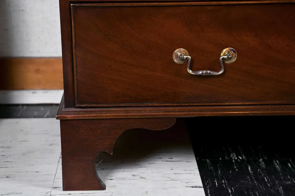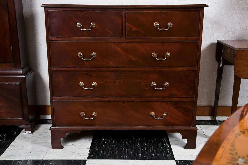 This Classic five-drawer chest has all the proper elements one seeks in such a piece. From the beaded drawers to the shaped bracket feet and including the brass bail hardware, it ticks off all the boxes. With beautiful crotch mahogany covering the front and a narrow stringing on the top, this chest will look well with any antiques it might find itself near.