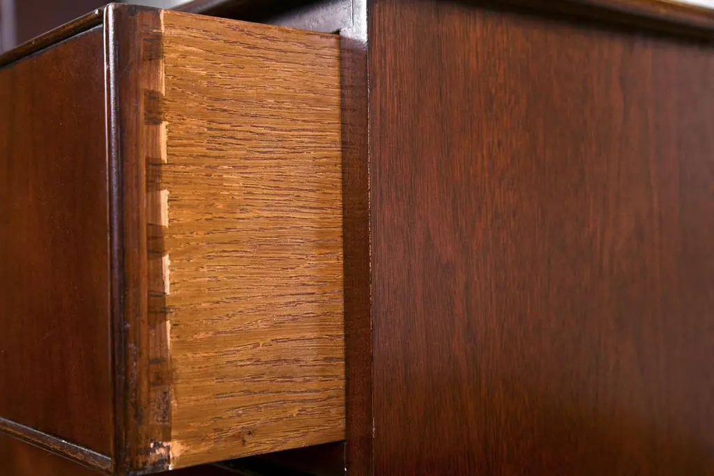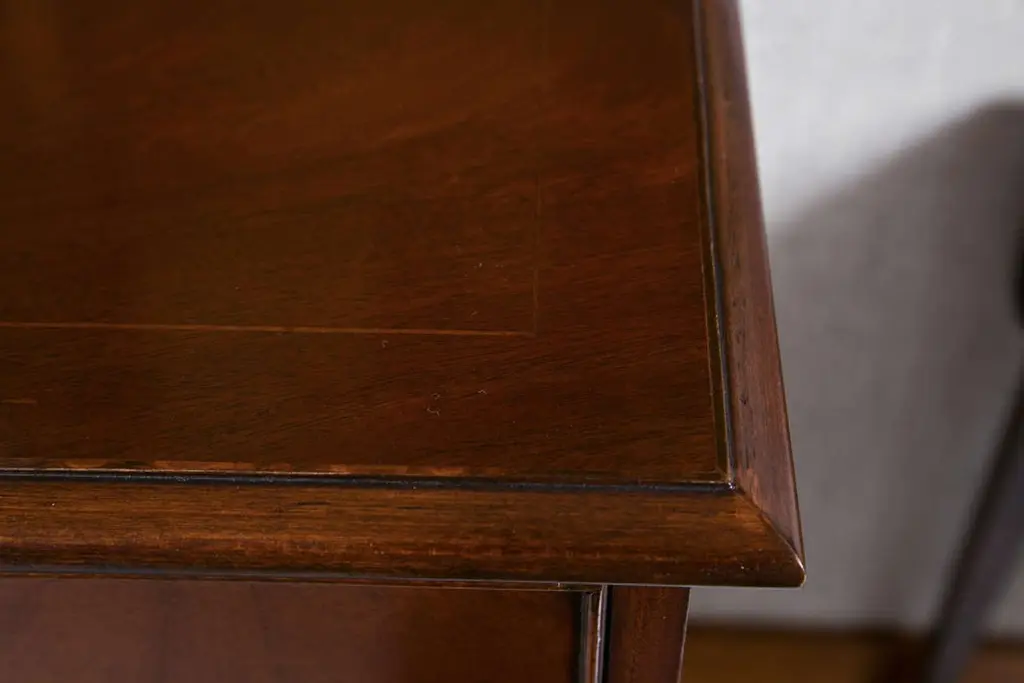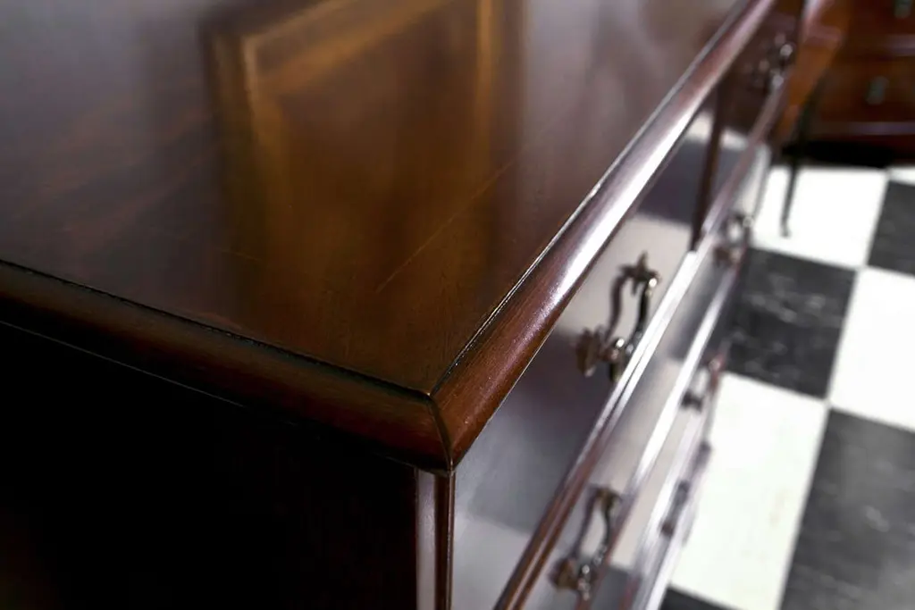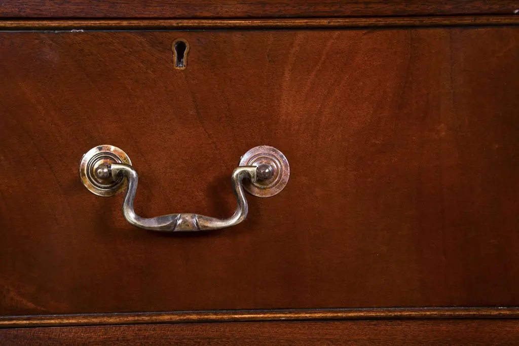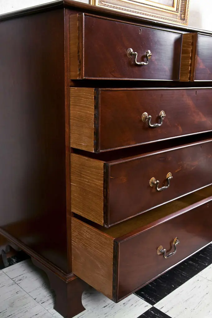 This Classic five-drawer chest has all the proper elements one seeks in such a piece. From the beaded drawers to the shaped bracket feet and including the brass bail hardware, it ticks off all the boxes. With beautiful crotch mahogany covering the front and a narrow stringing on the top, this chest will look well with any antiques it might find itself near.