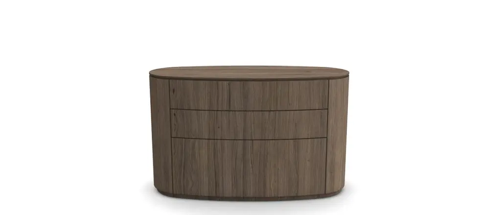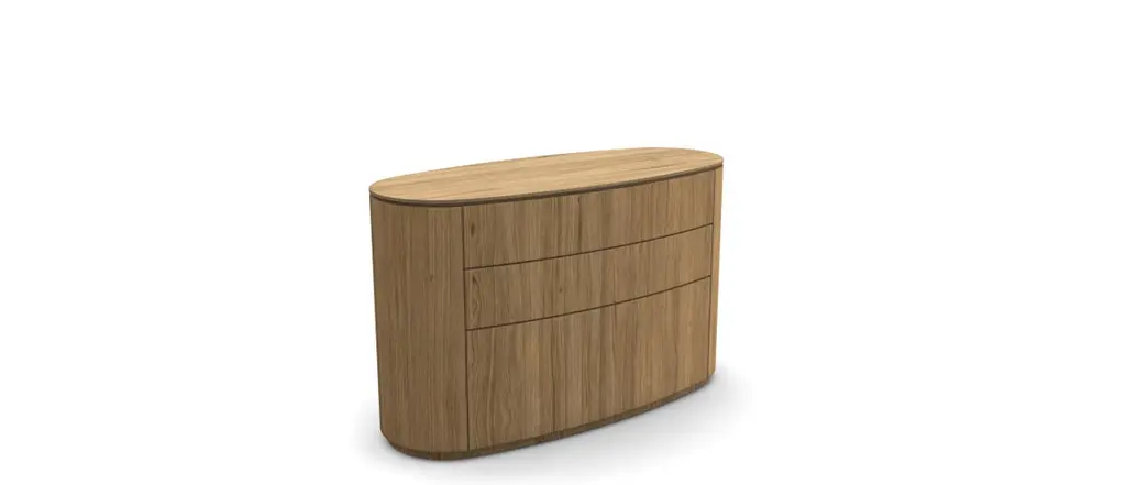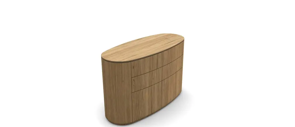 A minimal and elegant chest of drawers crafted in solid oak top and oak body veneer, featuring a gently curved, oval silhouette. The seamless drawer fronts maintain clean lines with subtle horizontal grooves, offering a refined and contemporary aesthetic. A sophisticated storage solution that brings warmth and understated luxury to any interior.Note: Pricing reflects the finish and material shown in the primary image. Alternate finishes and customizations are available upon request.We will be glad to check with the factory’s technical team if sizes, finishes, and colors can be customized. We do our best to expedite production and to ship and deliver product within the listed lead time, however current lead times might be longer due to global shipping backlog and delays. These delays are out of our control and cannot be a reason to cancel an order.
