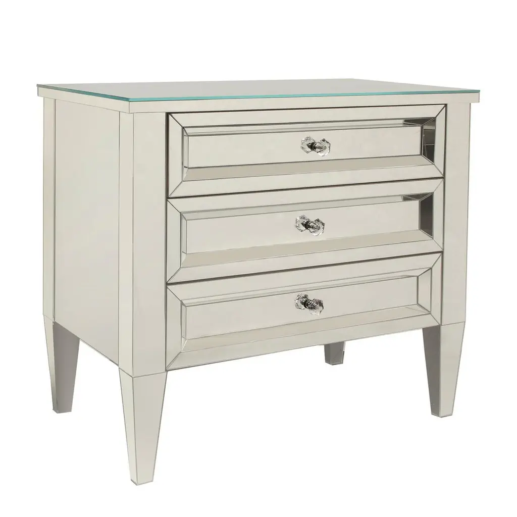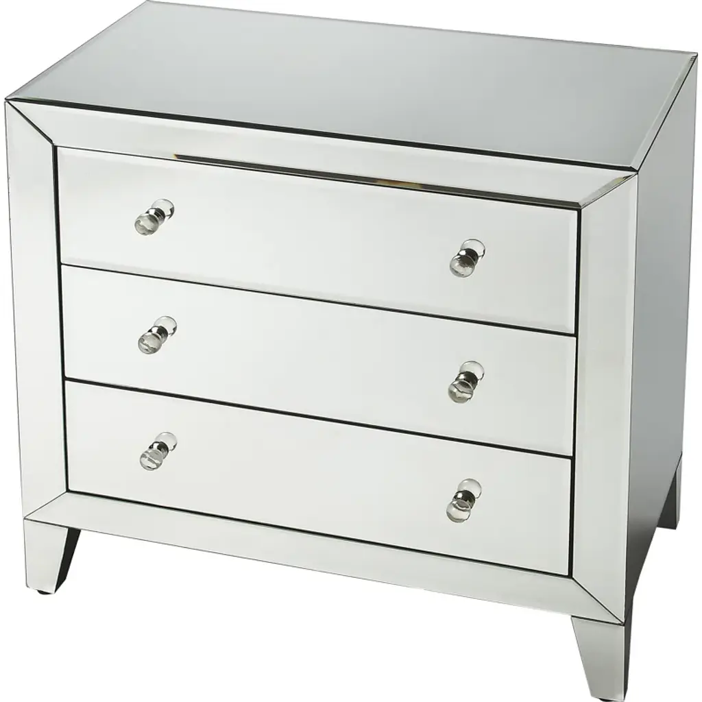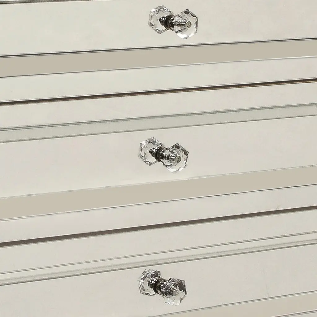 Made to order, custom mirrored three drawer chest with faceted crystal drawer pulls. Designed by Venfield, NYC. Custom dimensions and hardware available. Please inquire with Venfield.This piece is currently available as pictured in our NYC showroom.