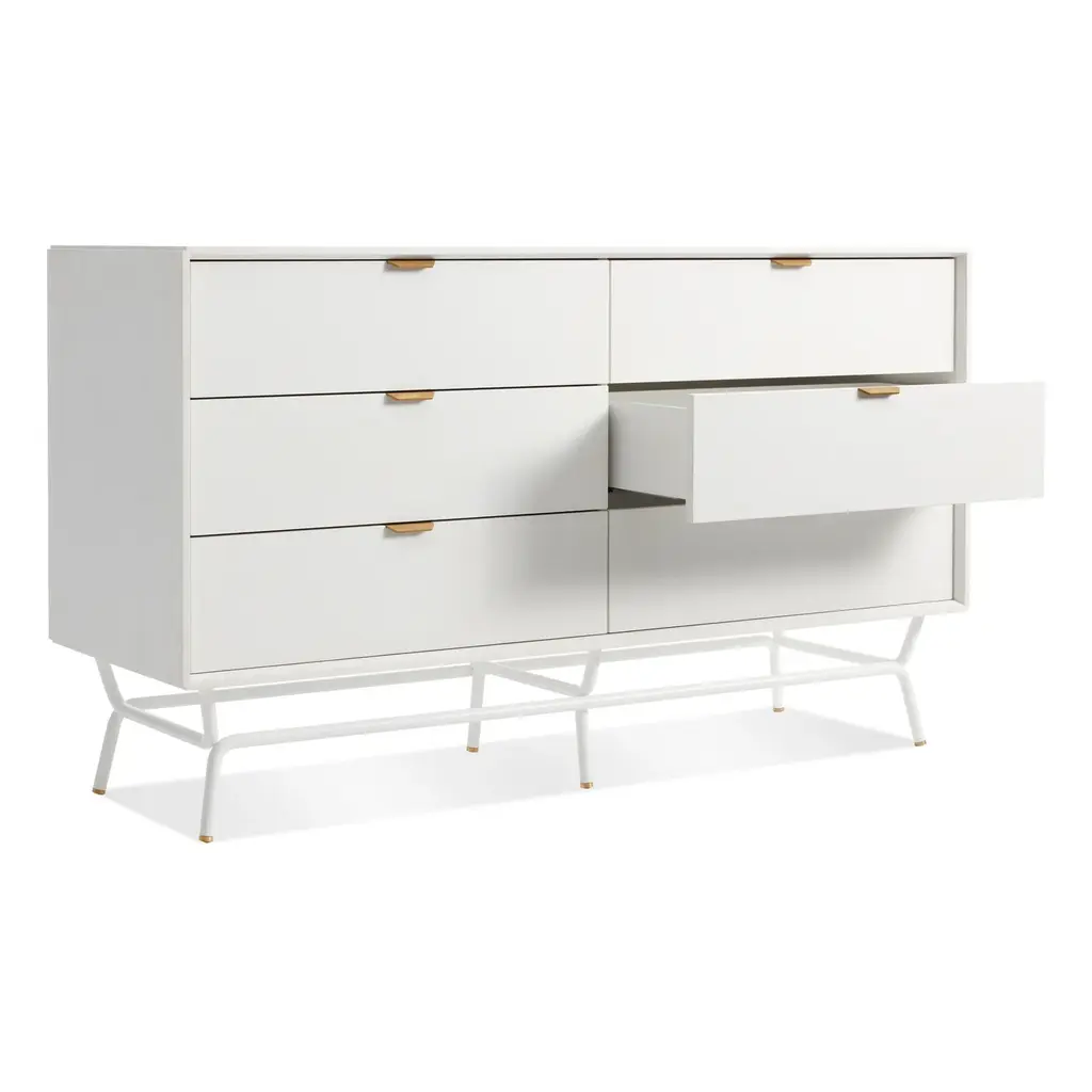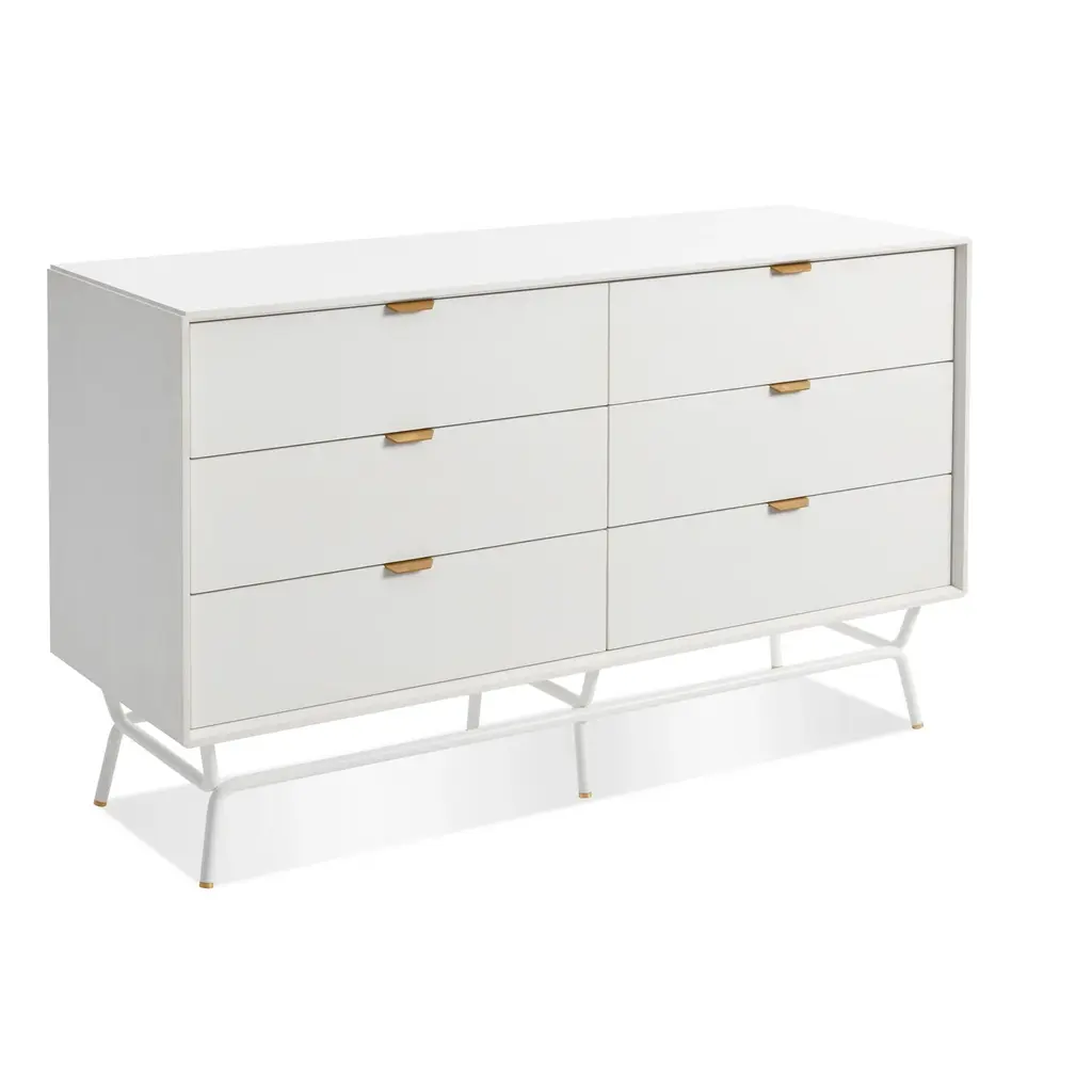 Give simple a lift. A powder-coated steel base props up a refined, unassuming silhouette. Antique brass pulls keep it pretty. Soft-close drawers keep it quiet. Available in a bevy of sizes to stylishly store your unmentionables and mentionables. All worth mentioning.