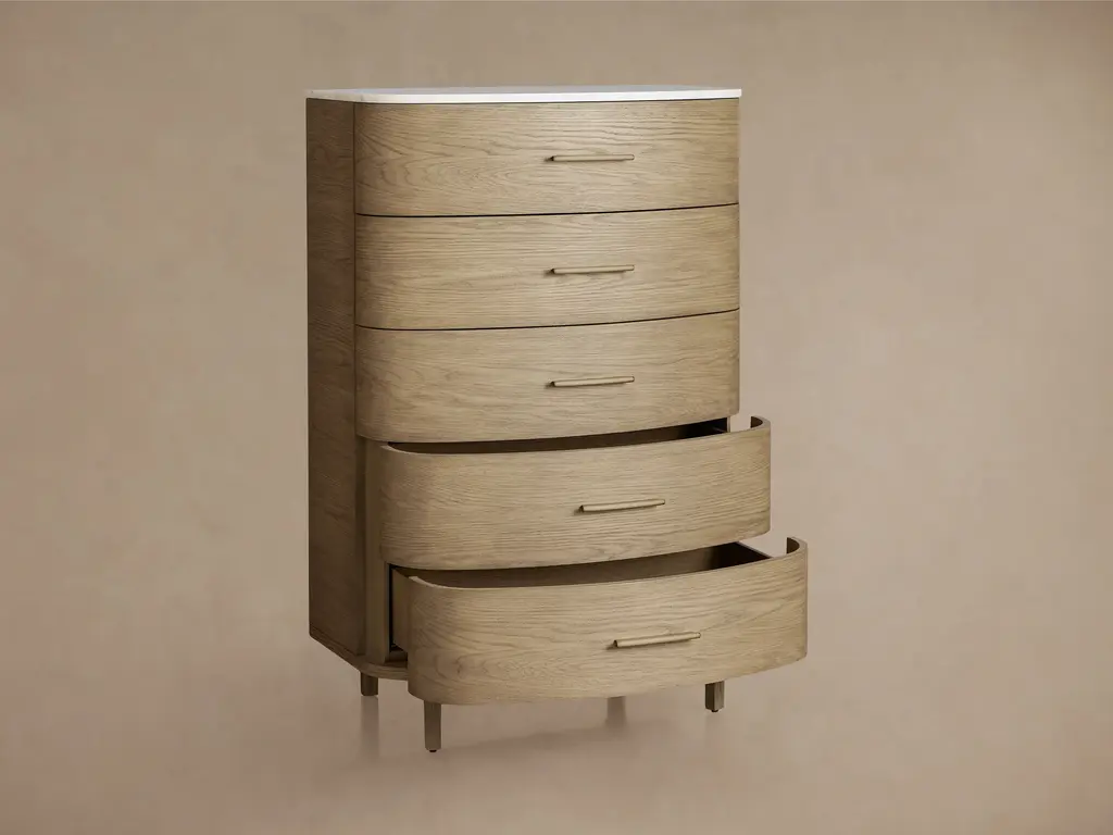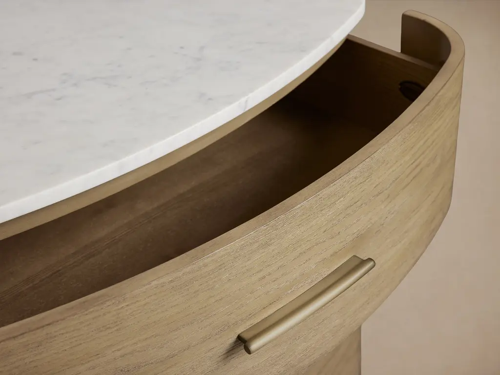 Elevate your bedroom oasis with our Danny Bedroom Collection. Crafted from oak wood with beautiful hand-applied finishes, Danny’s gently curved silhouettes elevate your space with wood or marble tops and contrasting brass pulls.