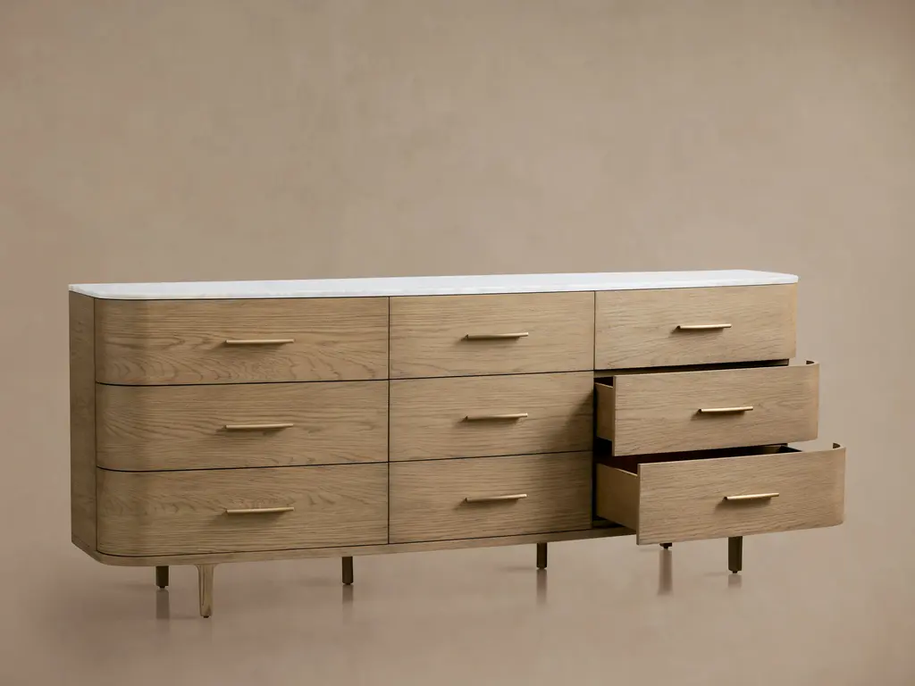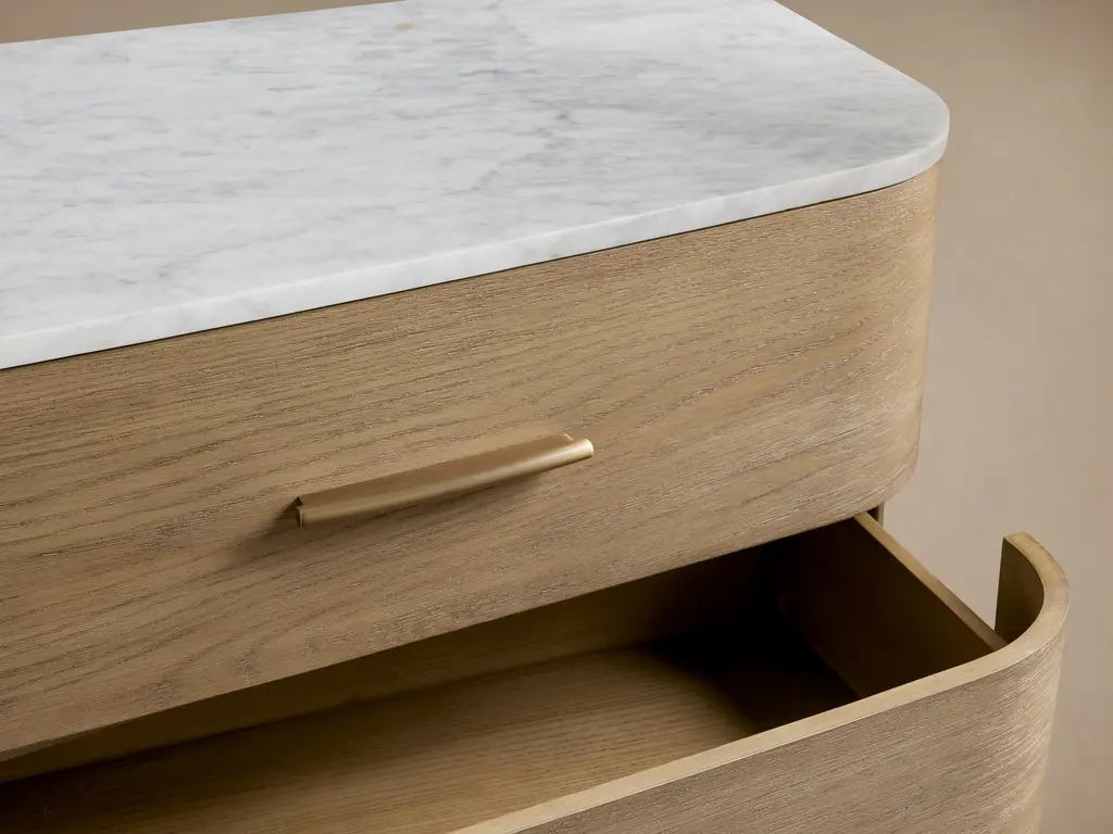 Elevate your bedroom oasis with our Danny Bedroom Collection. Crafted from oak wood with beautiful hand-applied finishes, Danny’s gently curved silhouettes elevate your space with wood or marble tops and contrasting brass pulls.