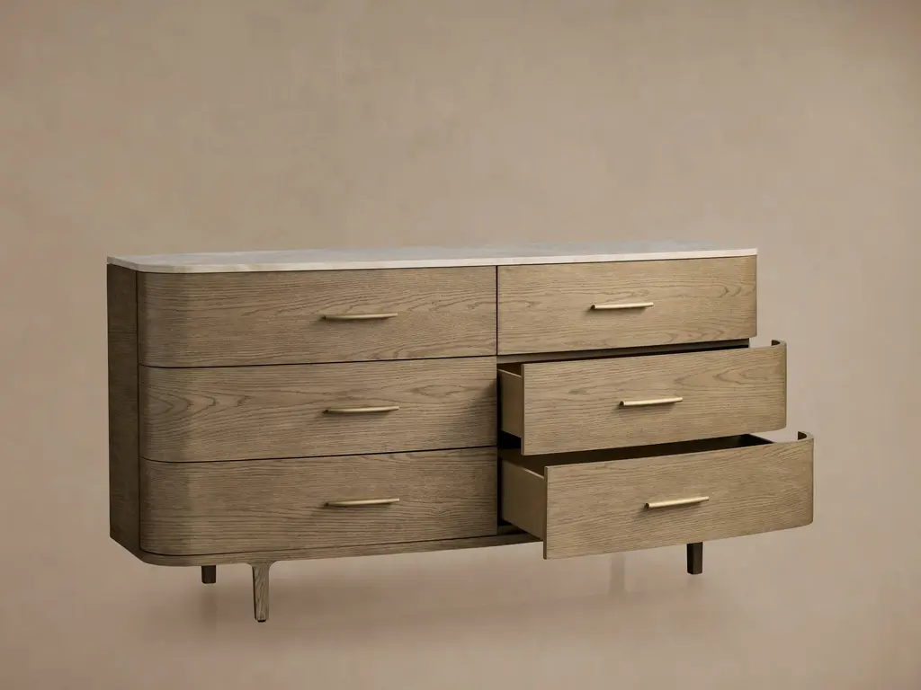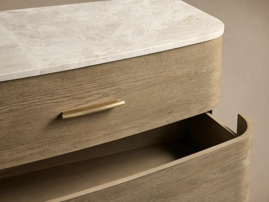 Elevate your bedroom oasis with our Danny Bedroom Collection. Crafted from oak wood with beautiful hand-applied finishes, Danny’s gently curved silhouettes elevate your space with wood or marble tops and contrasting brass pulls.