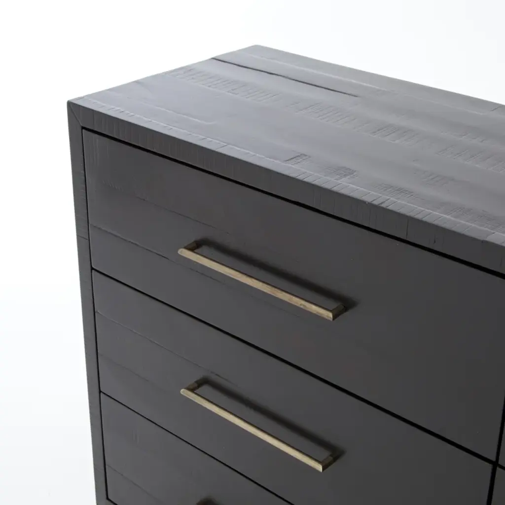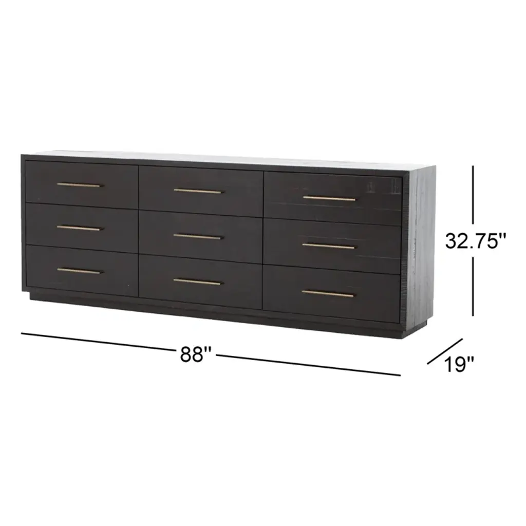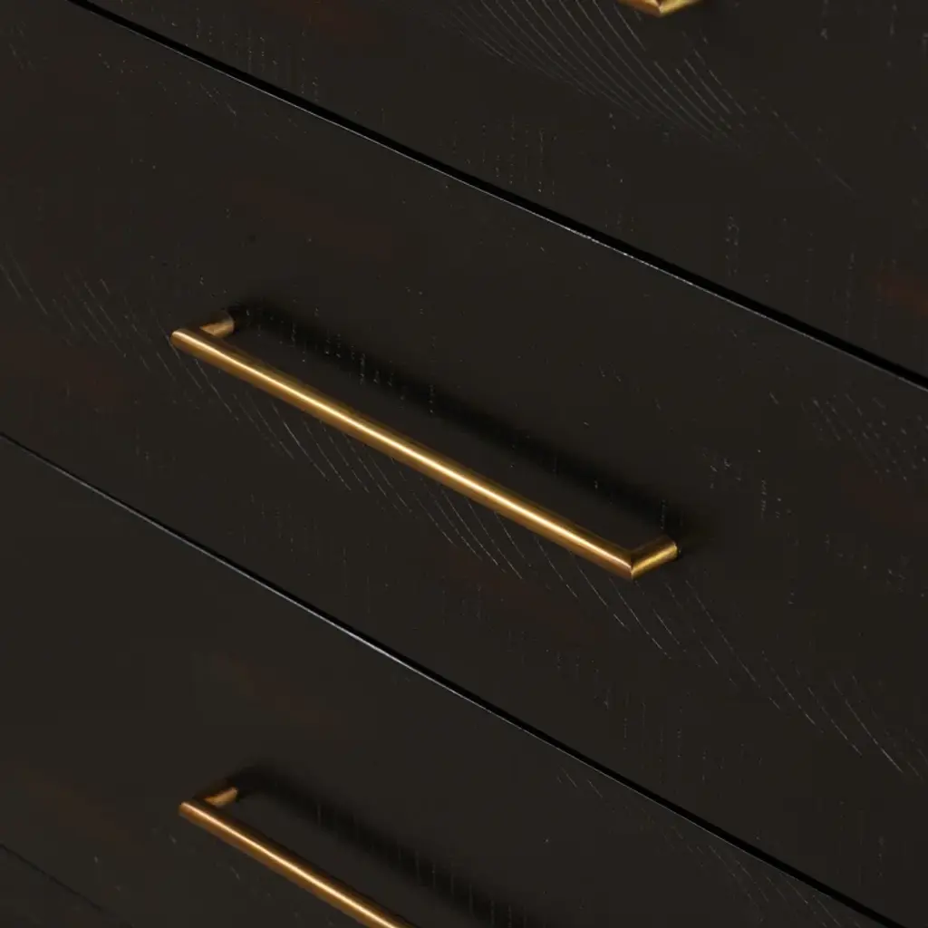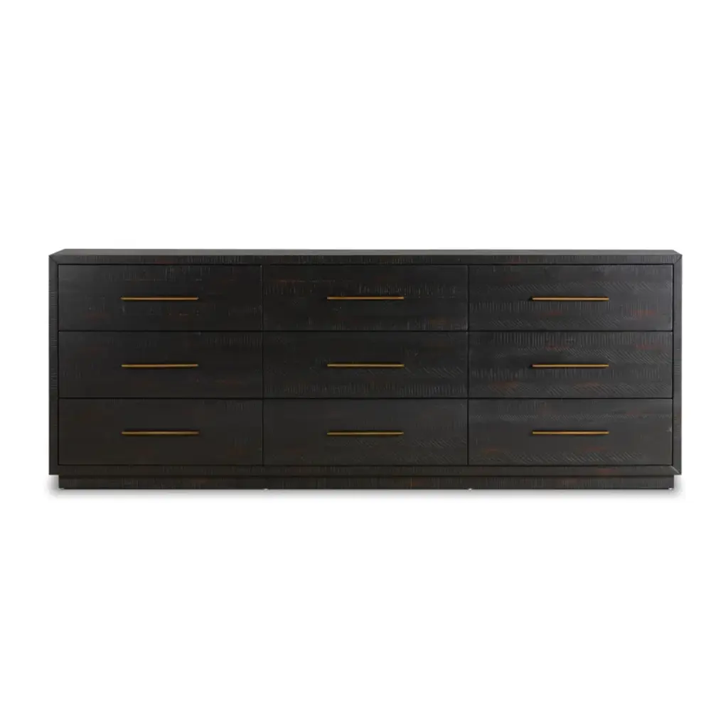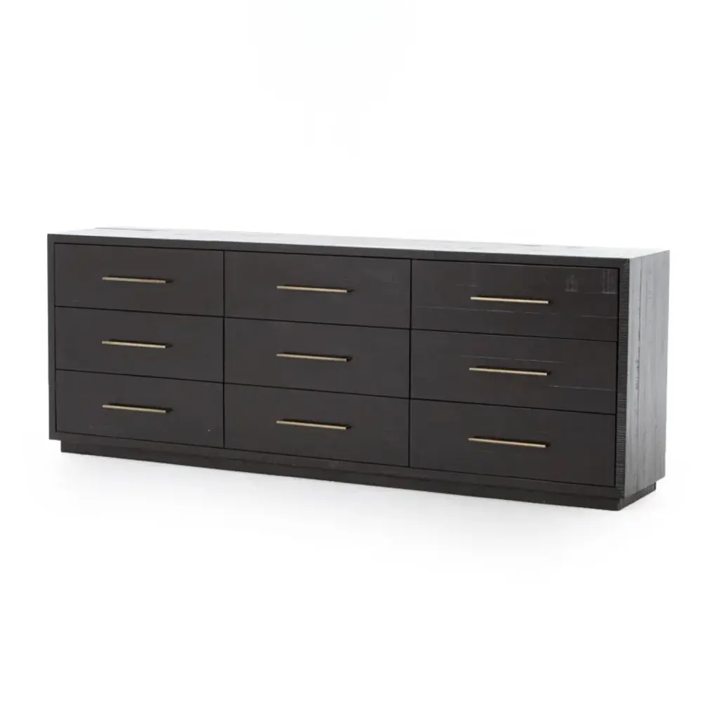 Simple sophistication with a modern edge. Solid acacia forms long, clean lines to lighten the natural depth of a burnished black finish. Brass-finished hardware adds a sleek touch to nine spacious drawers.