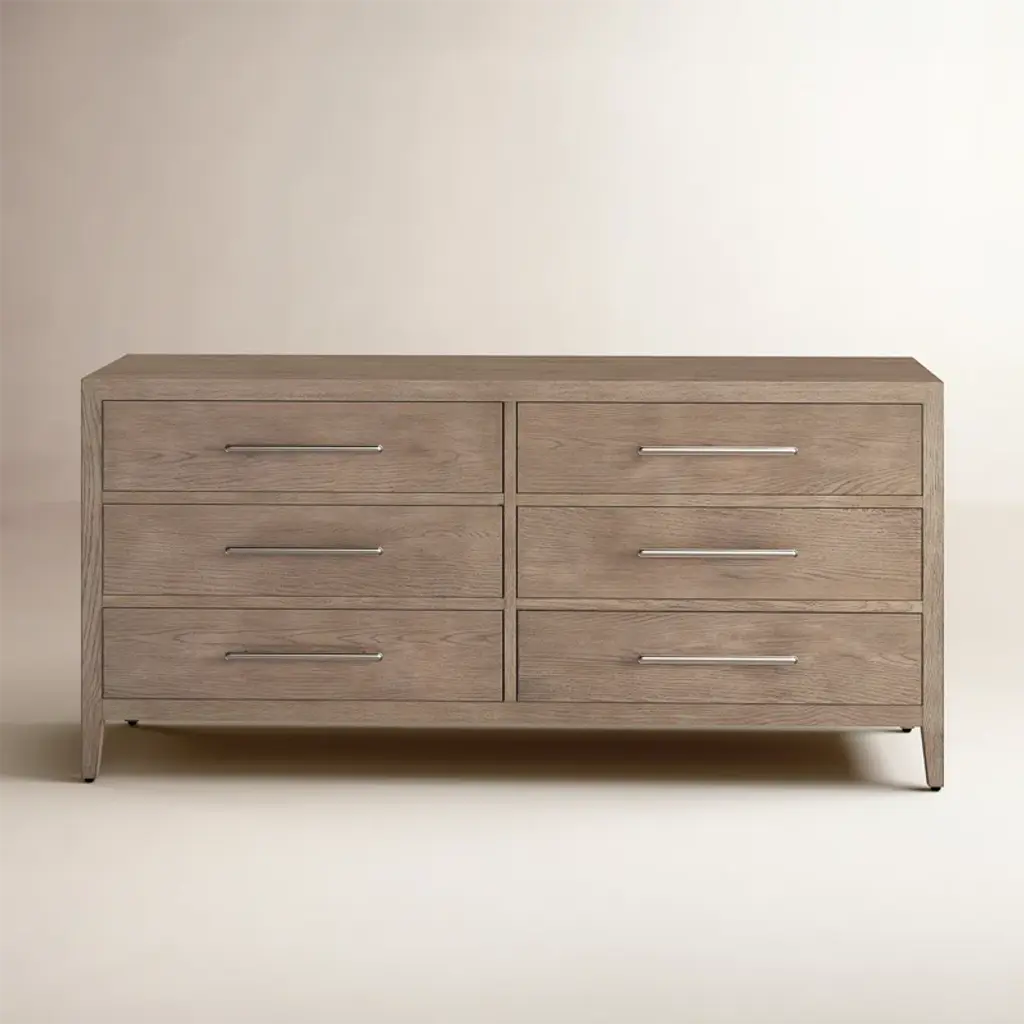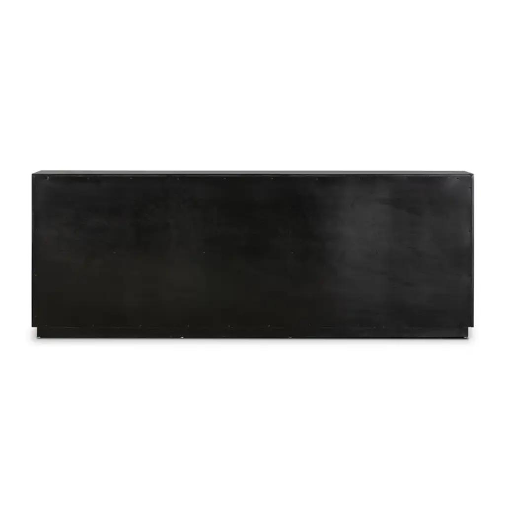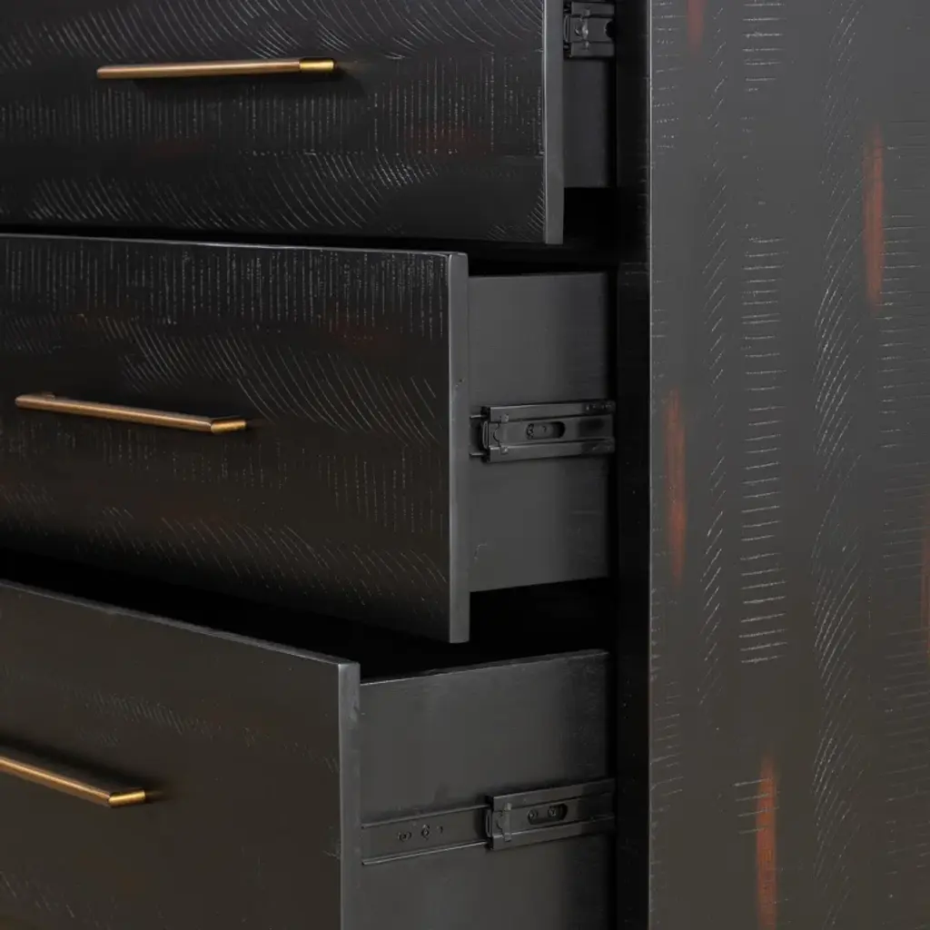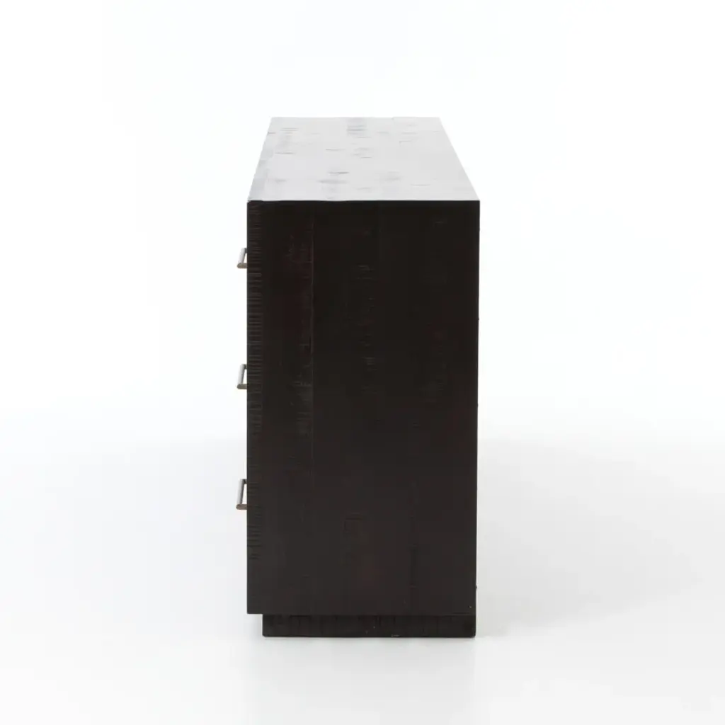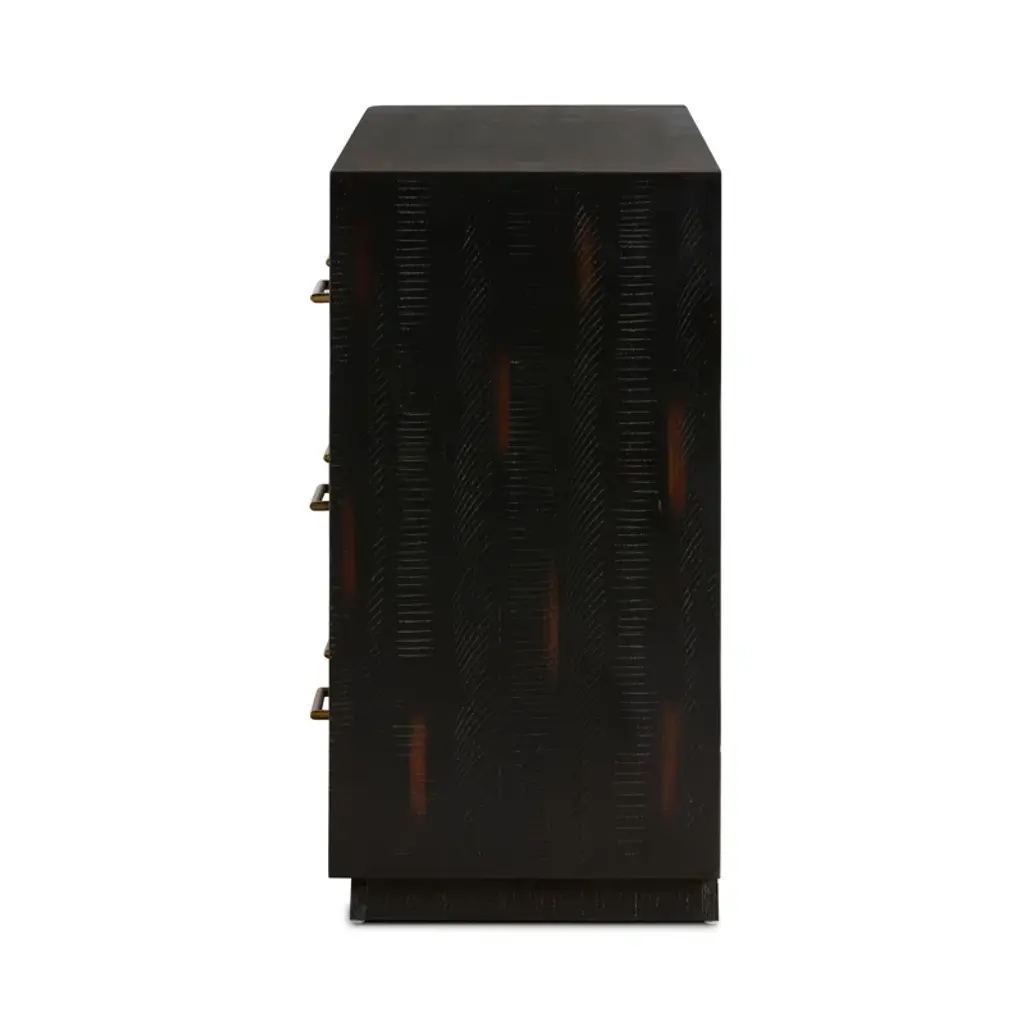 Simple sophistication with a modern edge. Solid acacia forms long, clean lines to lighten the natural depth of a burnished black finish. Brass-finished hardware adds a sleek touch to nine spacious drawers.