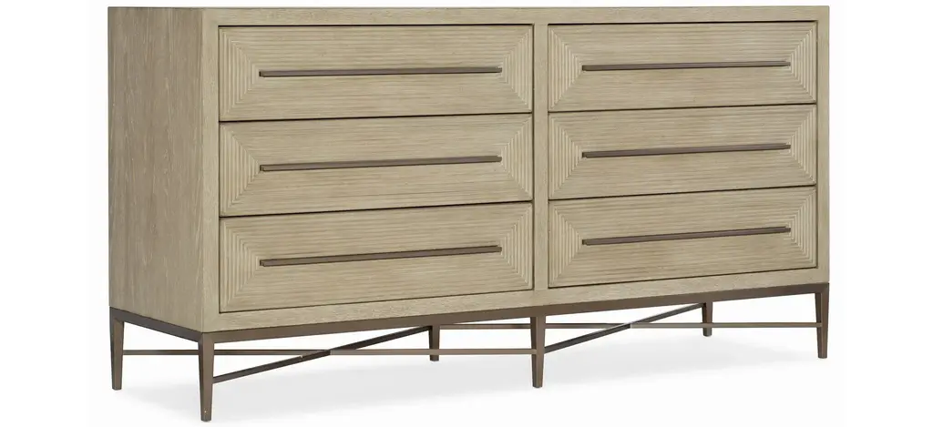 a sleek seven-drawer dresser made of figured cathedral ash in a dark Earth finish with textured metal pulls in our Ember finish and soft close drawers.Dimensions: 64" W x 21" D x 35.75" H