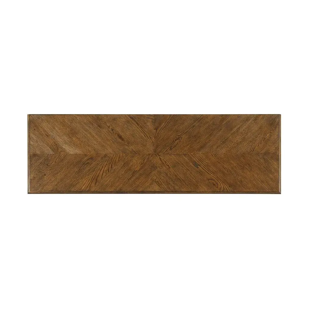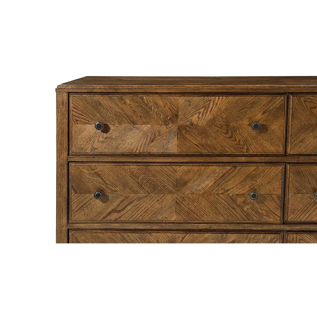 A dark rustic-style dresser with six hand-veneered drawers accented with Verde Bronze finish handles and tapered oak legs. Shown in Dusk Finish DIMENSIONS 63.5" W x 20" D x 37.75" H