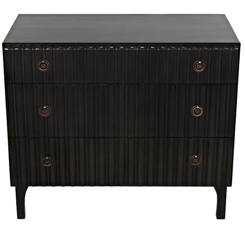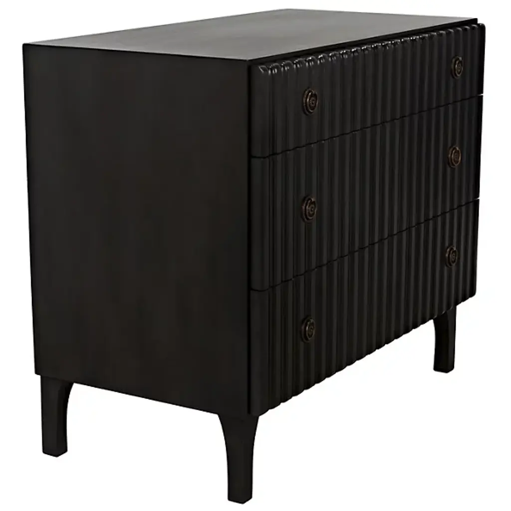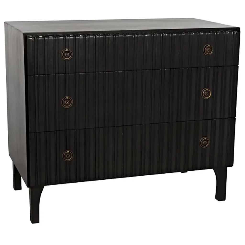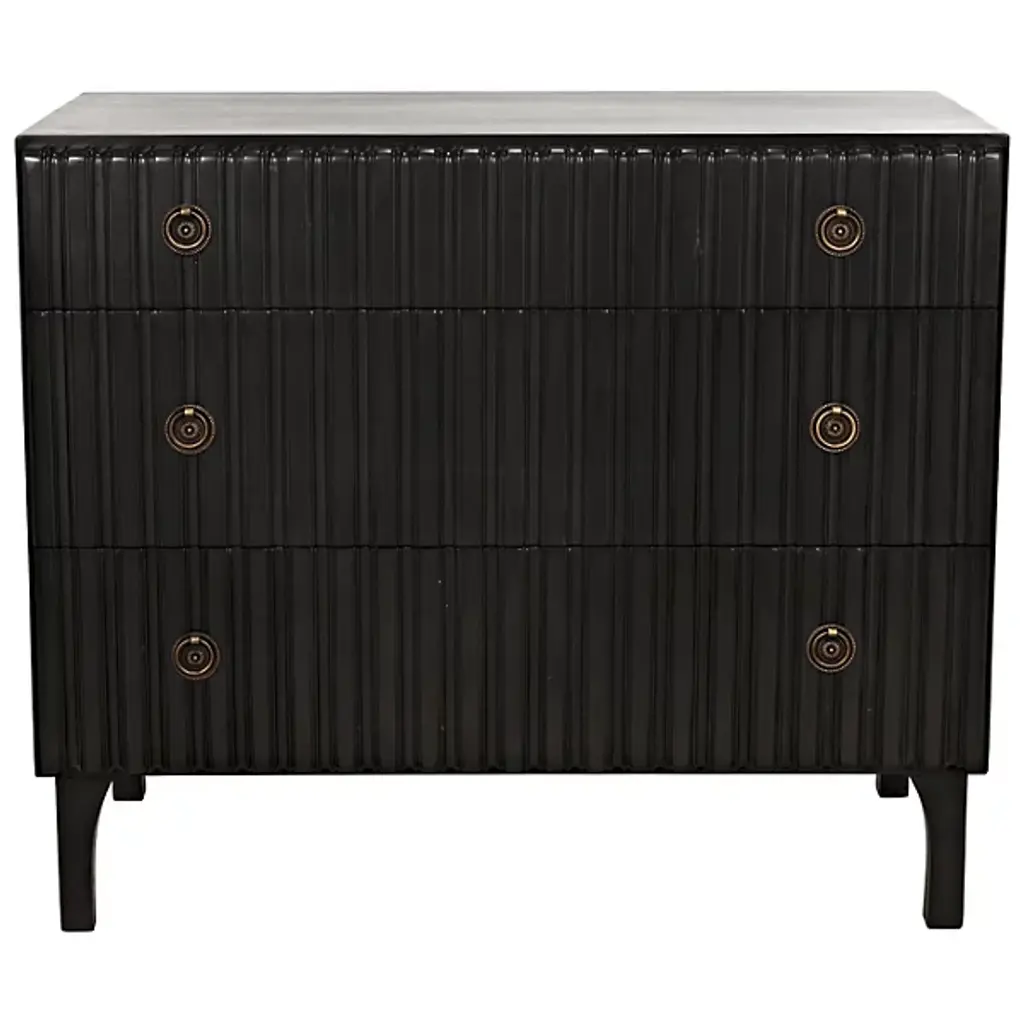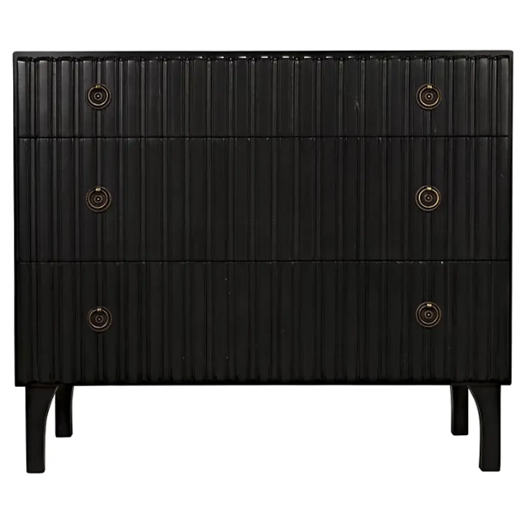 Decorate interiors while storing clothes with the unforgettable Daryl Dresser from Noir. At once simple and sculptural, this mahogany and veneer ensemble is elevated by four curve-contoured legs, creating a bit of air beneath the rectangular housing and holding three drawers stacked in a vertical column. The mahogany wood is relieved by vertical carving done by hand, adding a touch of industrial intricacy. Circular metal pulls offer smooth purchase and access, transforming its surroundings with an elegant appeal.