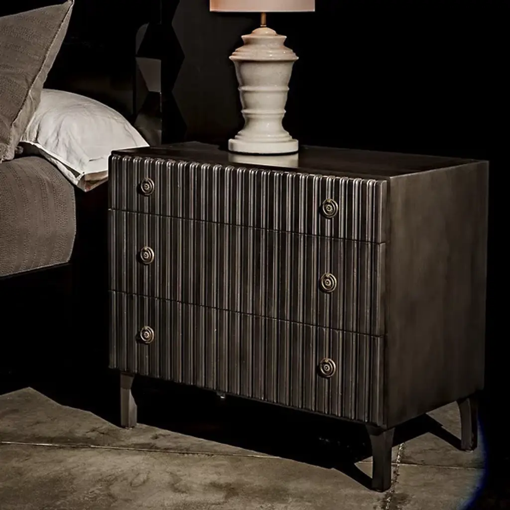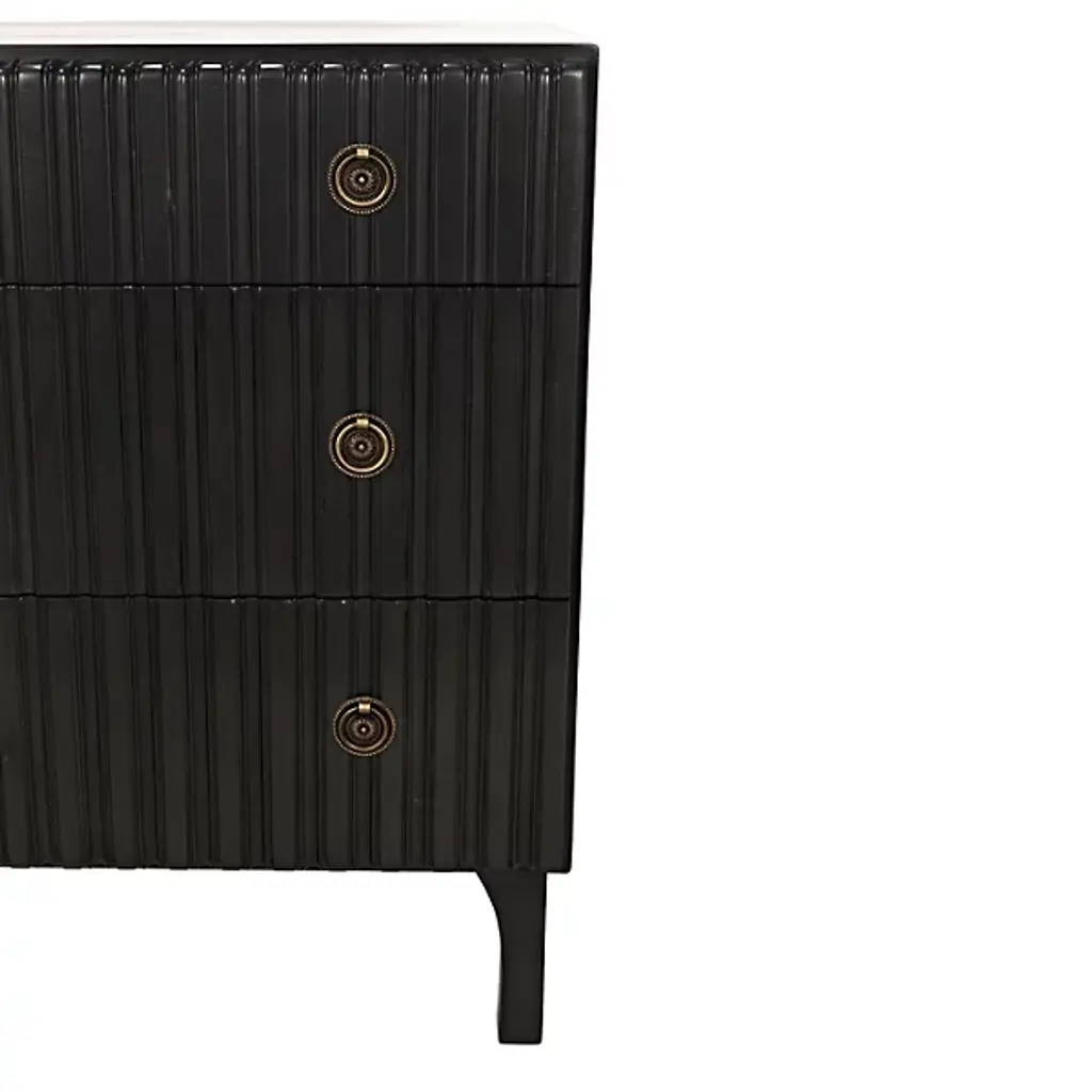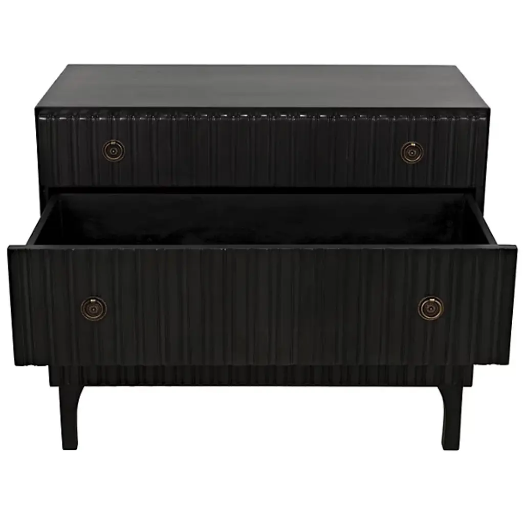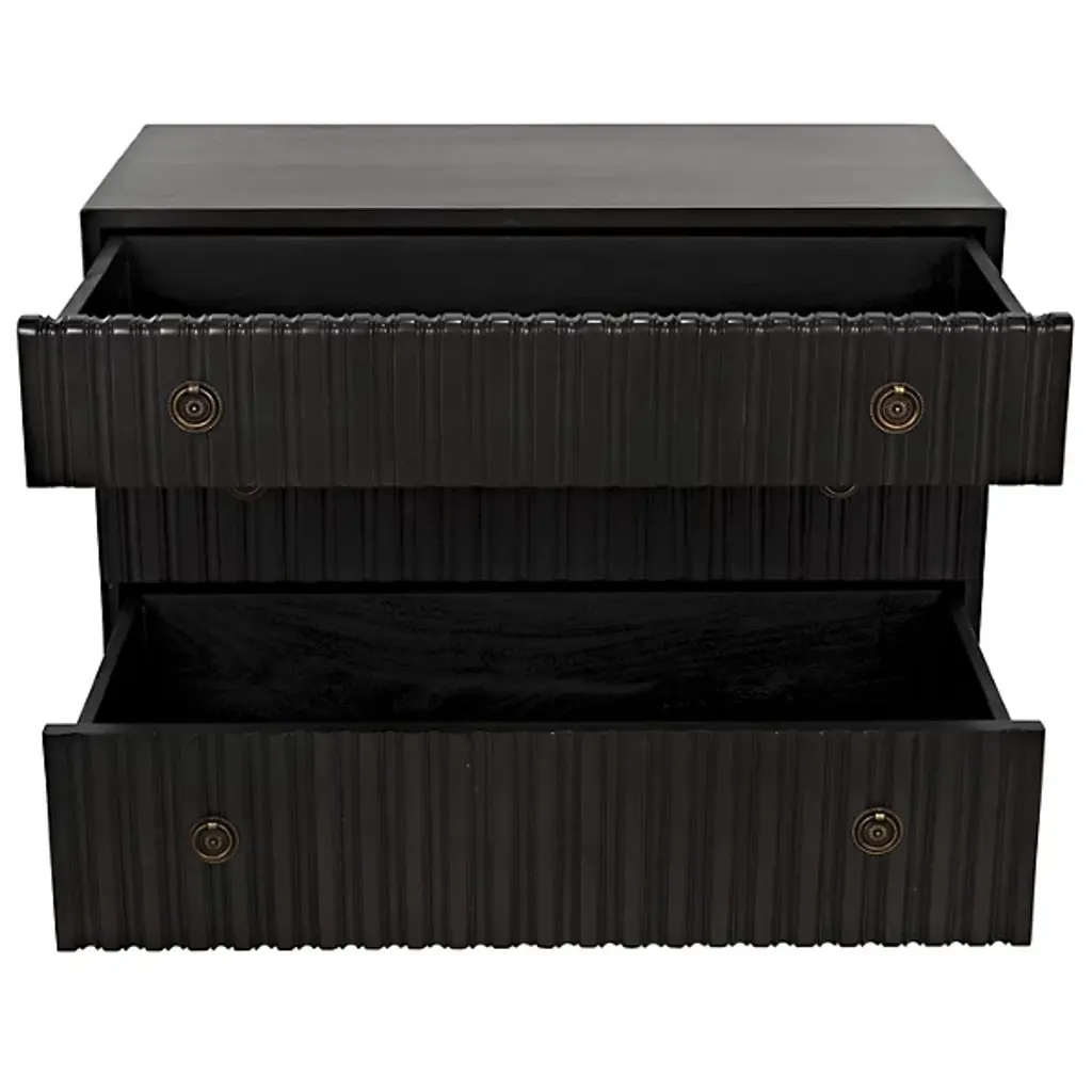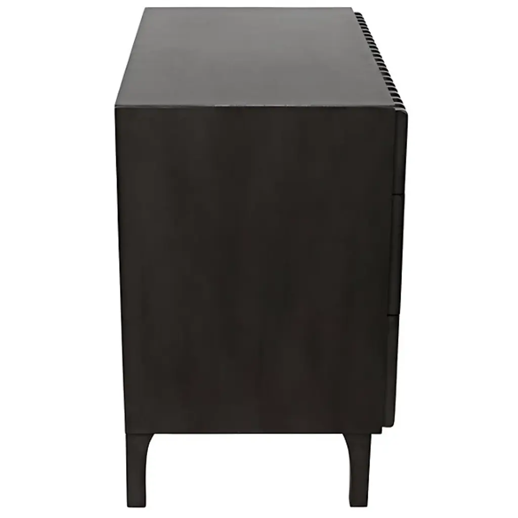 Decorate interiors while storing clothes with the unforgettable Daryl Dresser from Noir. At once simple and sculptural, this mahogany and veneer ensemble is elevated by four curve-contoured legs, creating a bit of air beneath the rectangular housing and holding three drawers stacked in a vertical column. The mahogany wood is relieved by vertical carving done by hand, adding a touch of industrial intricacy. Circular metal pulls offer smooth purchase and access, transforming its surroundings with an elegant appeal.