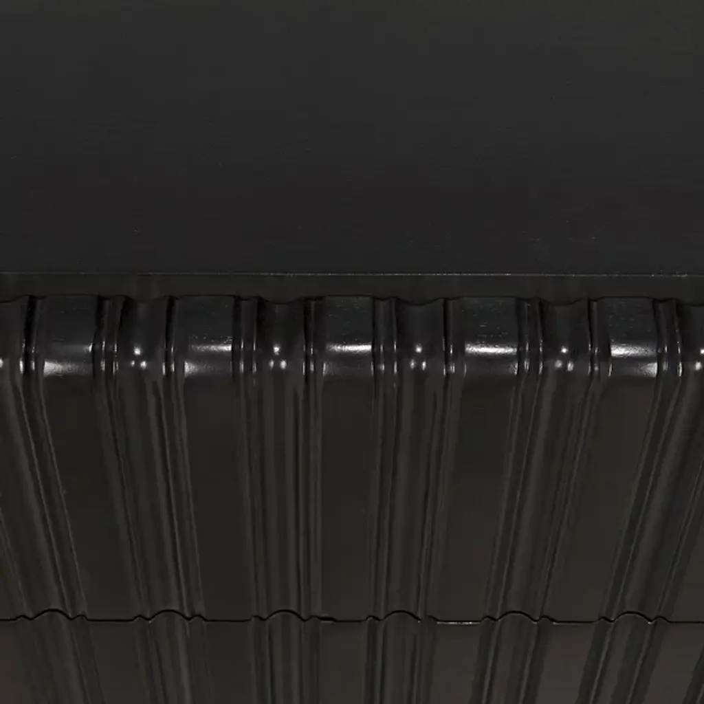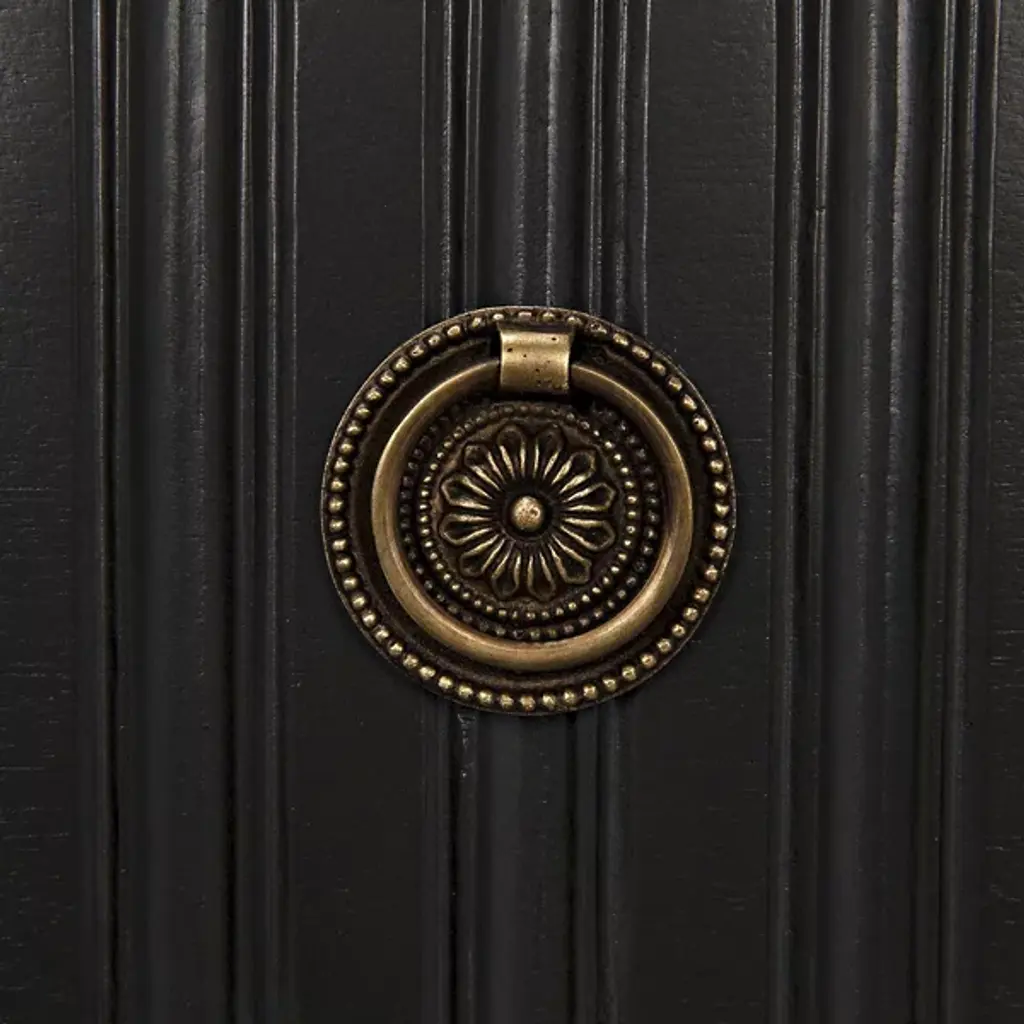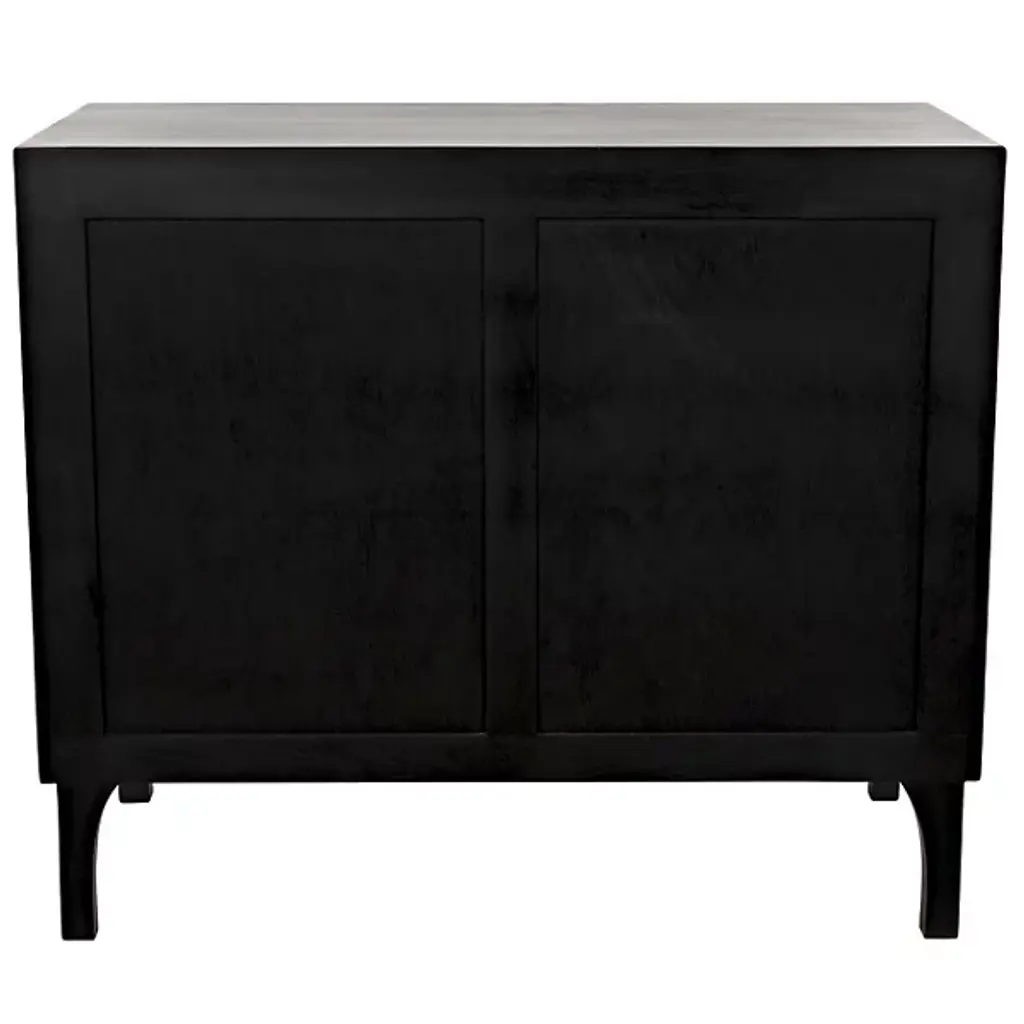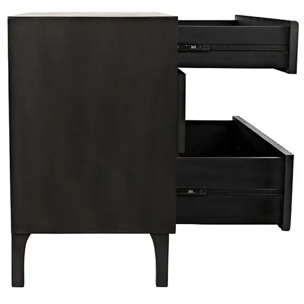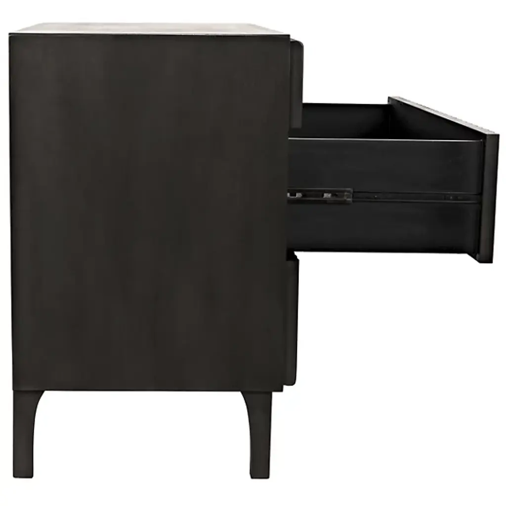 Decorate interiors while storing clothes with the unforgettable Daryl Dresser from Noir. At once simple and sculptural, this mahogany and veneer ensemble is elevated by four curve-contoured legs, creating a bit of air beneath the rectangular housing and holding three drawers stacked in a vertical column. The mahogany wood is relieved by vertical carving done by hand, adding a touch of industrial intricacy. Circular metal pulls offer smooth purchase and access, transforming its surroundings with an elegant appeal.