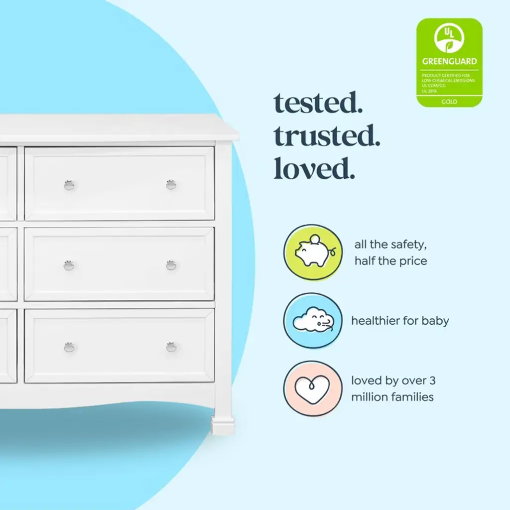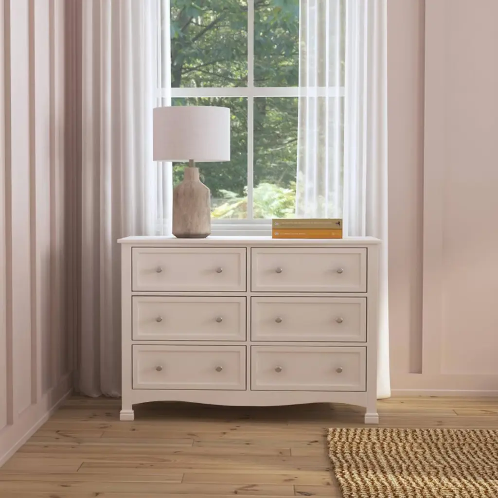 The Kalani 6-Drawer Dresser is the smart changing and storage solution for the classic Kalani, Emily and Fiona nursery collections. Six spacious drawers provide ample storage to organize all of baby’s necessities, while its thoughtful design ensures a style fit for any nursery or bedroom. The Kalani Double Dresser is detailed with recessed front drawer panels, a gently curved apron front and curved top sides.