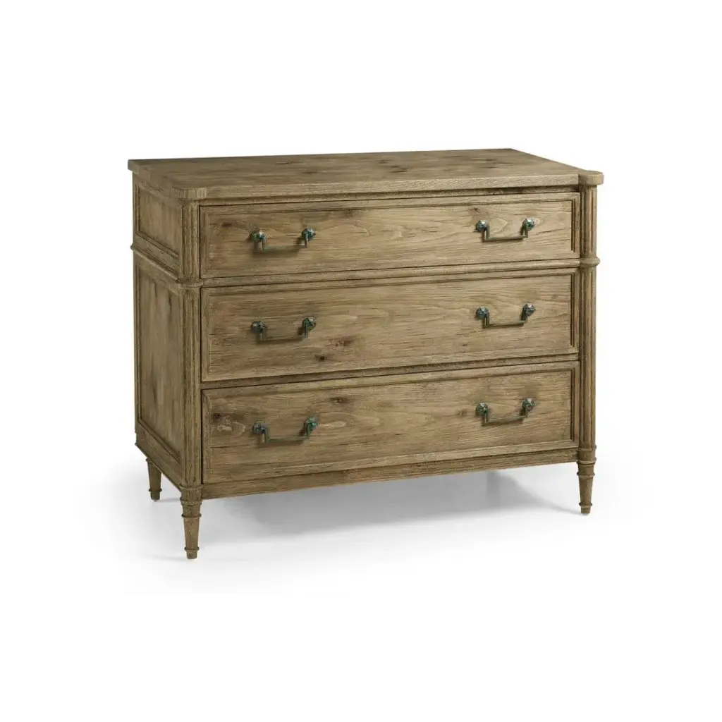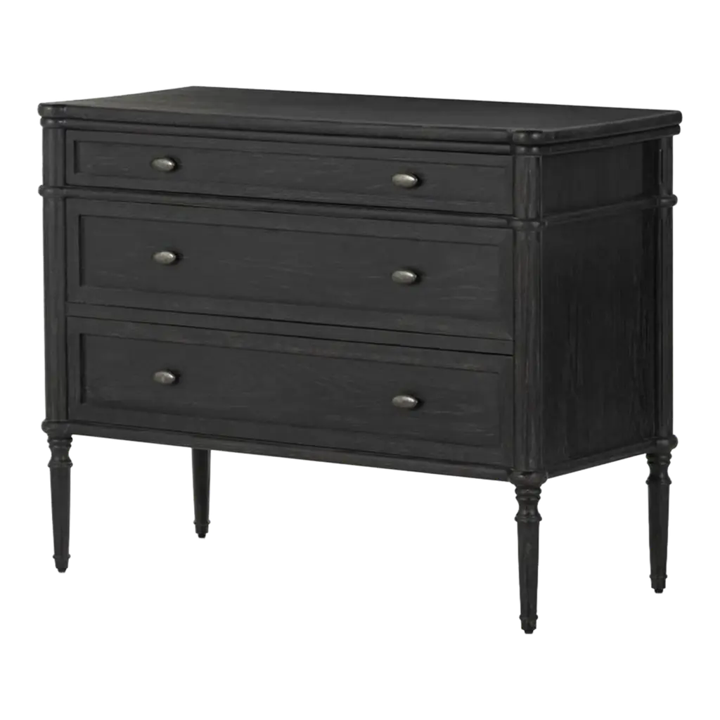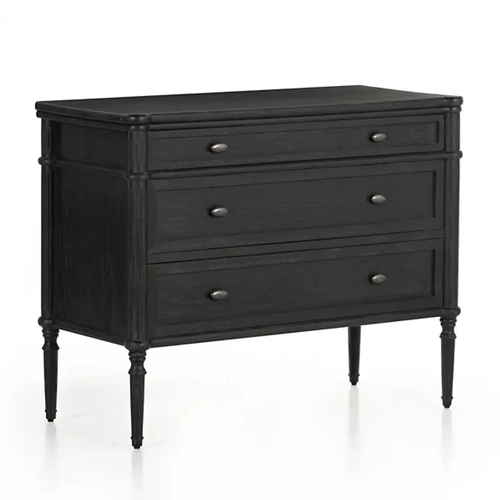 Traditional style meets modern appeal in this vintage European-inspired dresser. Turned legs and intricate detailing bring a timeless air to the oak-clad frame, with rounded pulls in antique brass to complete the look. We love the compact footprint of this 3-drawer dresser for a guest room, child's room, or small-space design.