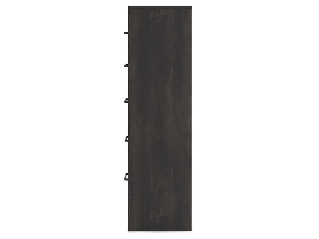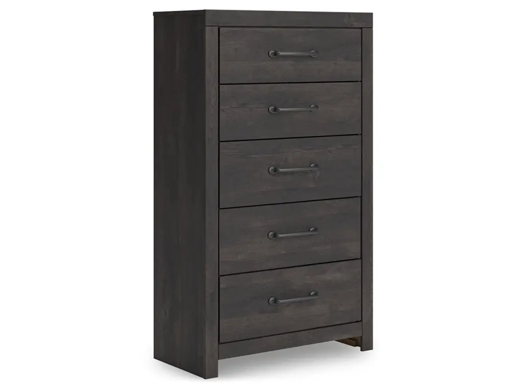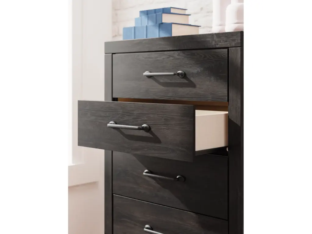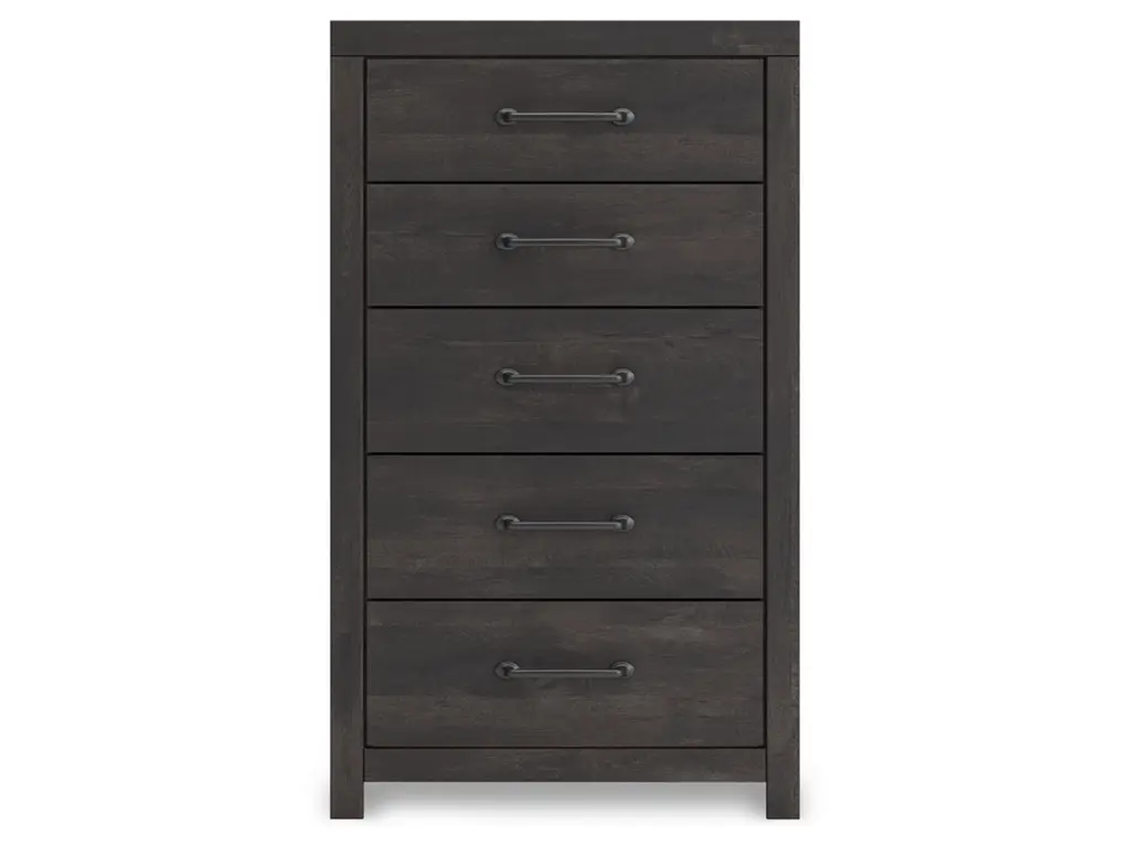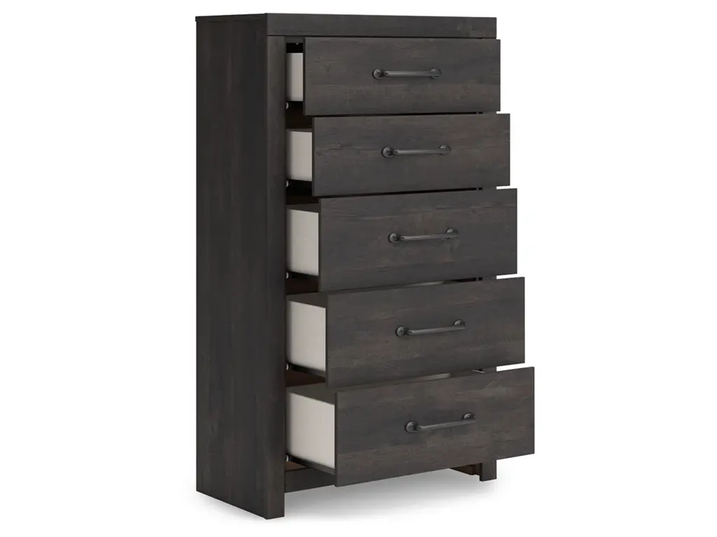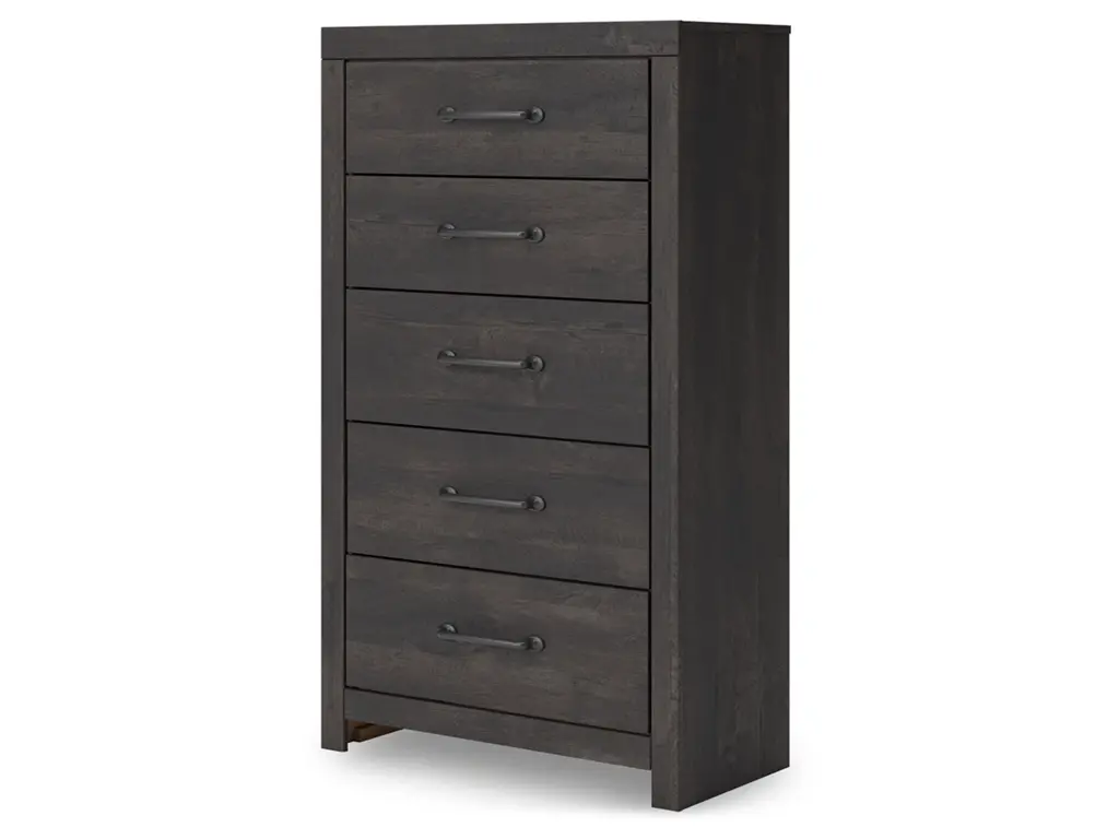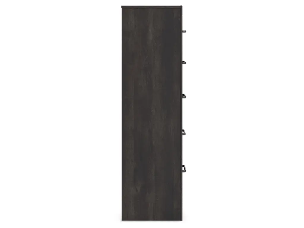 The Delmorta chest of drawers puts a casually chic twist on everyday function. Its rustic charcoal finish pairs well with other neutrals and pops of color alike, giving you the flexibility to change up your aesthetic as you please. Smooth-gliding drawers keep clothes and bed linens stored in style.