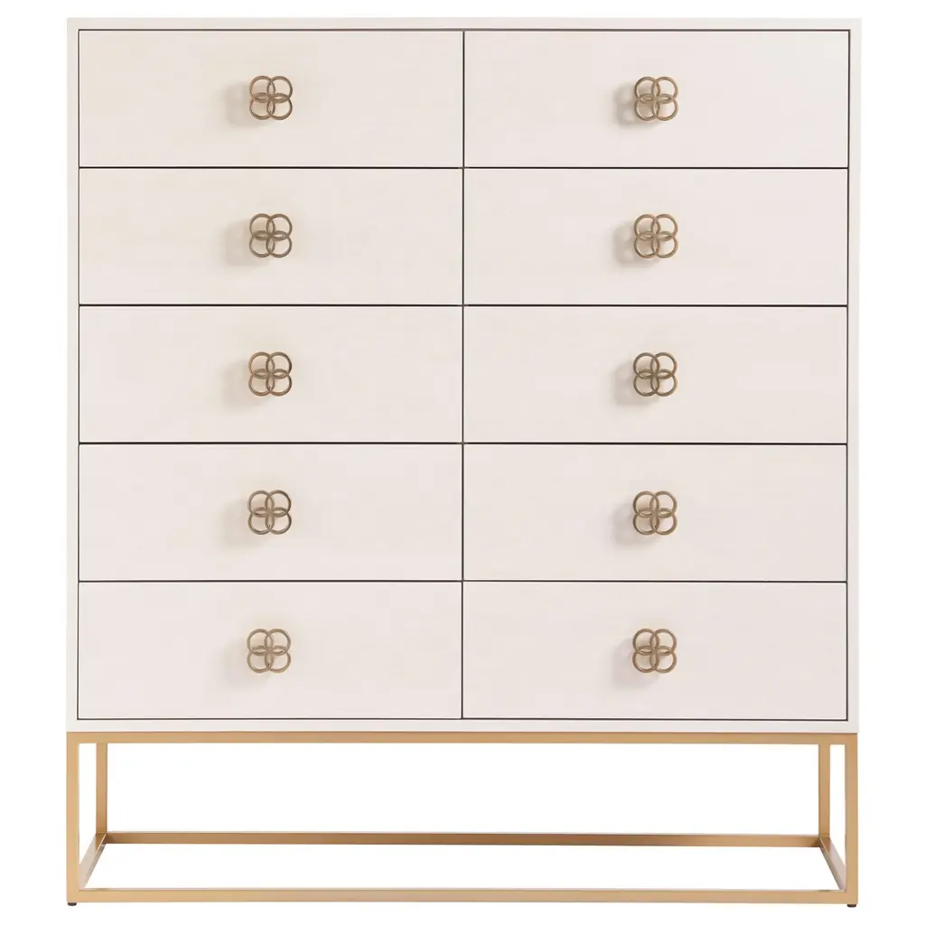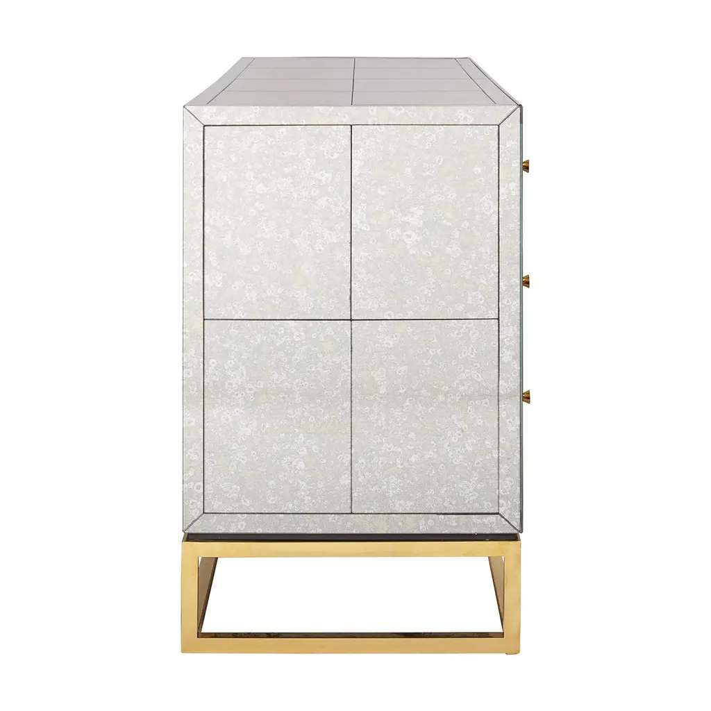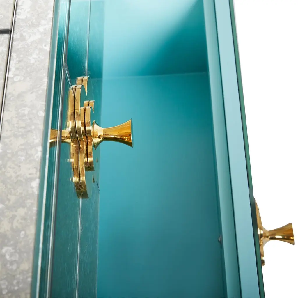 Reflectology. Minimalist forms meet Maximalist glamour. Our Delphine six-drawer dresser features antiqued mirror with a polished brass base and jewel-like quatrefoil escutcheons. Each drawer opens to reveal a bright robin's egg blue interior. Perfect in a starlet's sweeping entryway or as a bold finish for the modern boudoir.Specs:Antiqued mirror exterior with polished brass finish baseInterior finished in robin's egg blue lacquerSix drawers with clover pull in centerHandmade, hand painted.