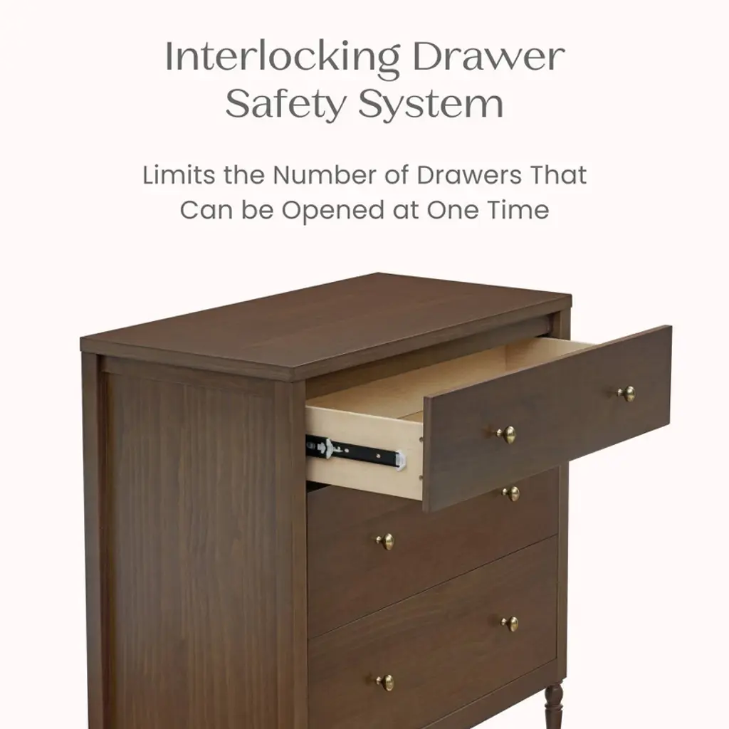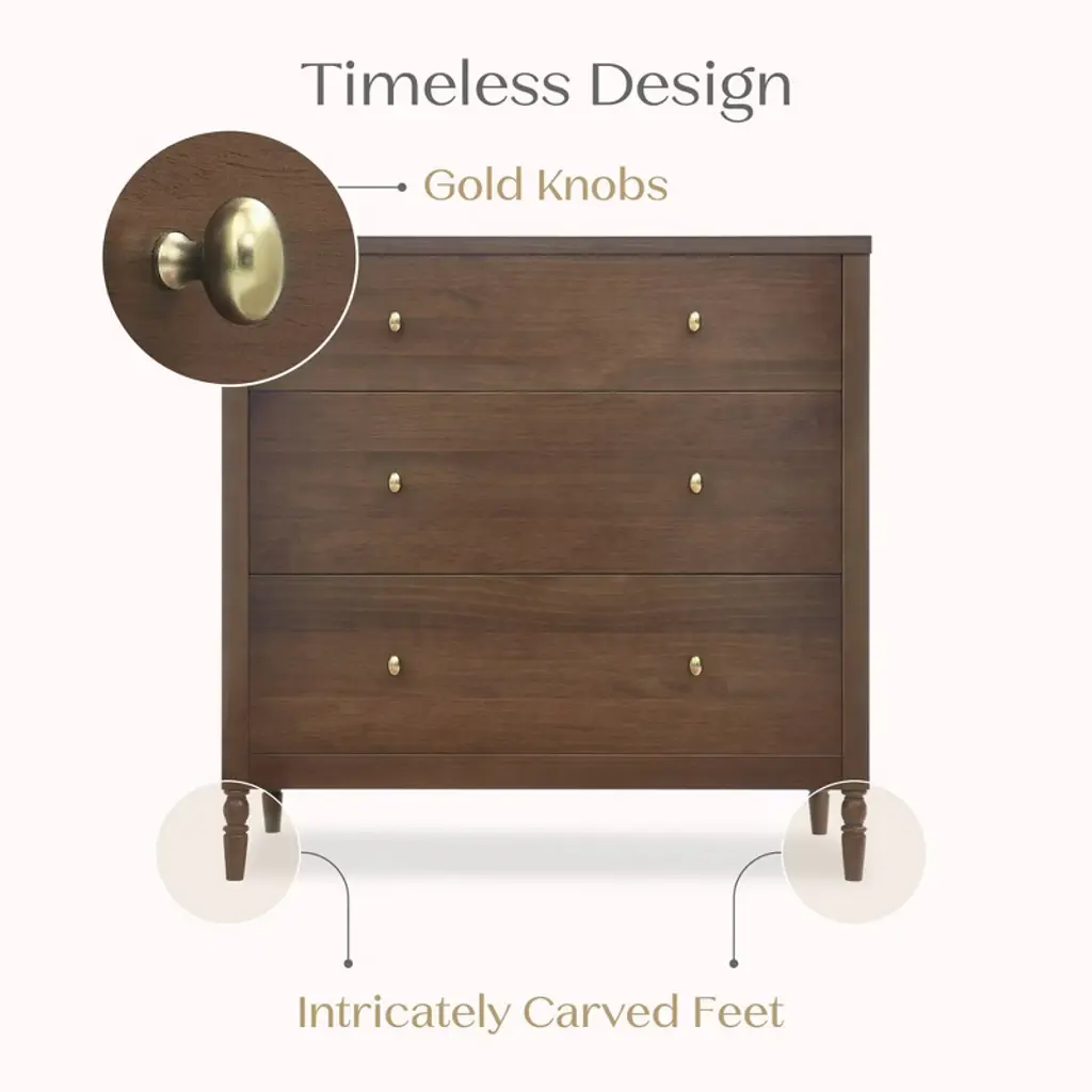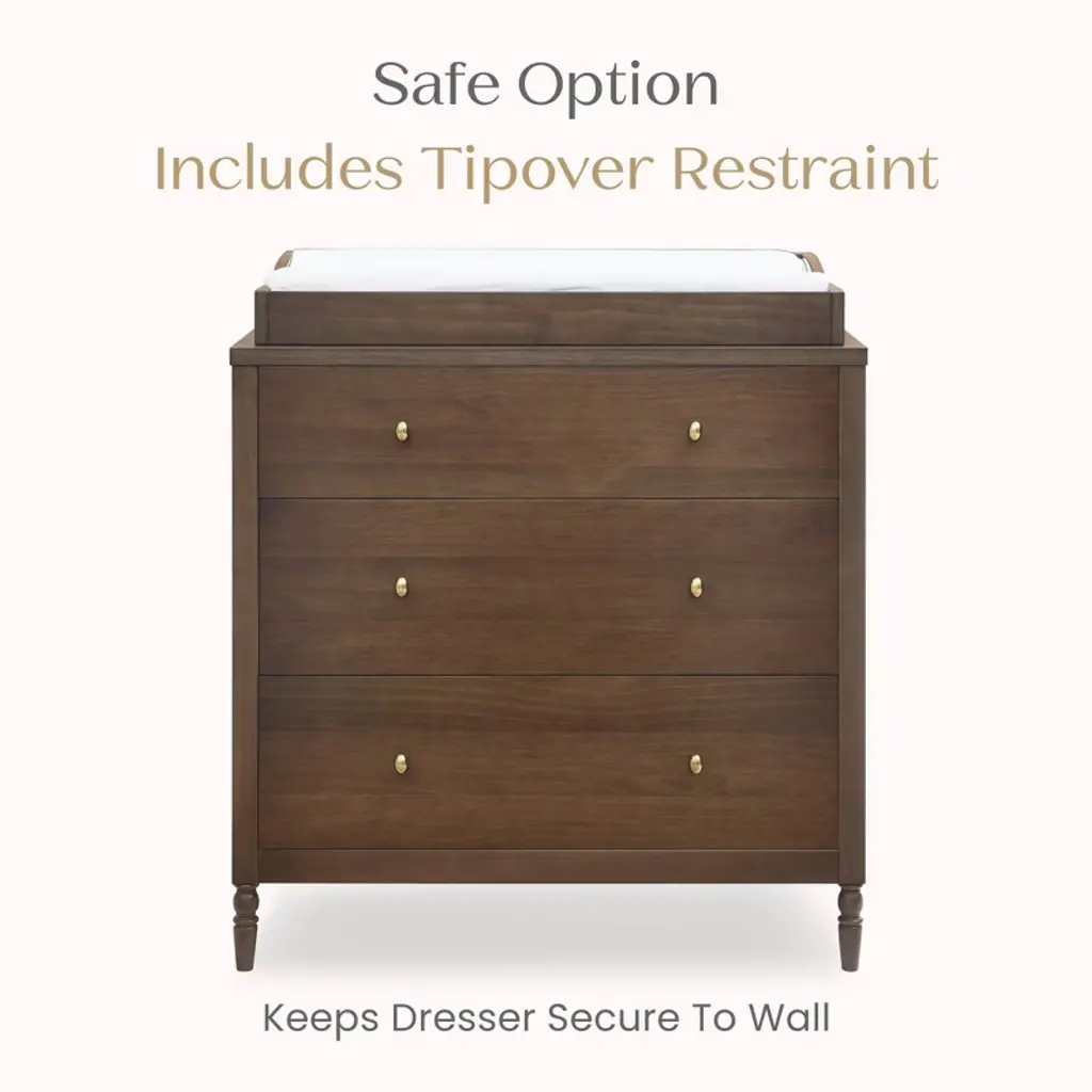 A showstopper in any space, the Serena 3 Drawer Dresser with Changing Top by Delta Children delivers timeless style with intricately carved feet and gold knobs. This spacious storage piece serves as a sturdy changing table too, with the included changing topper (changing pad sold separately). When your child grows, just remove the topper, it easily transitions into a stand-alone dresser. For your child’s safety, this dresser is outfitted with an interlocking drawer system that limits the number of drawers that can be opened at one time. Plus, it’s GREENGUARD Gold Certified, which means it’s built to contribute to cleaner air for a healthy home. Available in Natural Sandstone, Teak Brown and Bianca White. To complete the look, pair this dresser with the coordinating Serena 4-in-1 Convertible Crib.This dresser is tested to meet the current requirements of ASTM F2057, the mandatory CPSC safety standard that protects young children from furniture tip-over incidents. For your children’s safety, only purchase dressers that comply with this standard. For additional security, Delta strongly recommends that all dressers in your home be anchored; all Delta dressers include a wall anchor. To learn how to properly secure your dresser, please see the product assembly instructions or visit our website.
