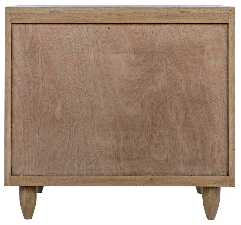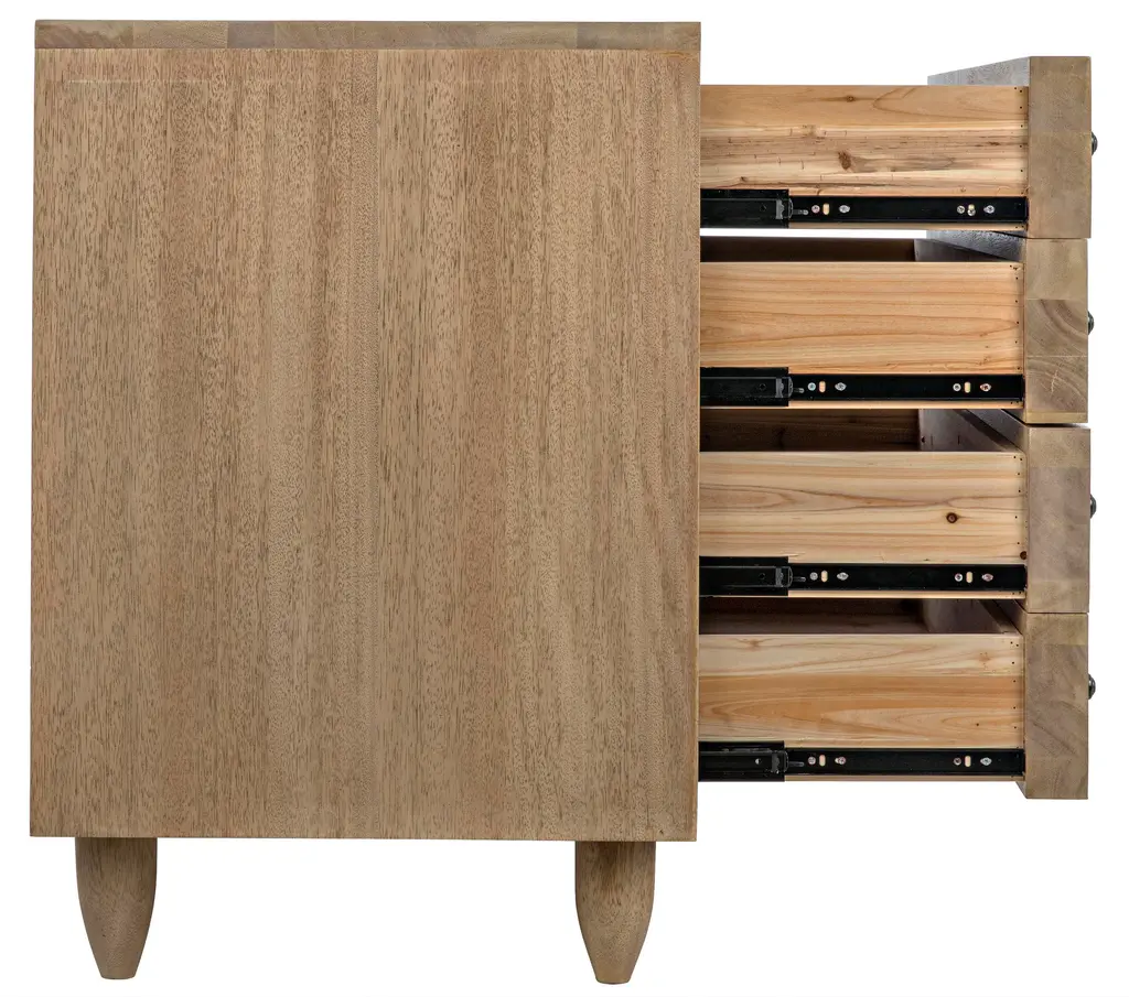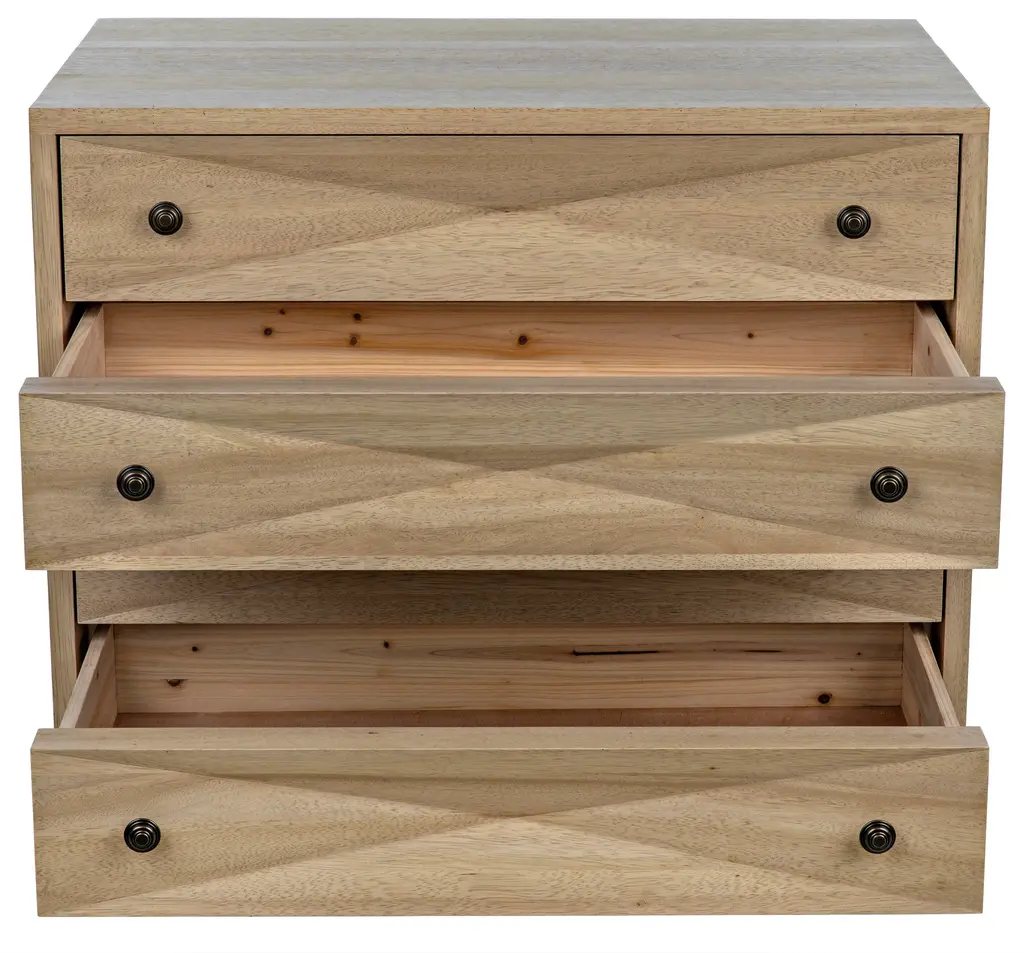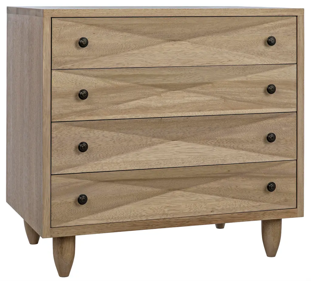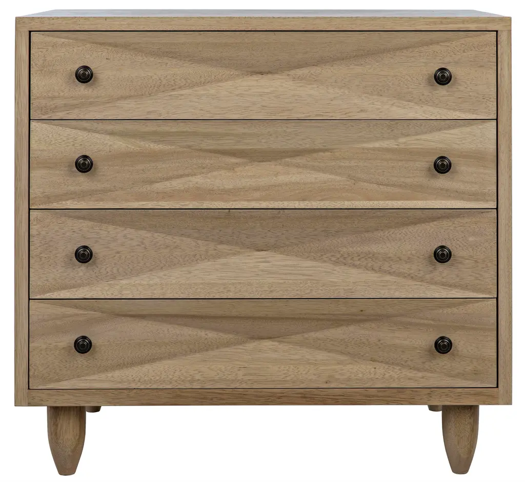 A straightforward walnut chest is elevated with the addition of multiple large diamond-shaped carvings. The elaborate carvings take center stage here, and we keep the rest simple, with metal pulls, peg legs and a washed walnut finish.