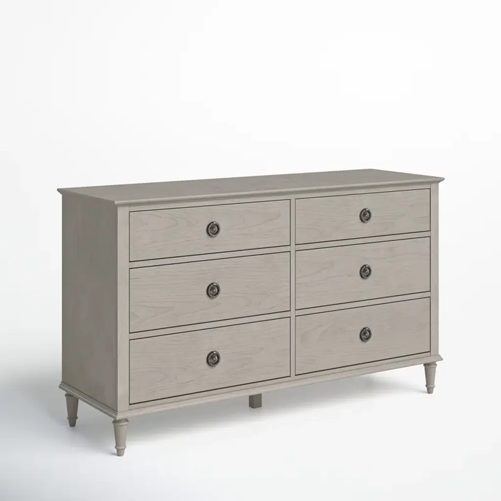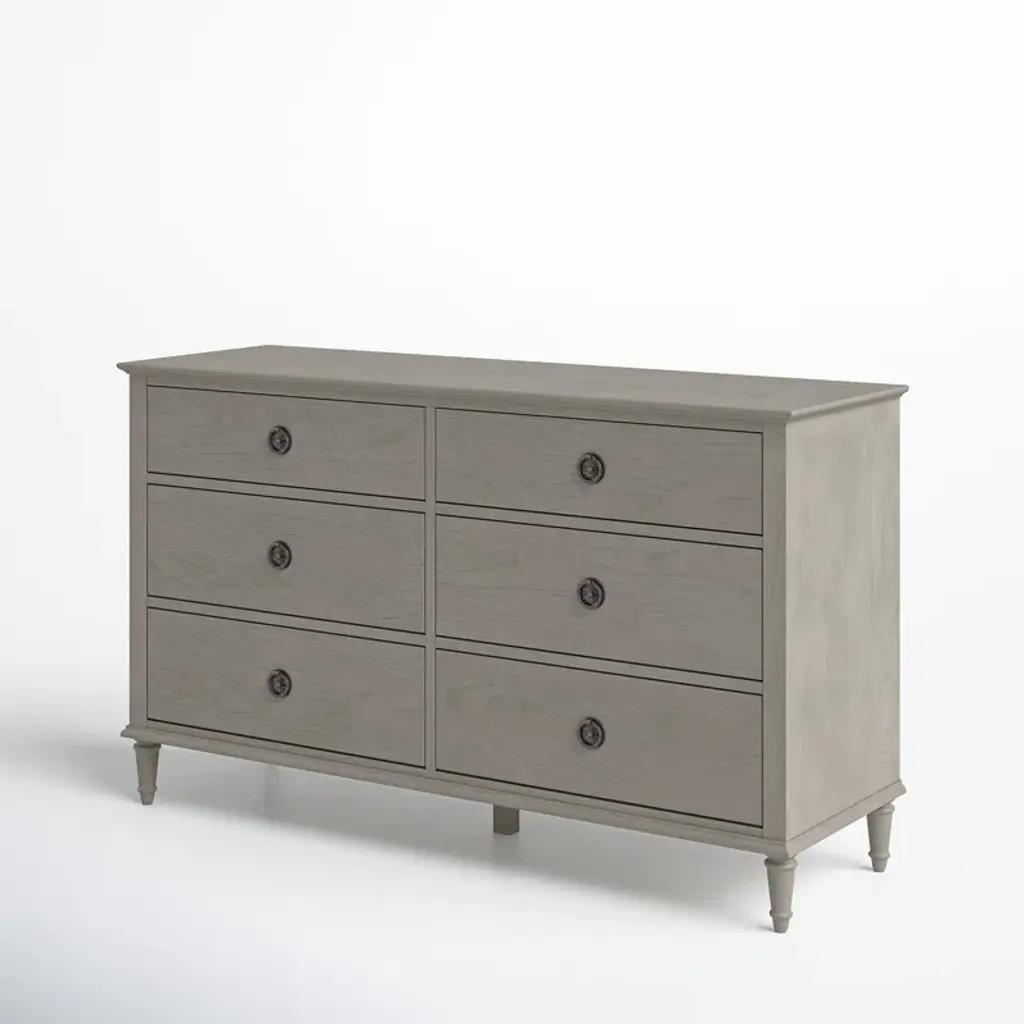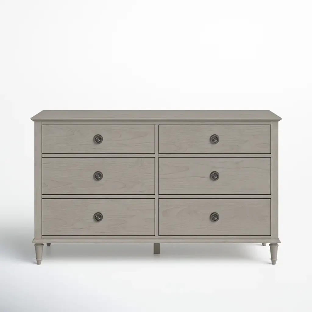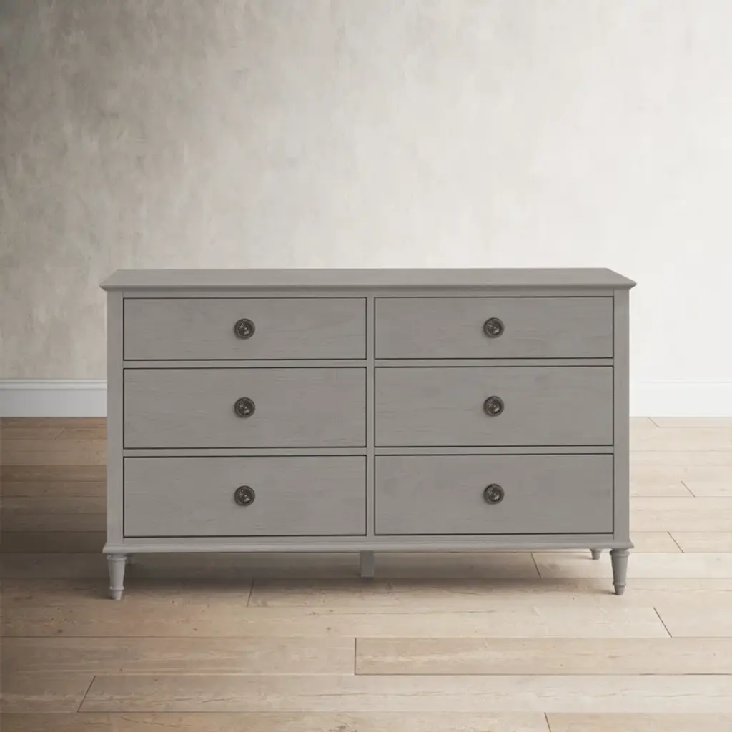 The Dinora 6 Drawer Dresser is crafted from solid wood with a gray finish and showcases a clean-lined silhouette. The concealed handle and the detailed feet contribute to the French Contemporary style. This dresser arrives fully assembled and features 6 drawers of various sizes providing ample room to store all your bedroom necessities.