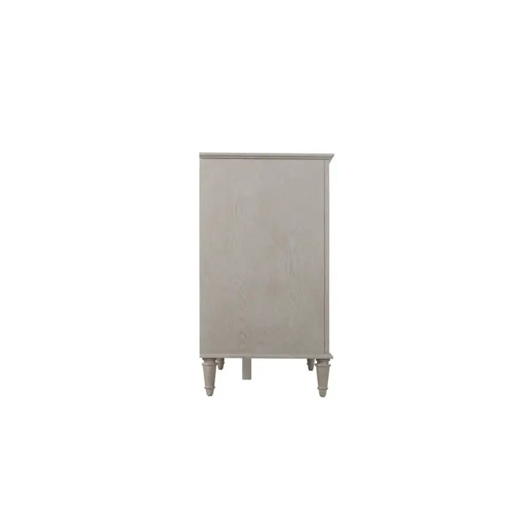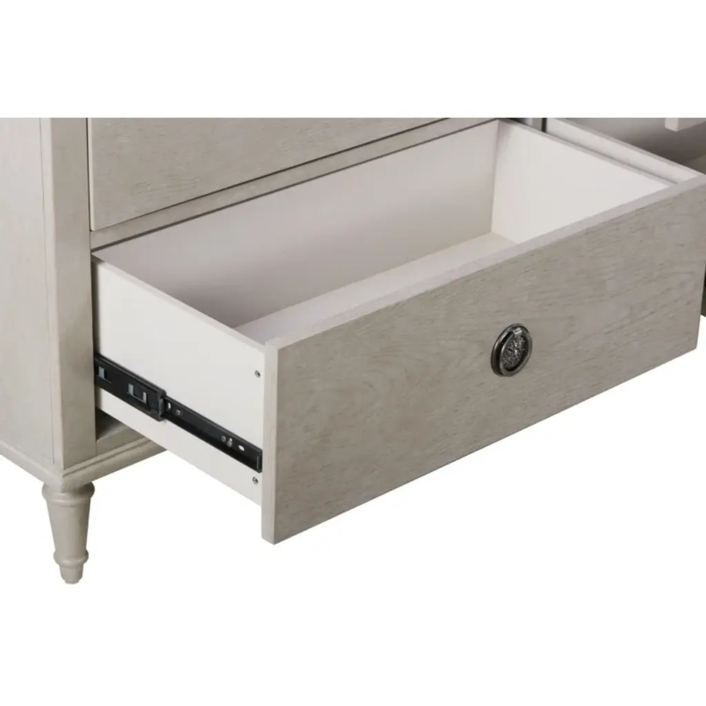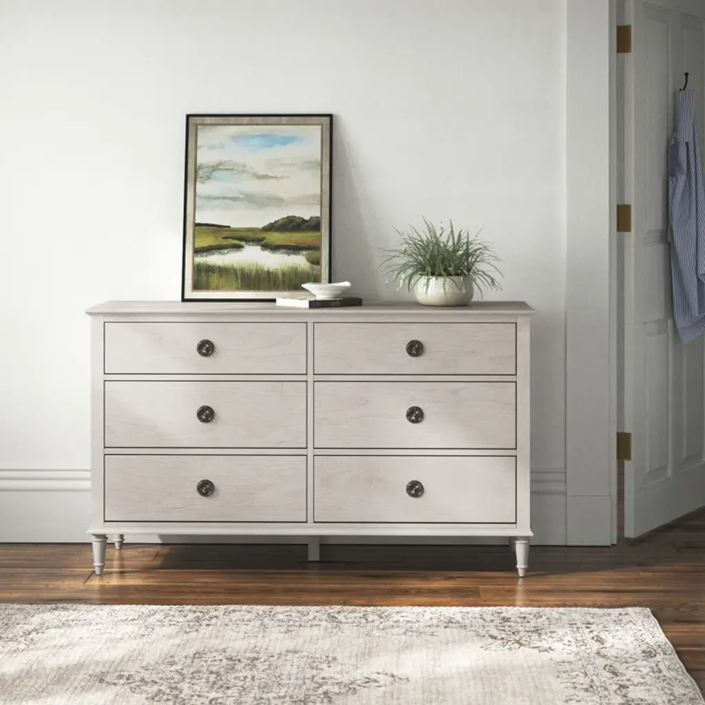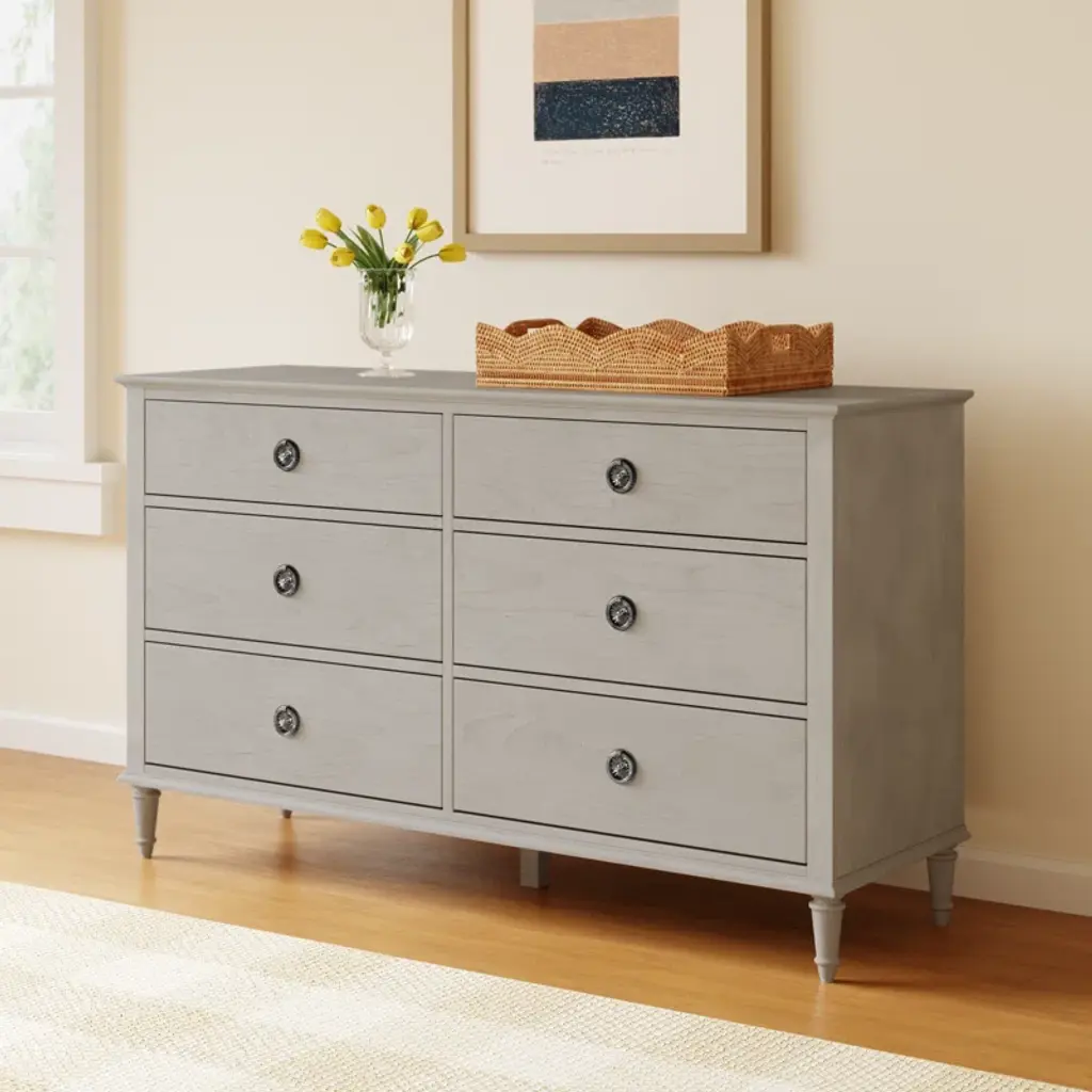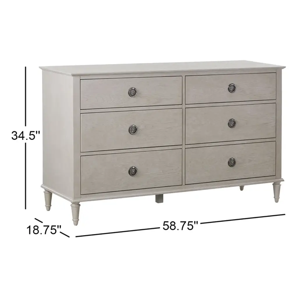 The Dinora 6 Drawer Dresser is crafted from solid wood with a gray finish and showcases a clean-lined silhouette. The concealed handle and the detailed feet contribute to the French Contemporary style. This dresser arrives fully assembled and features 6 drawers of various sizes providing ample room to store all your bedroom necessities.