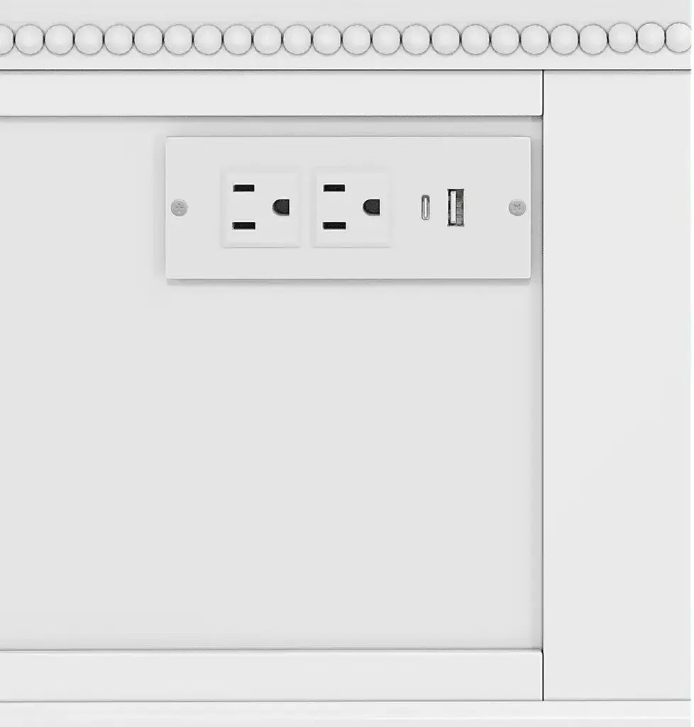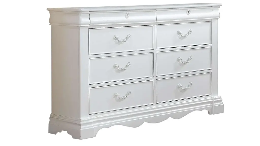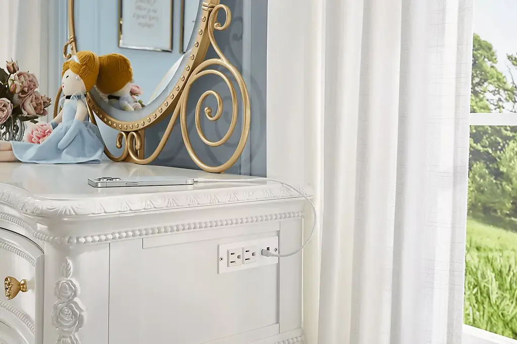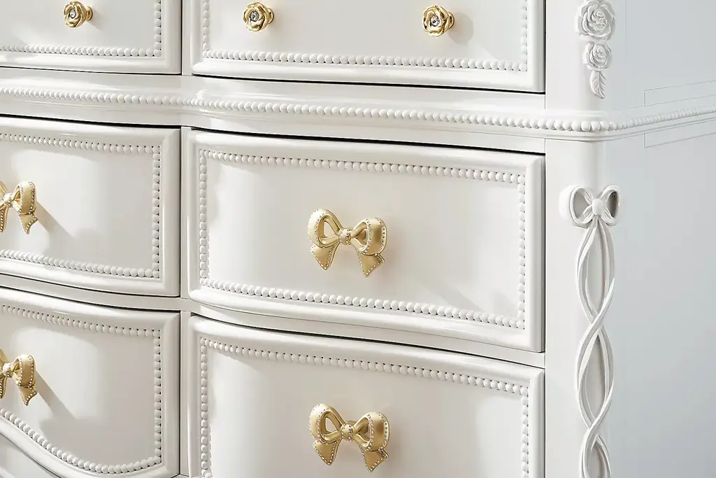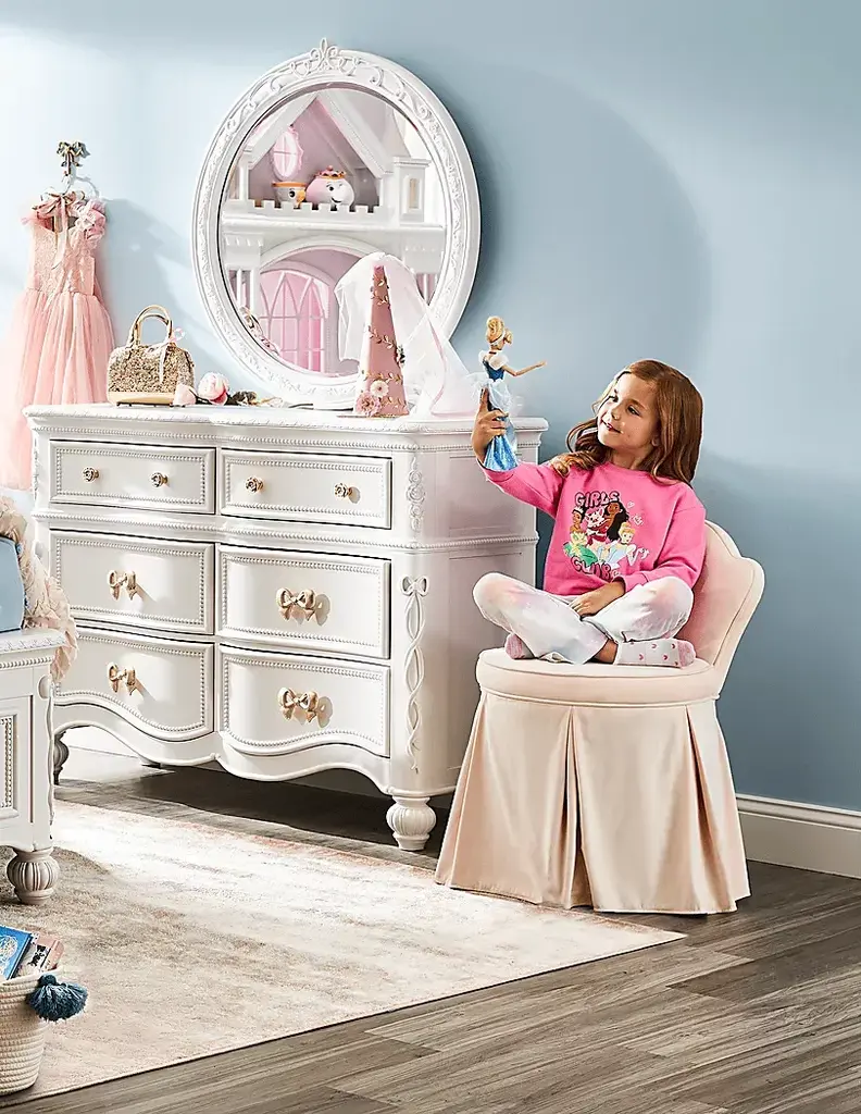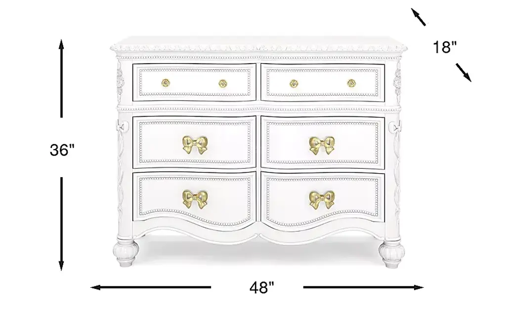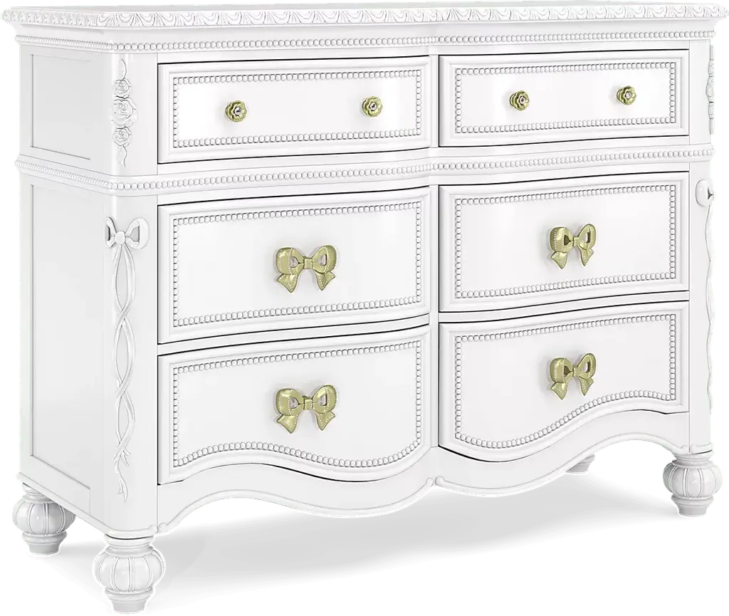 Create a fairytale escape for your little royal with the Disney Princess collection, where every night feels like a bedtime ball and every morning begins a brand-new adventure. With six spacious drawers and a gently curved silhouette, this dresser offers a generous amount of storage for clothing, accessories and more. Sparkle white finish highlights the gold bow and rose drawer pulls, complete with faux crystal insets. Each drawer box is equipped with soft-close glides and features French dovetail fronts and English dovetailing in back for ease of use and enhanced durability. Pink felt-lined top drawers and built-in power outlets are just two more exciting features that blend everyday convenience with princess-worthy charm.