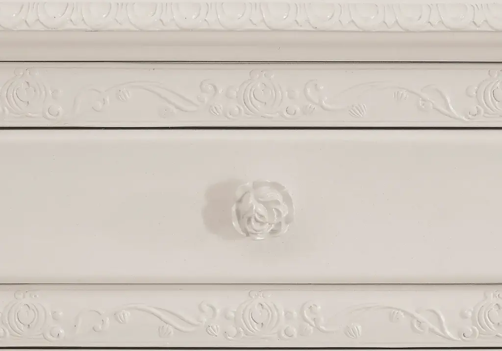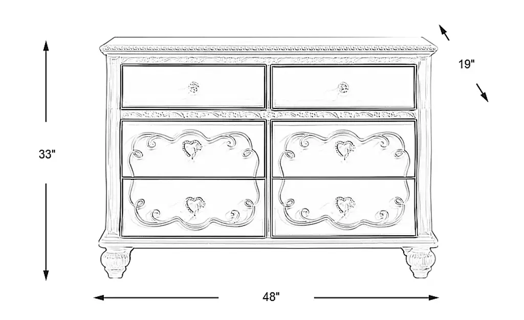Store her gowns and other clothing in the gorgeous Disney Princess dresser. This wonderful piece is crafted of wood solids and birch veneers complete with a sparkling white finish befitting royalty. A swirling ribbon design and acrylic crystal heart-shaped pulls on the bottom four drawers adds an elegant flair to this dresser while the rose-shaped pulls of the top two drawers add a classic flair to coordinate with other aspects of this collection. A stunning crystalline bead inlay with pumpkin carriages is the perfect finishing touch to this magical dresser.