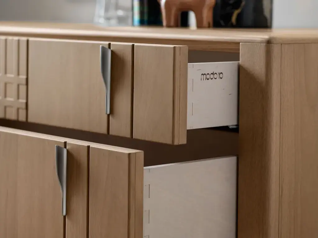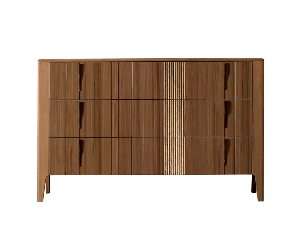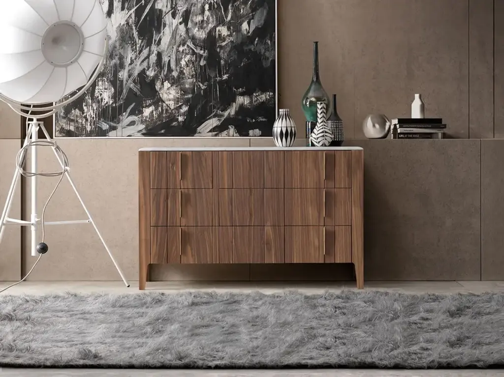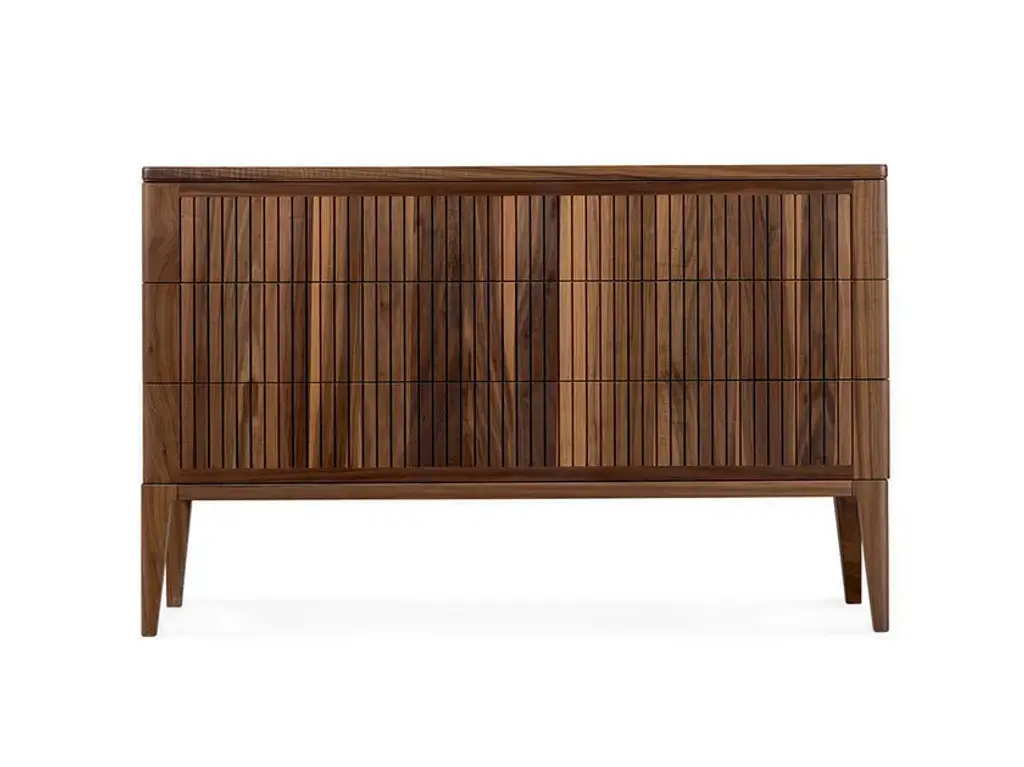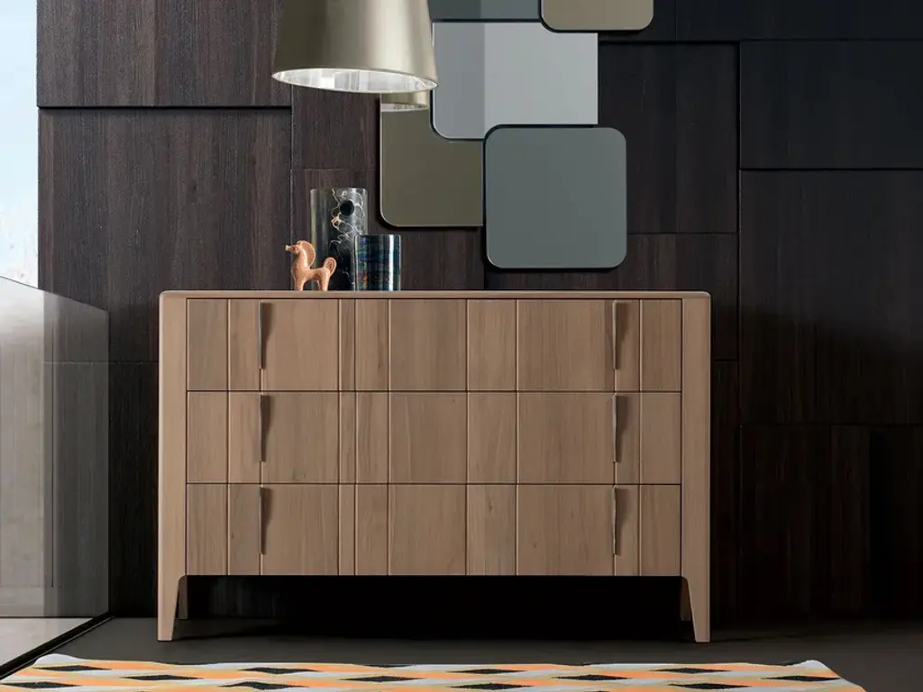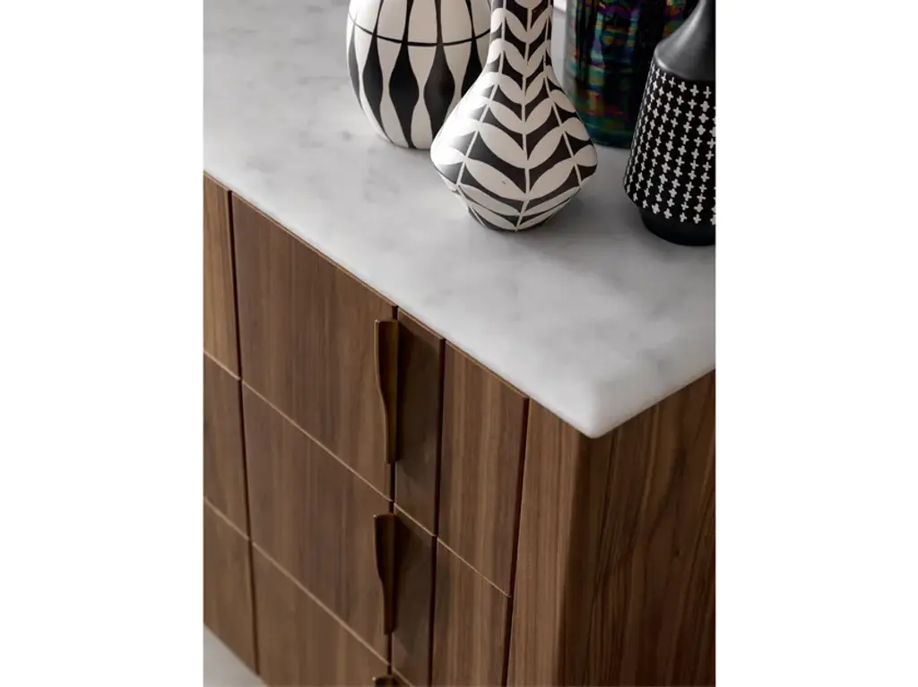 Wooden chest of drawers from the DOMINO collection. Dresser with 3 drawers, smooth wooden slat, metal handle. Havana Canaletto finish, Bronze metal.13 finishes available, marble top, 3 metal finishes.