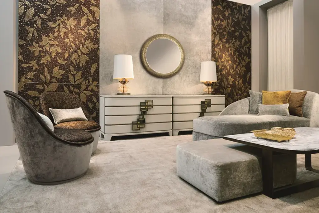 The metal profiles and the rich handles decorated with minute mosaic and glass embellish the linearity of the design of this pleasant and sophisticated chest of drawers.Exterior covered in nubuck. Inside drawers in microfibre. Handles with coated or polished chrome finish, minute mosaic decoration, and Colibrì glass. Decorative profiles on drawers, sides, and base with coated finish.