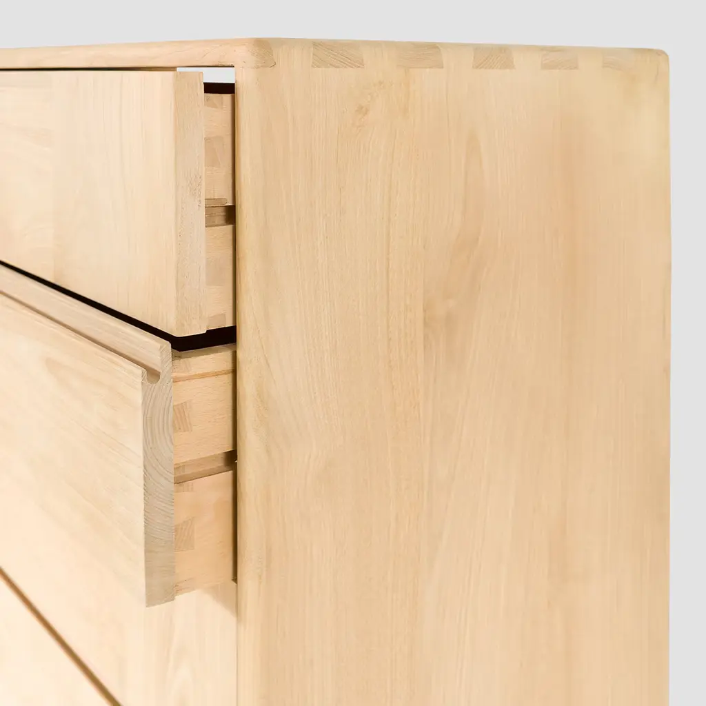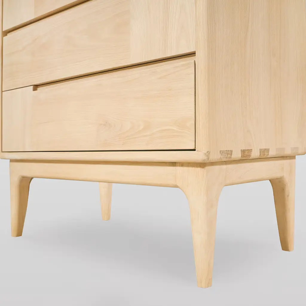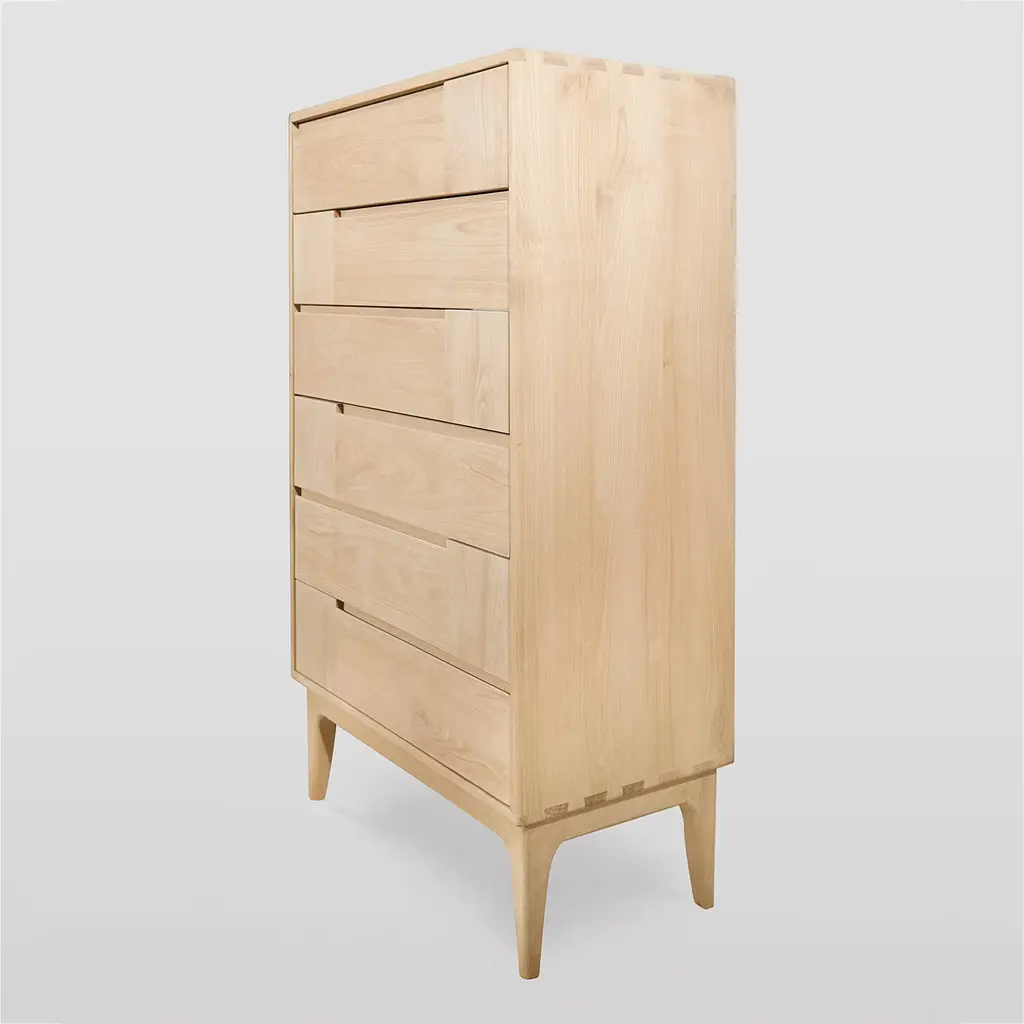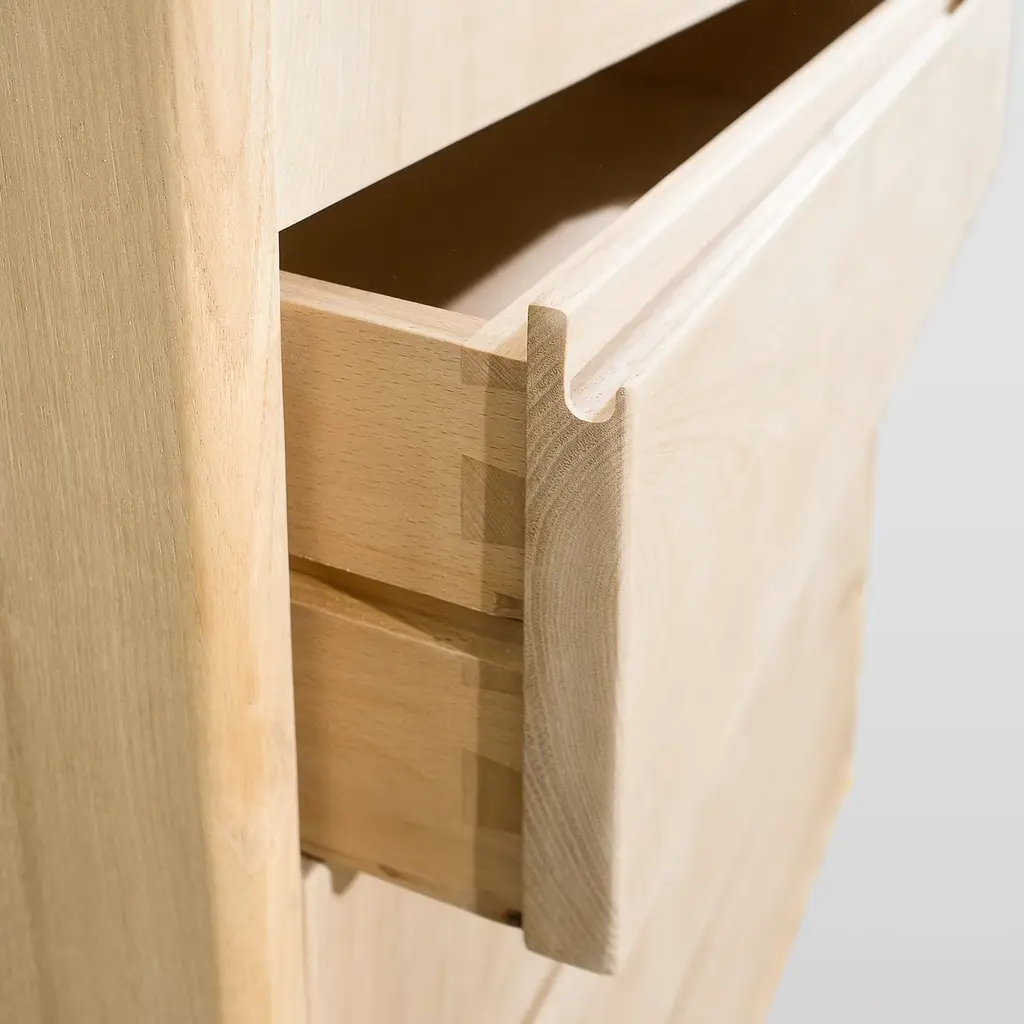A clean and sophisticated design, this Scandinavian-style dresser will be a sleek accent piece for a contemporary interior space. Handcrafted of solid chestnut, it features six drawers boasting horizontal and vertical lines, creating a practical groove that functions as a handle. Internally fashioned of solid beechwood, it rests on short and slender feet. Polished with water-based lacquers and beeswax, it is customizable upon request to the Concierge.