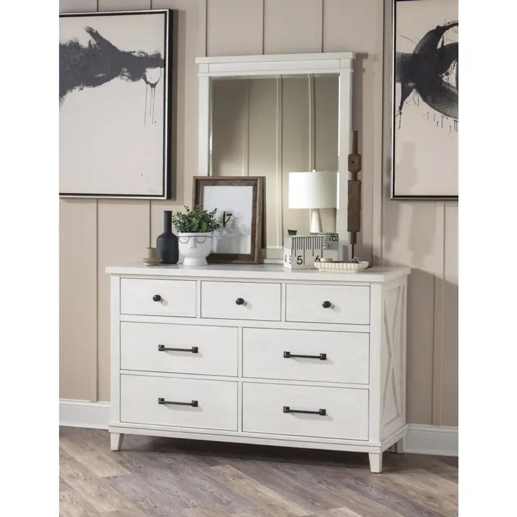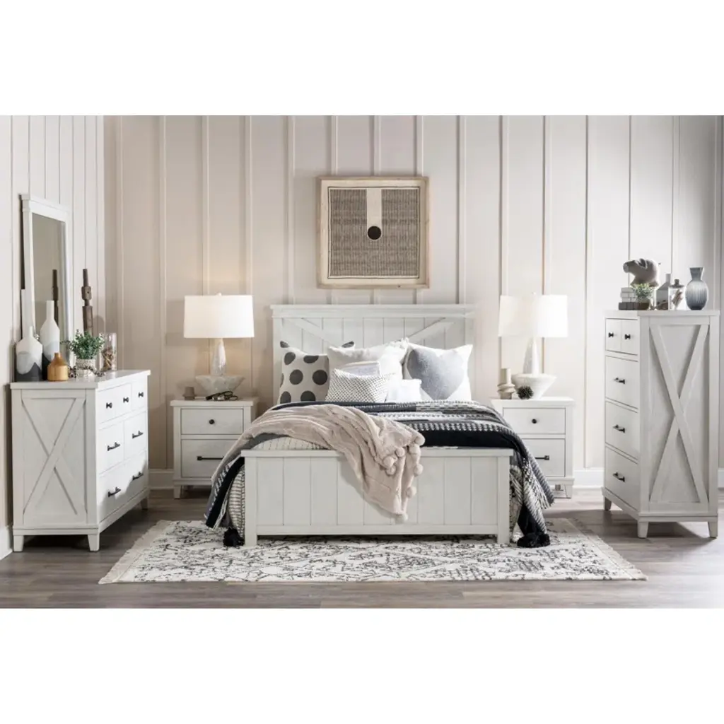 Rustic, comfortable, yet modern. Clean lines combine with natural textures to create the Angeliana youth collection. Modern farmhouse designs such as block feet, flat drawer fronts, and X motifs on side panels offer a lot of details without feeling cluttered. The natural variations of the grain and Aged White finish offer a casual, livable style. Simple Flat Black finished bar pull and knob hardware completes each piece.