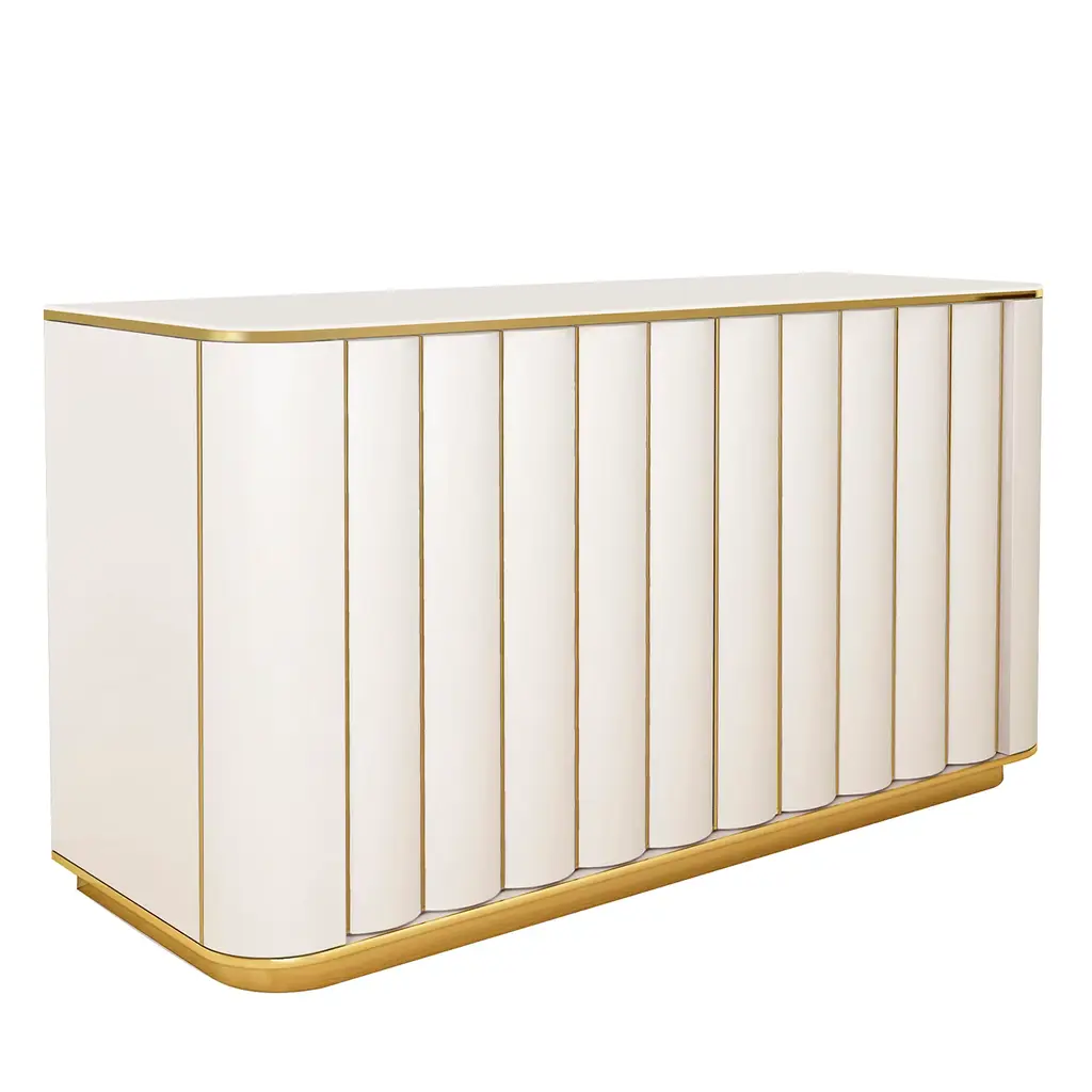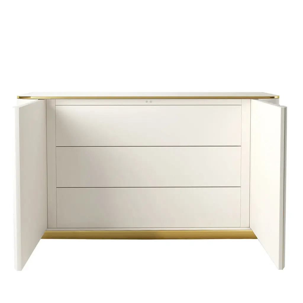 Designed by Isabella Costantini and beautifully crafted by Italian artisans, the Duilio dresser features a ribbed body and two doors hiding three drawers. The surface is perfect for gathering family photographs or styling standout decor. Accessories and details: three eco-friendly leather lined drawers. Finish: Ivory matt lacquered and metal details in brass finish.