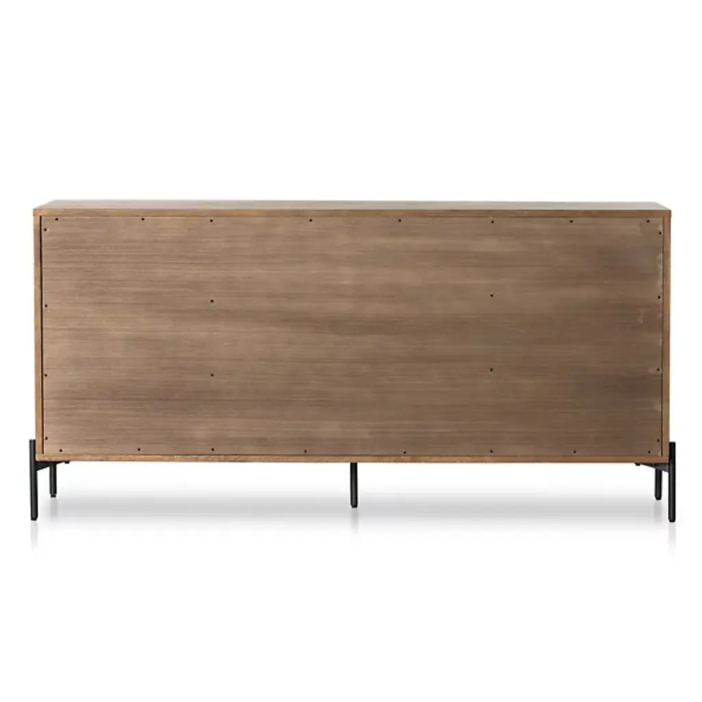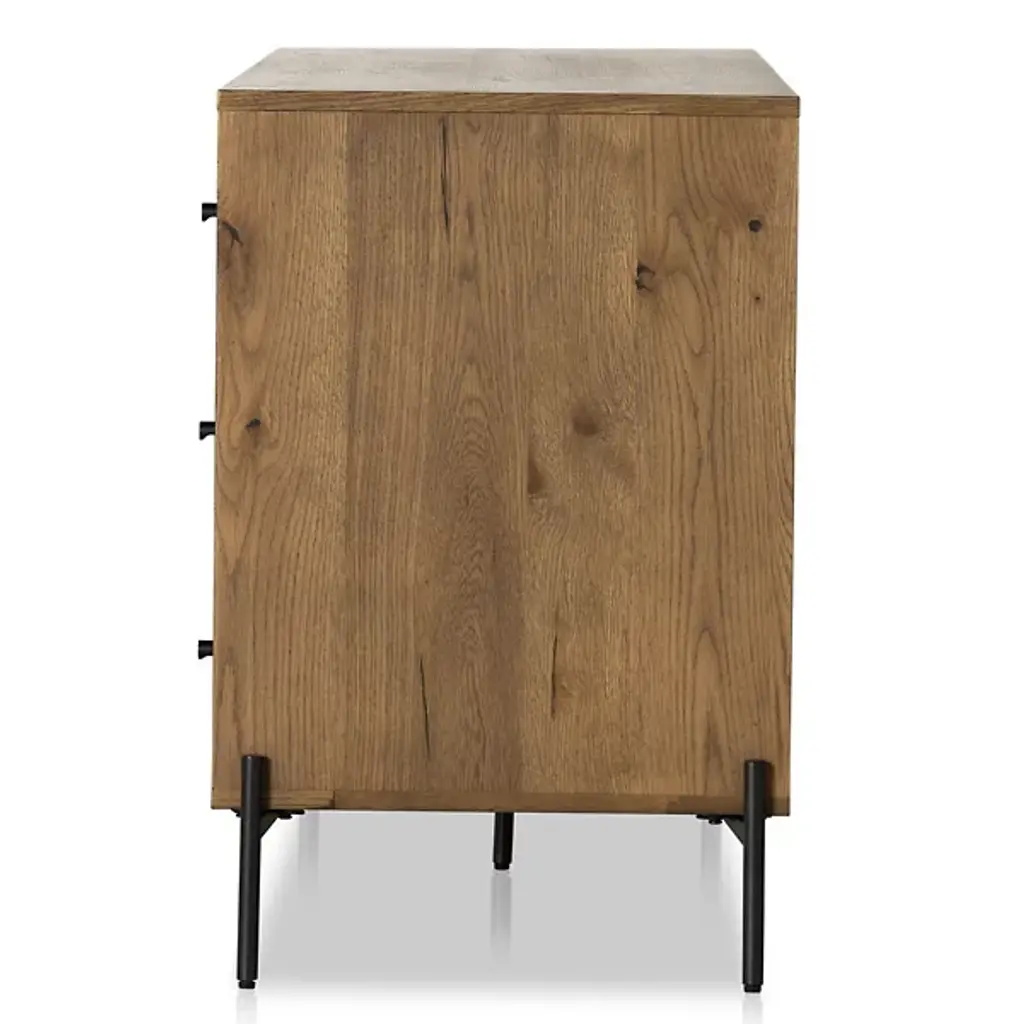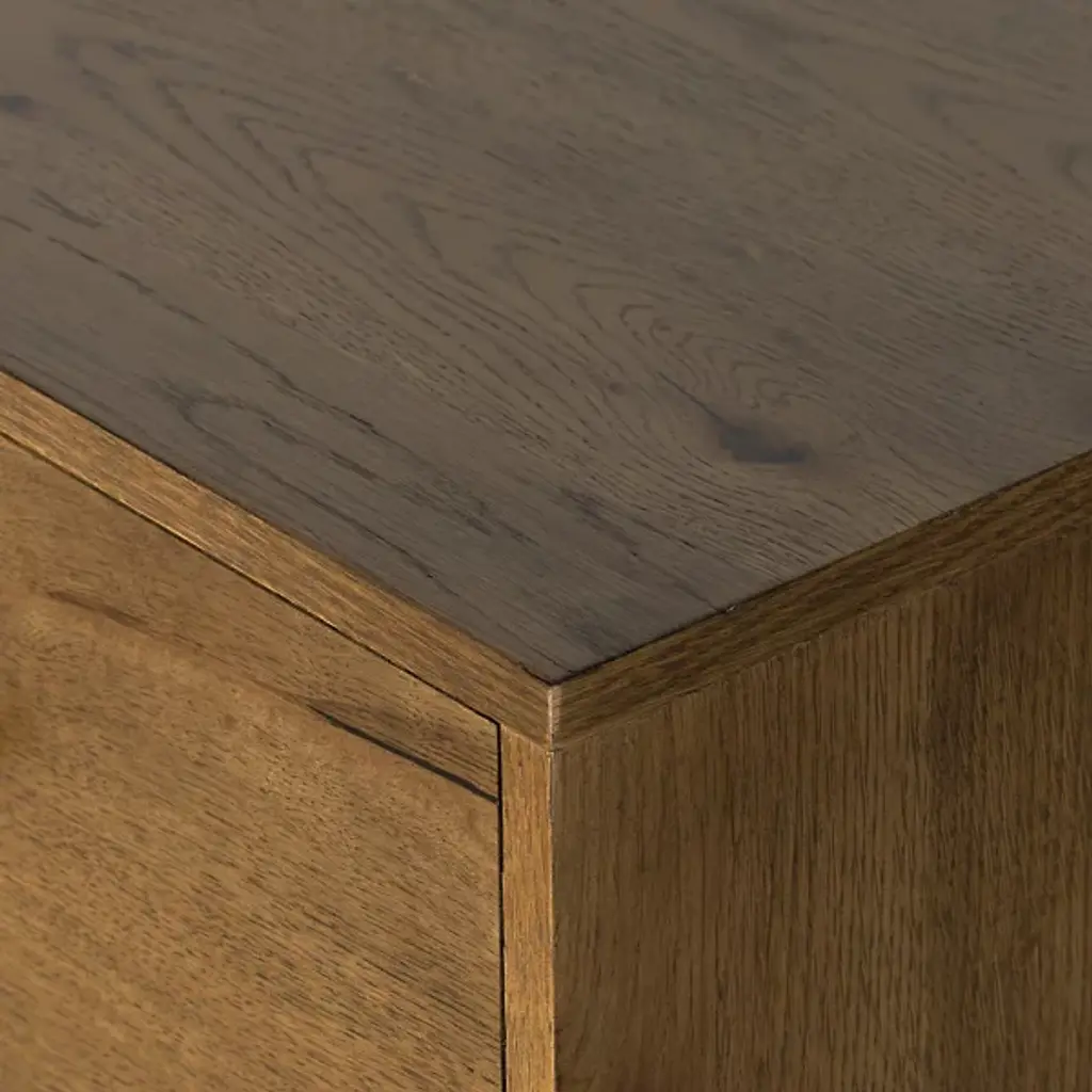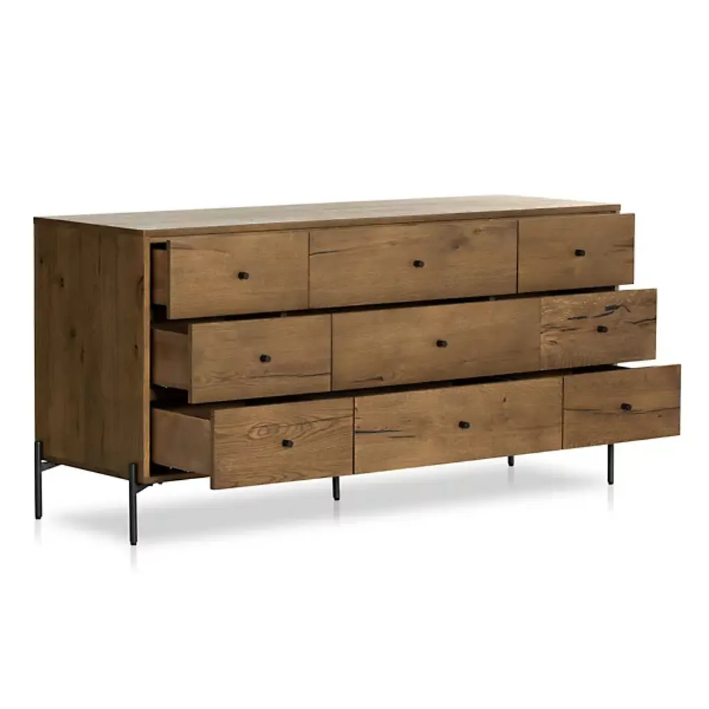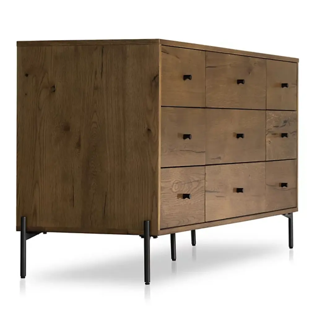 The Eaton 9 Drawer Dresser from Four Hands combines rustic charm with a transitional design, making it a versatile addition to any bedroom. Made from high-quality wood, it showcases a warm, natural finish, highlighting the grain's unique character. The dresser features spacious, soft-close drawers, ensuring quiet and effortless use. Its timeless silhouette and sturdy construction provide both style and functionality, perfect for those who appreciate enduring elegance in their home.