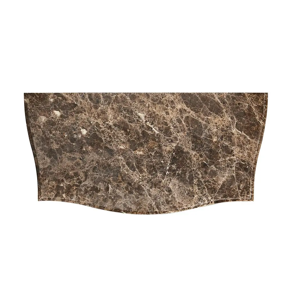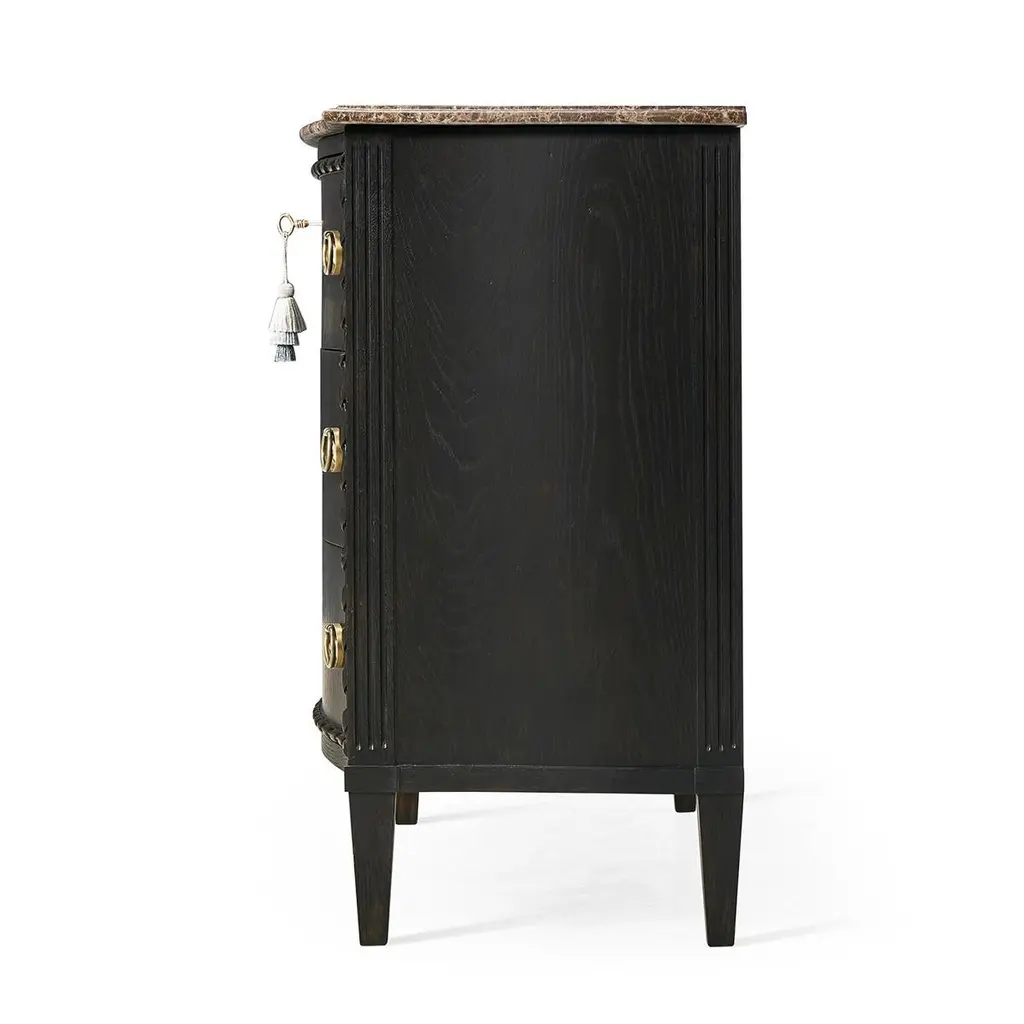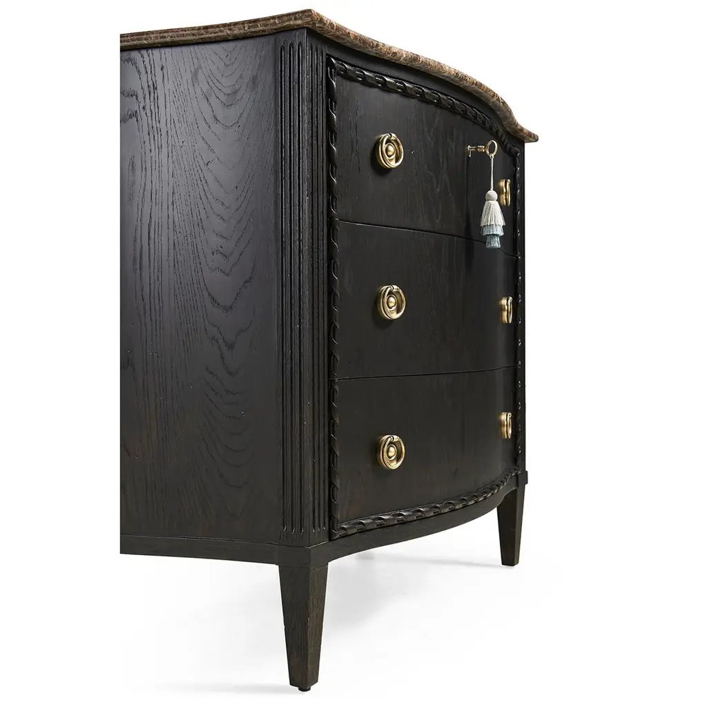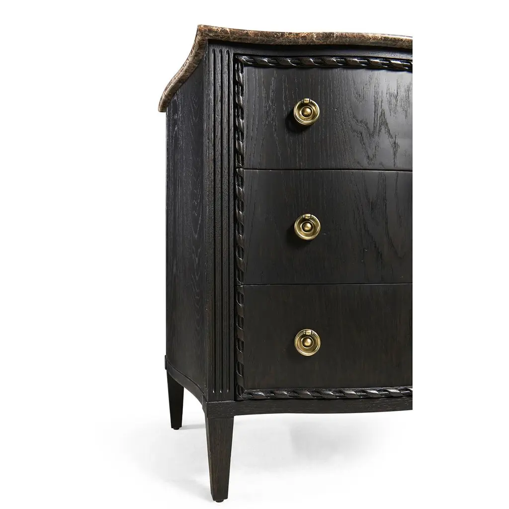 This exquisite chest is an ideal centerpiece for any bedroom or living space, offering both visual splendor and functional utility.The top of the chest is crafted from honed Emperador stone, known for its durability and natural beauty, which sits atop a serpentine form that gracefully complements the intricate design. The body of the chest features a sleek ebonized oak finish that adds a contemporary edge to the traditional silhouette. Carved rope detailing along the frame introduces a textural element that enhances its classic appeal.The drawers are adorned with cast brass ring pulls set on ornate backplates, each contributing to the chest's luxurious and traditional aesthetic. This fusion of vintage charm and modern sophistication makes the Ebonized French Marble Top Chest a timeless addition to any home bedroom decor.Dimensions: 36" W x 18" D x 32" H