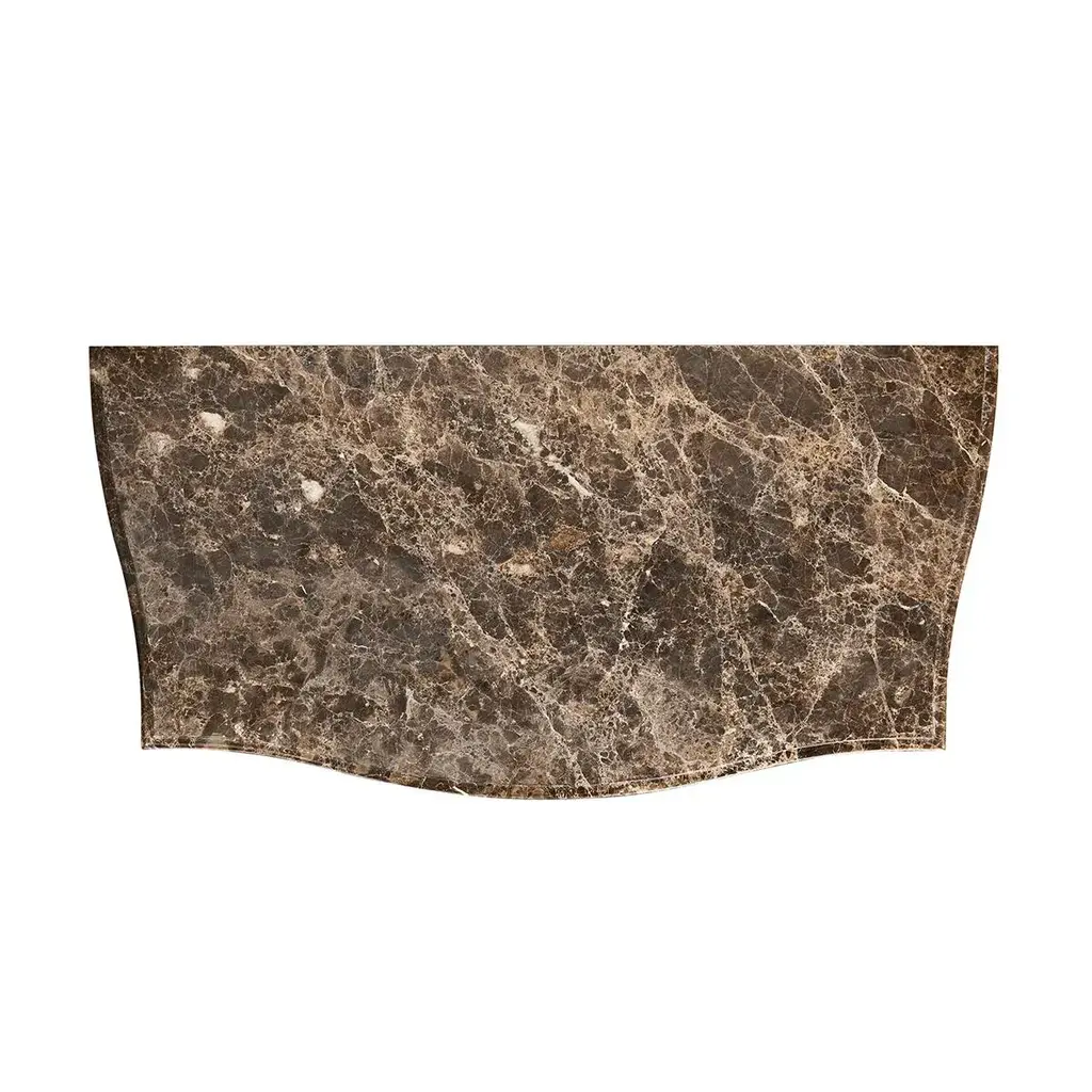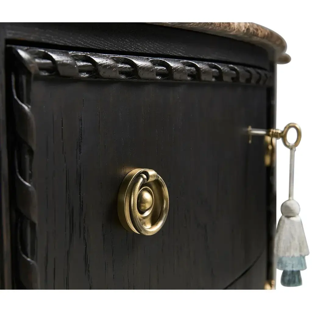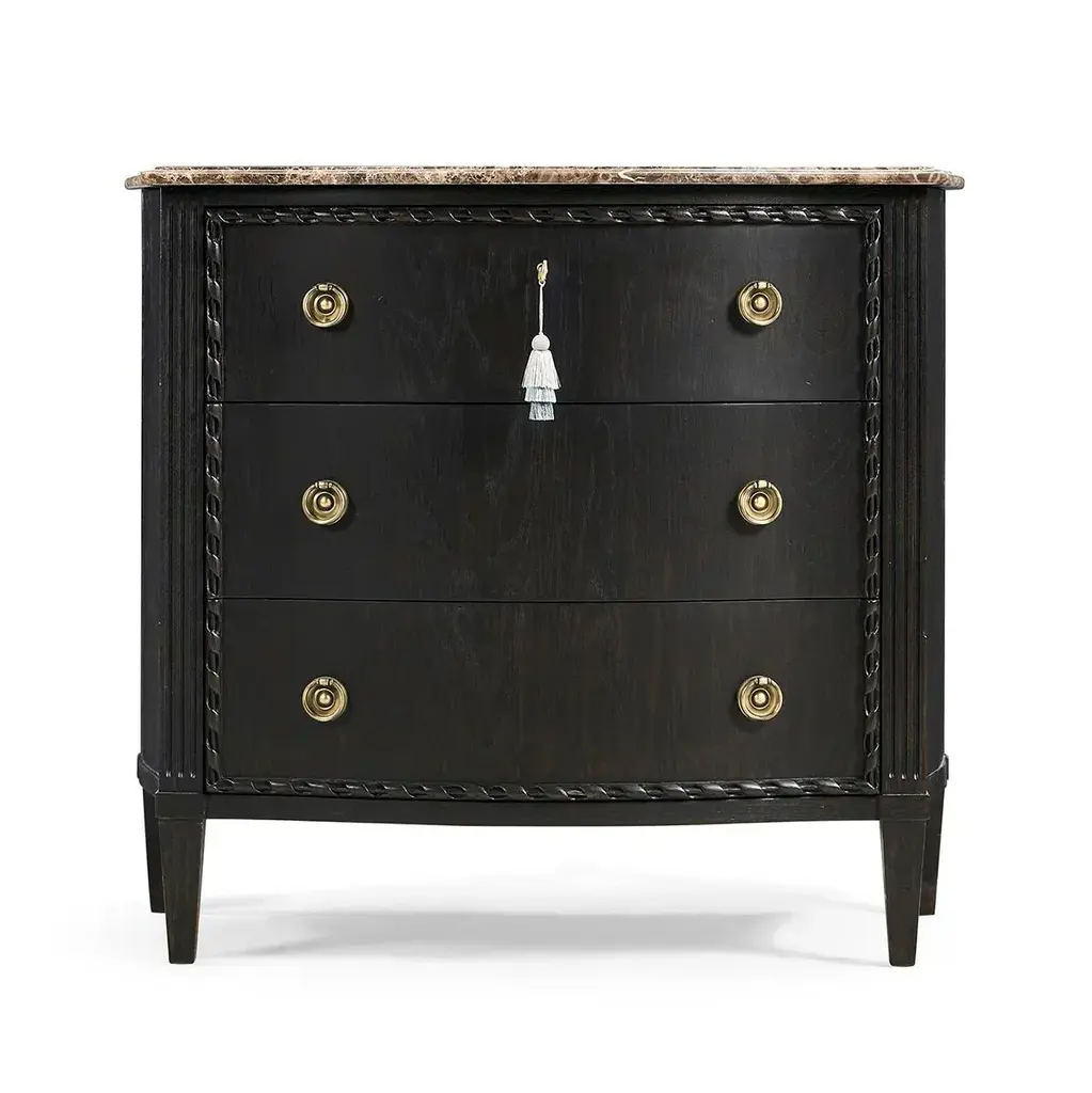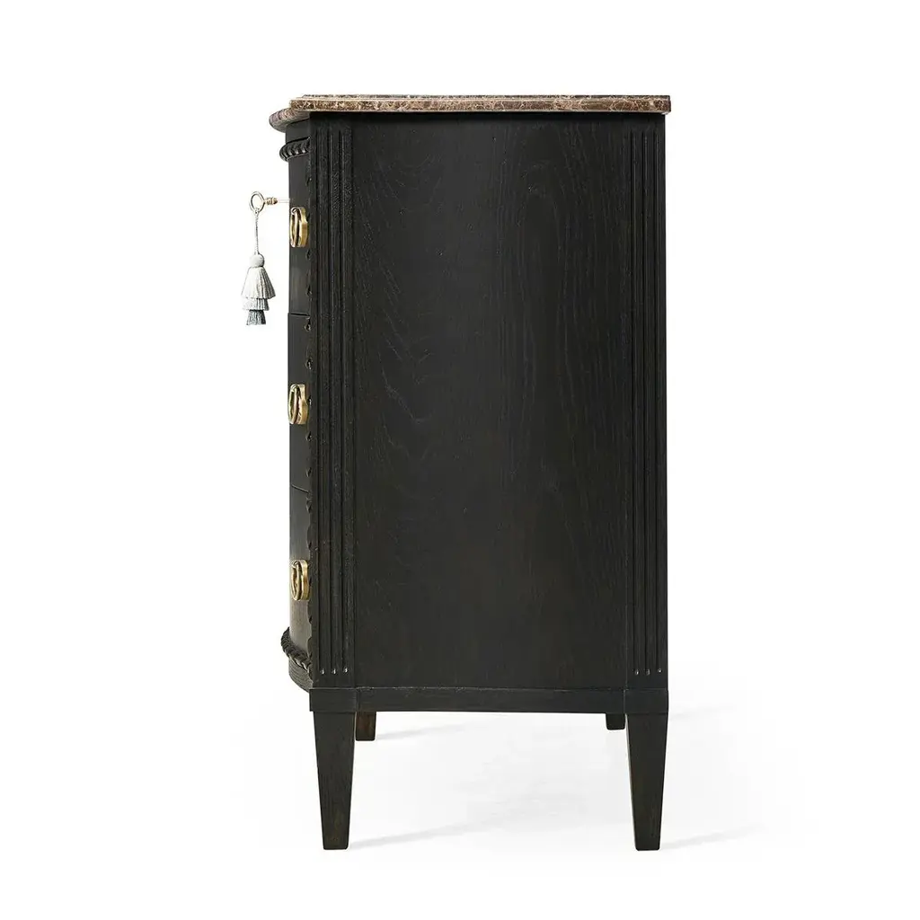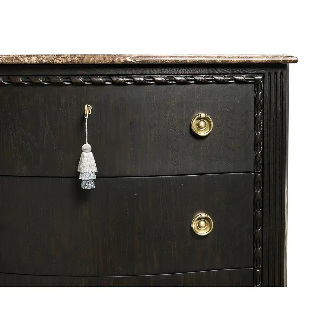 This exquisite chest is an ideal centerpiece for any bedroom or living space, offering both visual splendor and functional utility. The top of the chest is crafted from honed Emperador stone, known for its durability and natural beauty, which sits atop a serpentine form that gracefully complements the intricate design. The body of the chest features a sleek ebonized oak finish that adds a contemporary edge to the traditional silhouette. Carved rope detailing along the frame introduces a textural element that enhances its classic appeal. The drawers are adorned with cast brass ring pulls set on ornate backplates, each contributing to the chest's luxurious and traditional aesthetic. This fusion of vintage charm and modern sophistication makes the Ebonized French Marble Top Chest a timeless addition to any home bedroom decor. Dimensions: 36" W x 18" D x 32" H
