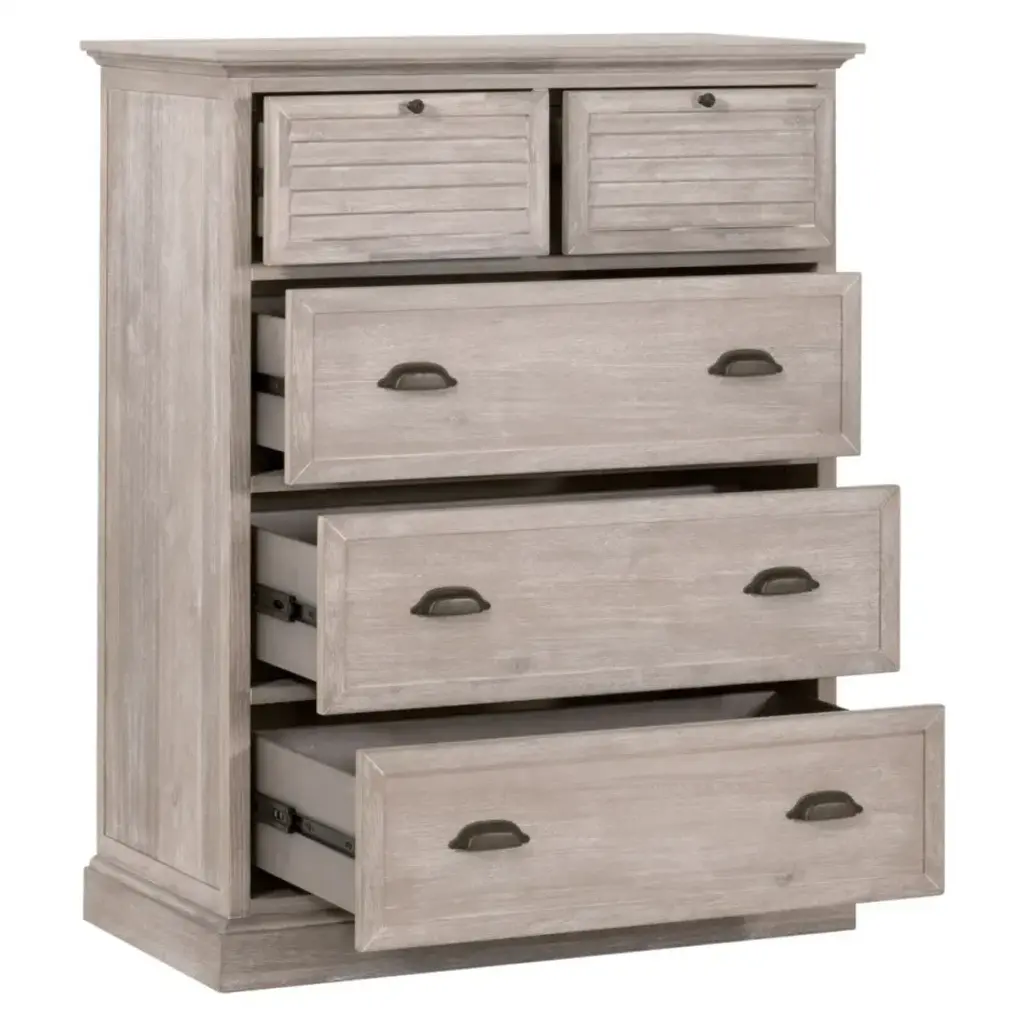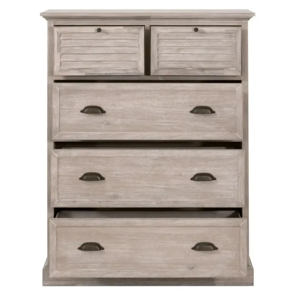 This classic high chest of drawers will be a staple in your home for years to come. Crafted with beautiful acacia wood, the chest has a timeless look that will complement many styles and pieces in your bedroom. It supplies ample storage space with two felt-lined top drawers and three additional drawers with double handles. The wood contains natural gray undertones and white wood grains for a cool and neutral finish. The top storage drawers are crafted with a slatted design, adding dimension to the front face of the chest. This will fit in well with farmhouse, transitional and traditional designs.