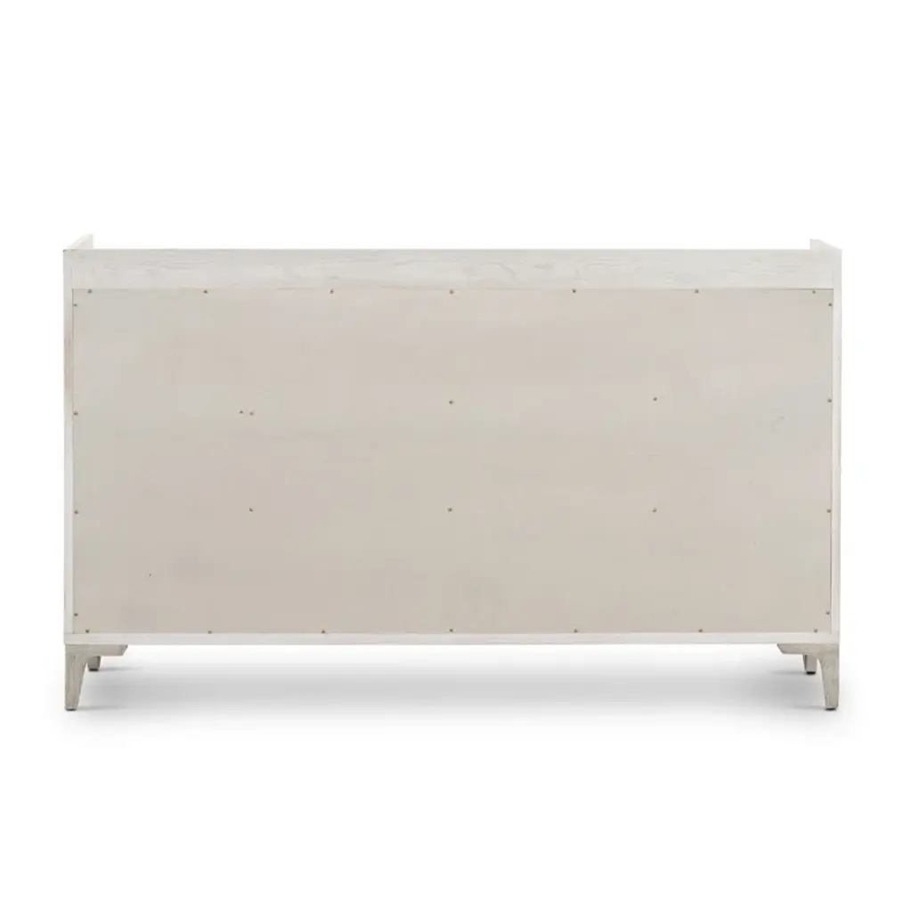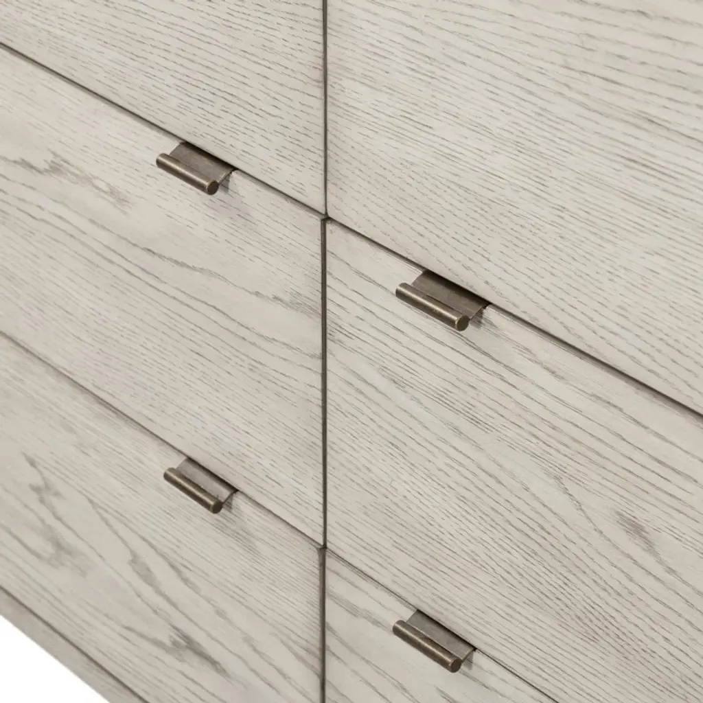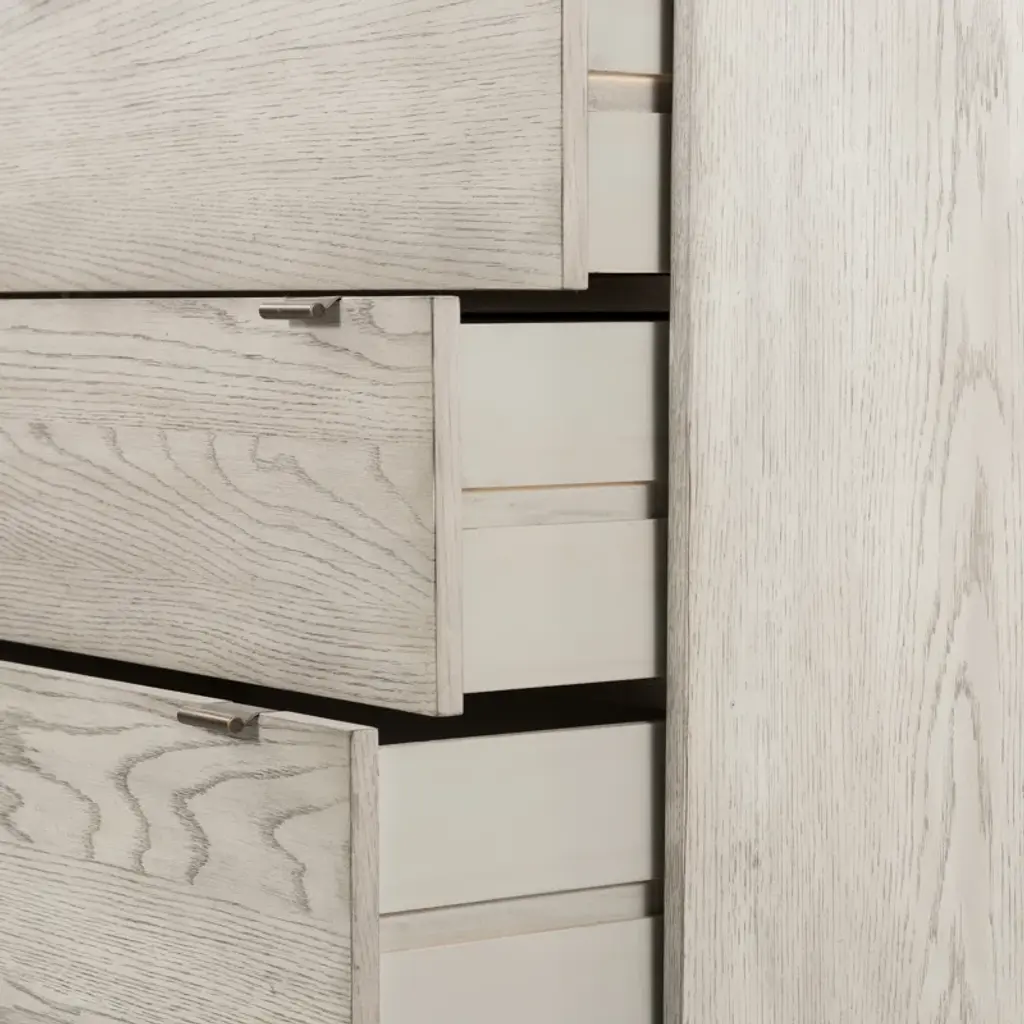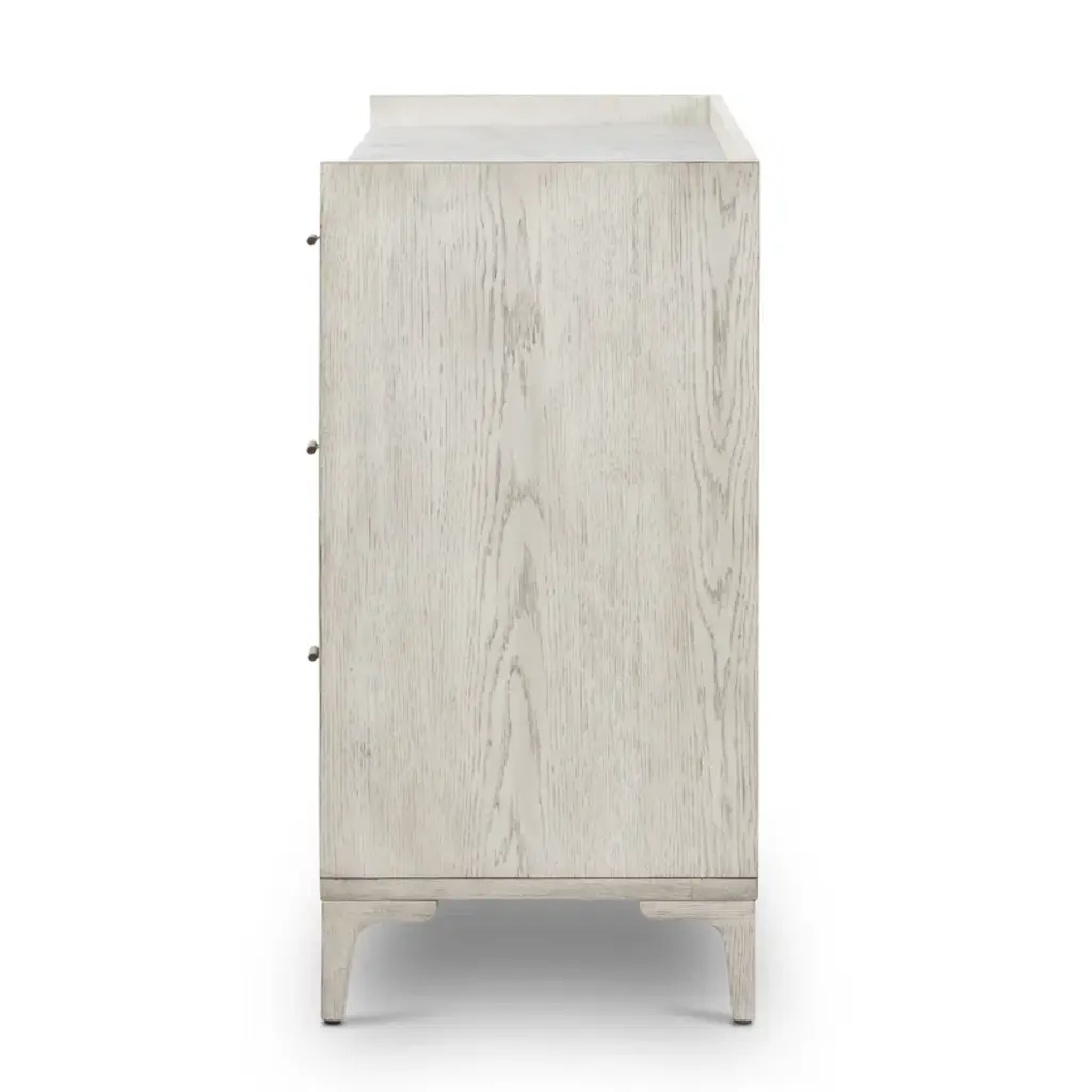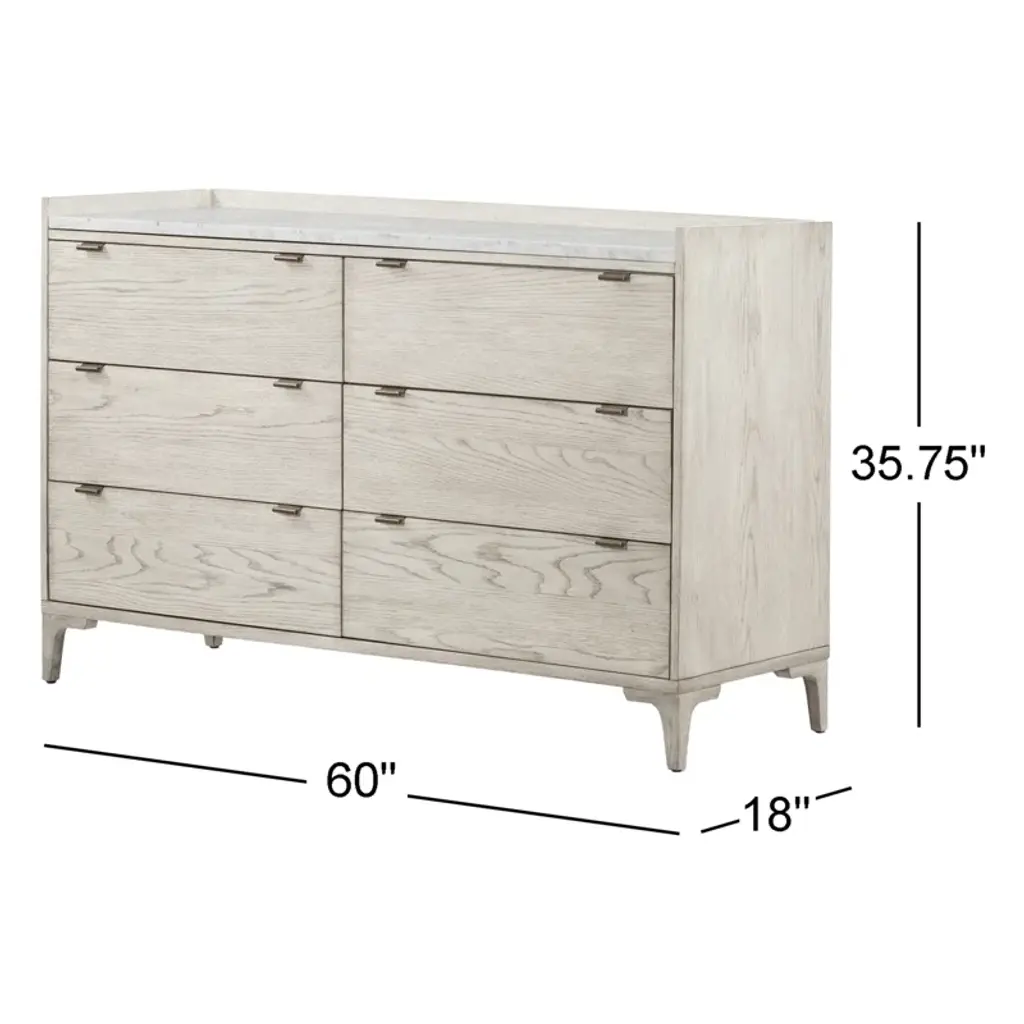 Vintage white oak is finished with a dry hand for a light look, while a top of white Italian marble offers a sophisticated material mix. Six spacious drawers bring generous storage space to the bedroom.