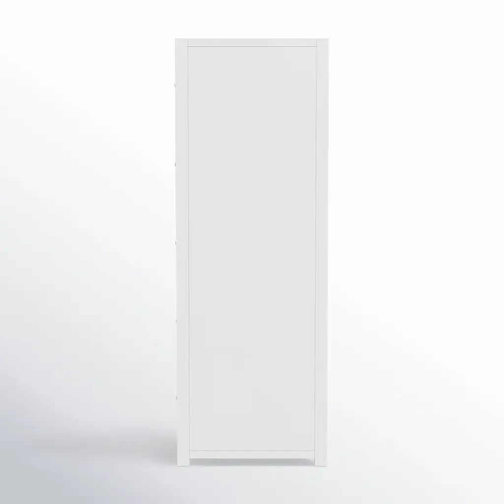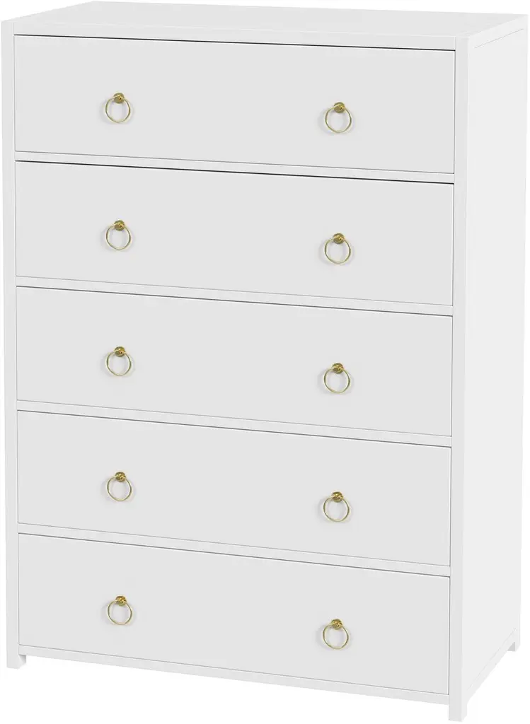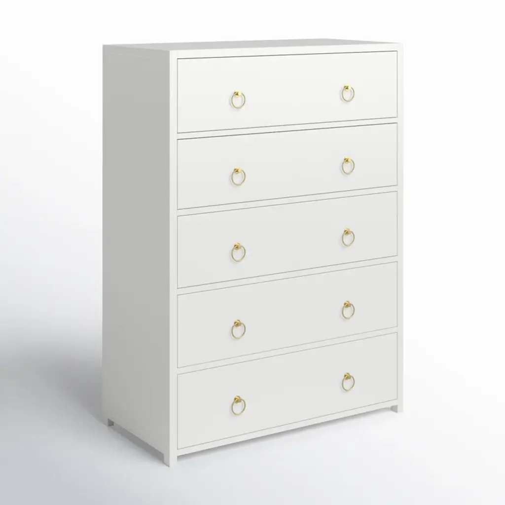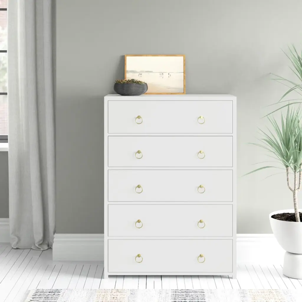 An easy mix or match, our dresser features a streamlined design and an array of finish options. We love how its vertical orientation lets you place it in most rooms, large or small. Kiln-dried acacia wood with engineered wood contrasts with the metal ring pulls on all five drawers for a bold look. And there's a lot of room inside each for your wardrobe essentials.