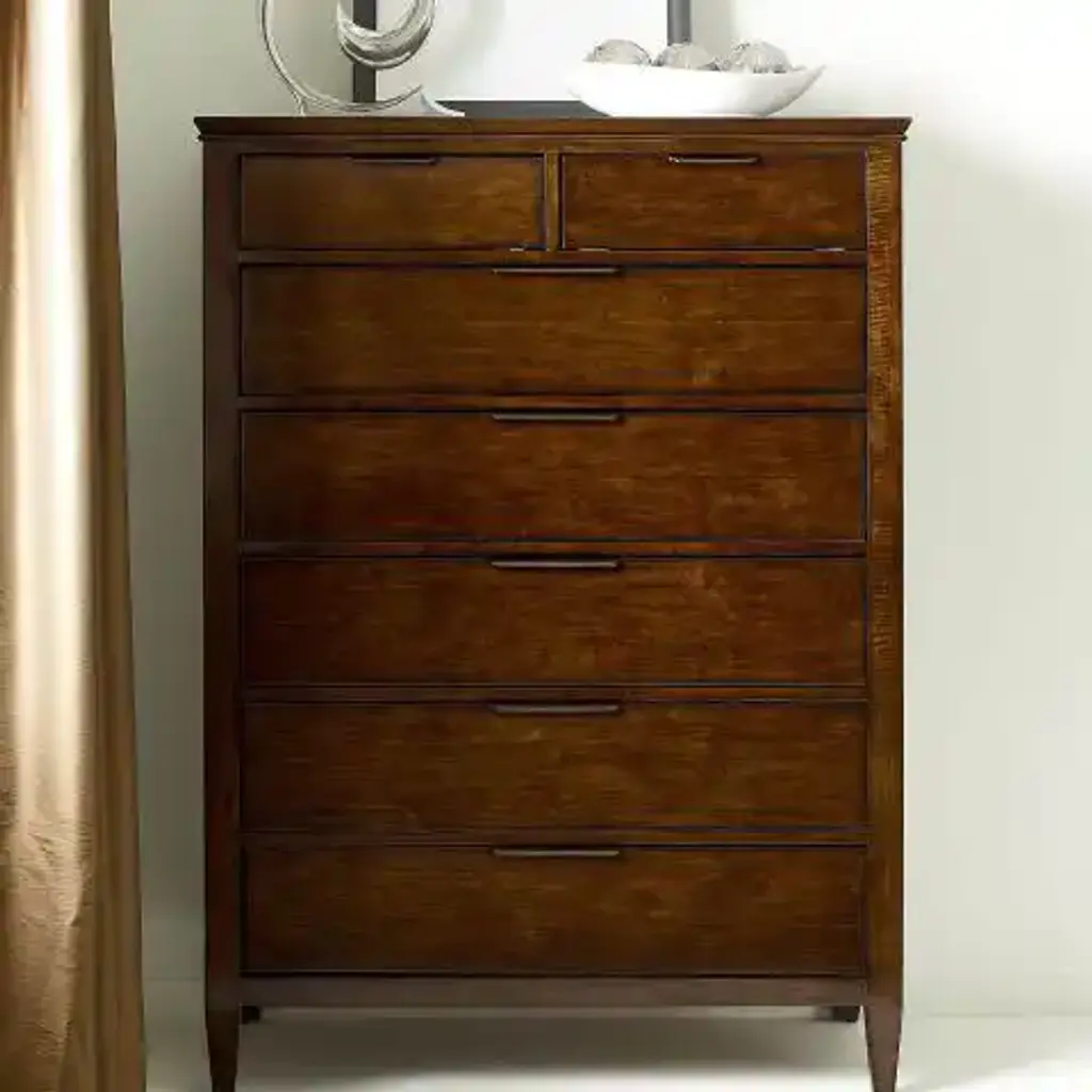 The Aiden Chest from the Elise Collection is a masterpiece of functional elegance. Meticulously crafted from solid Alder wood, this chest showcases the natural beauty and durability of its premium material. Seven spacious drawers provide ample storage for your wardrobe essentials, with the second and third drawers featuring practical dividers for enhanced organization. The chest's thoughtful design extends to its base, where adjustable levelers ensure stability on any surface, allowing for perfect placement in your bedroom. The Aiden Chest's timeless silhouette effortlessly complements a variety of decor styles, from traditional to contemporary. Whether gracing a master suite or enhancing a guest room, this exquisite piece combines superior craftsmanship with practical storage solutions, promising to be a cherished addition to your home for generations.