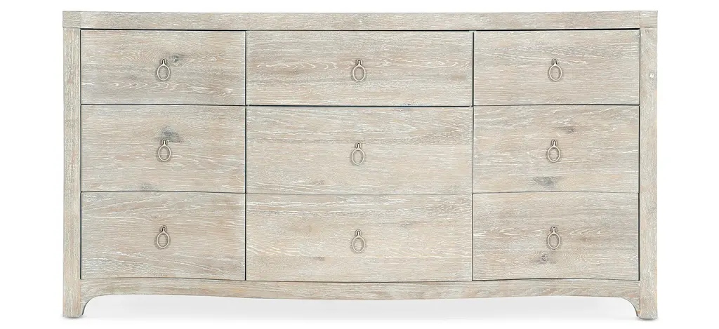 Serene with simplicity, the elixir six-drawer dresser has crisp, clean lines. Character is achieved through textural interest with the gray-beige finish applied to lightly sand-blasted walnut veneer for an organic look. For added texture, the knobs are faux shagreen. The bottom drawers are cedar-lined, and there is a red drop-in felt liner in the top drawers. Elixir is a casual contemporary collection that, as its name implies, exudes a feeling of comfort, simplicity, and well-being. While Elixir has crisp, clean lines, character and visual interest are also achieved through the use of texture. Textural interest comes from the use of lightly sand-blasted walnut veneer, the light texture applied to the metal elements with a hand-carved texture added to the surface of select pieces such as the oval mirror and the round dining table. The buffet offers a beautiful carved starburst pattern on the doors.