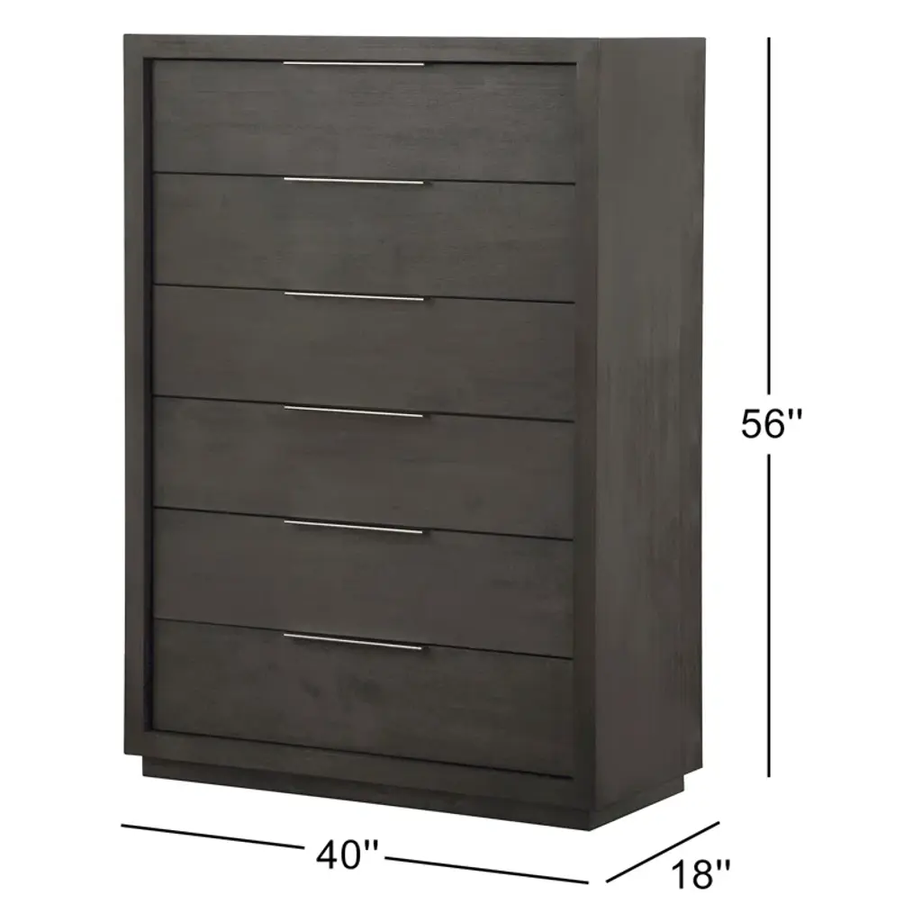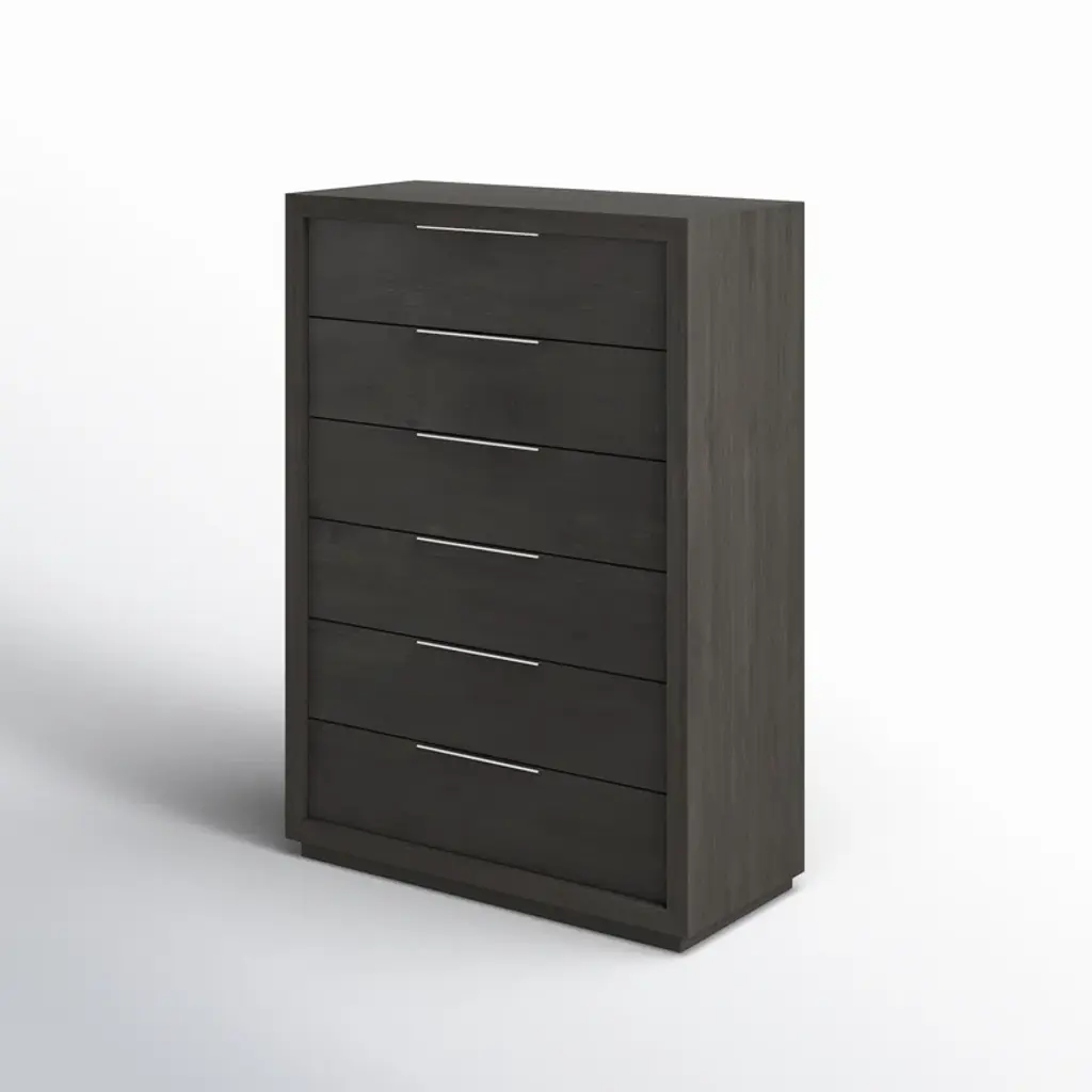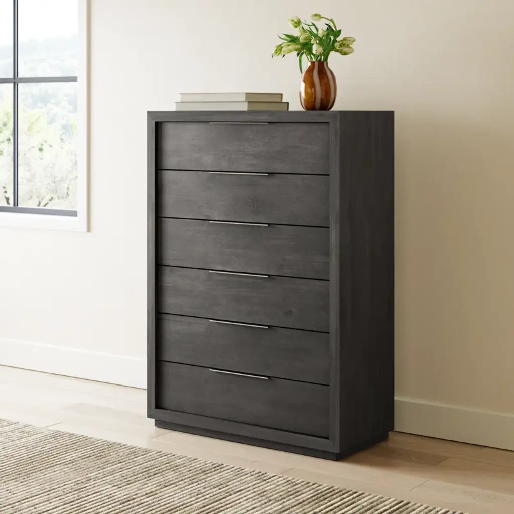 Refresh your space. Our wood dresser demands a second look with its floating plinth base and tailored silhouette. Six fully extendable drawers offer hidden storage for cozy sweaters and casual tees, while felt lining helps to protect your delicate items. Crafted from acacia wood, this dresser comes in your choice of gray finish complemented by removable nickel hardware. Drawer safety stops and a wall anchor kit provide extra stability and peace of mind. Arrives fully assembled. Love this look. Shop the collection.
