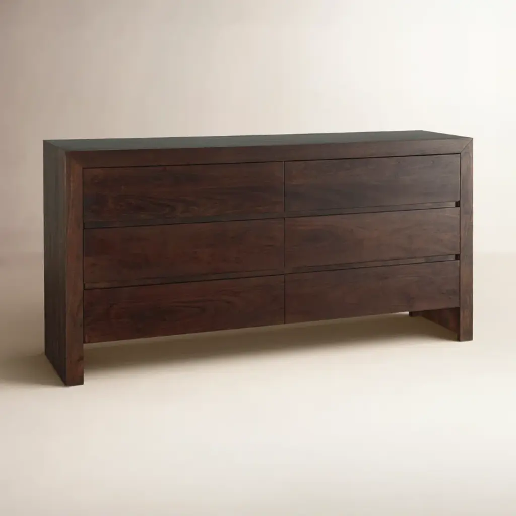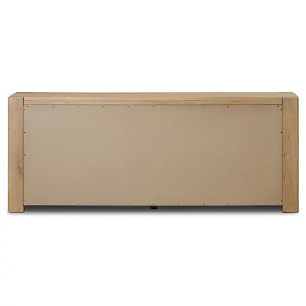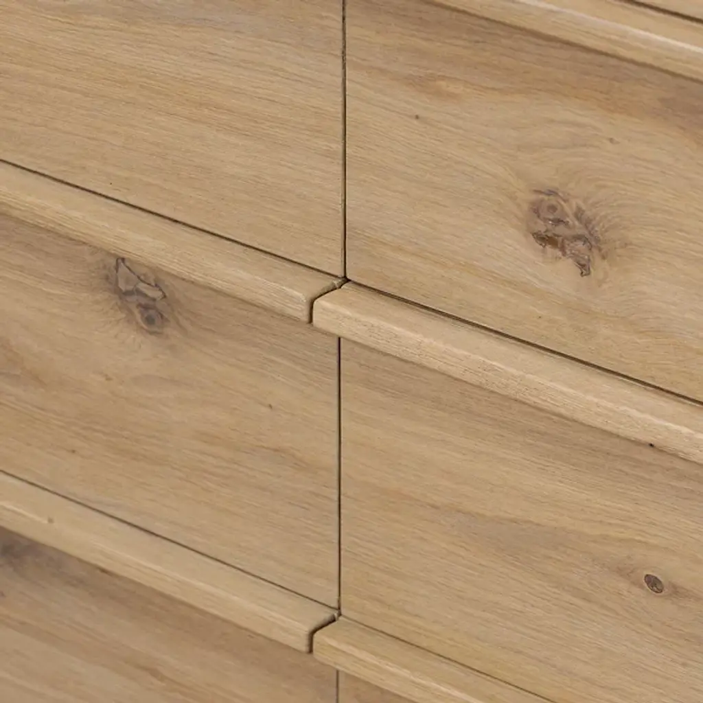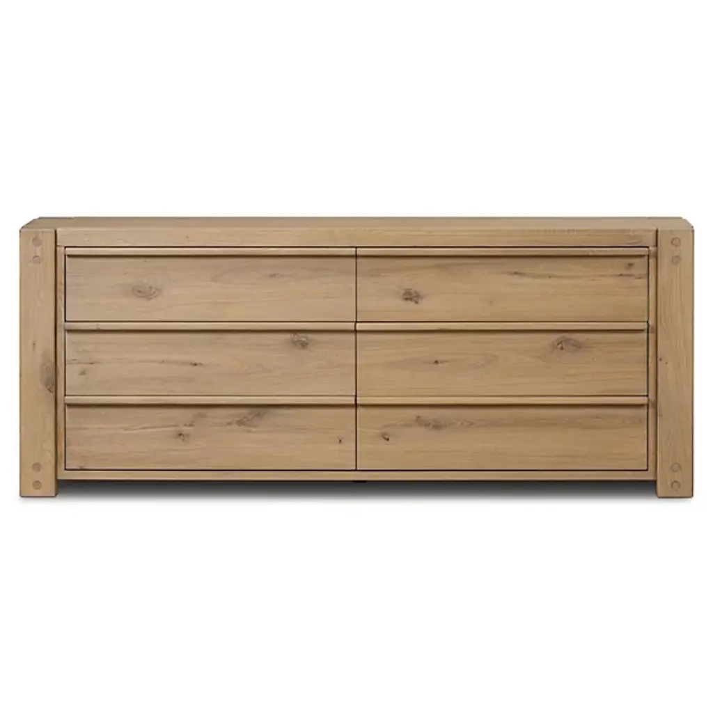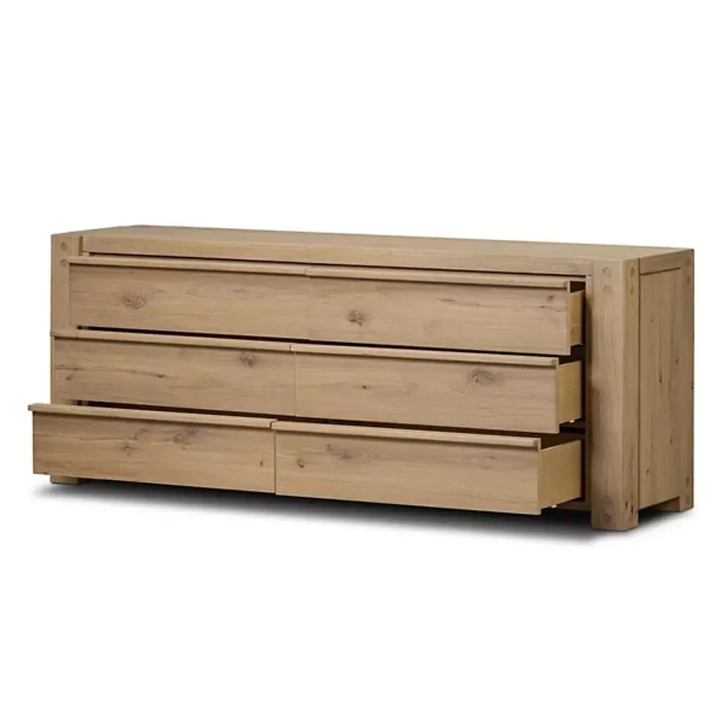 The Emmer 6 Drawer Dresser from Four Hands showcases thick oak veneer and solid oak construction that highlights the natural beauty of the wood grain. Six spacious drawers offer organized storage while the rich texture and color variations inherent in oak create depth and warmth. Simple hardware allows the material quality to remain the focal point, while the straightforward design ensures this dresser integrates seamlessly into various bedroom styles. The robust construction promises years of reliable use, making it both a functional storage solution and an investment piece.