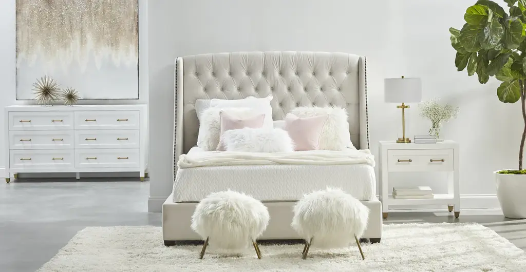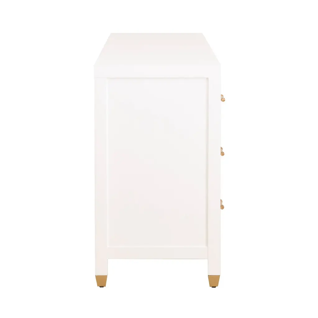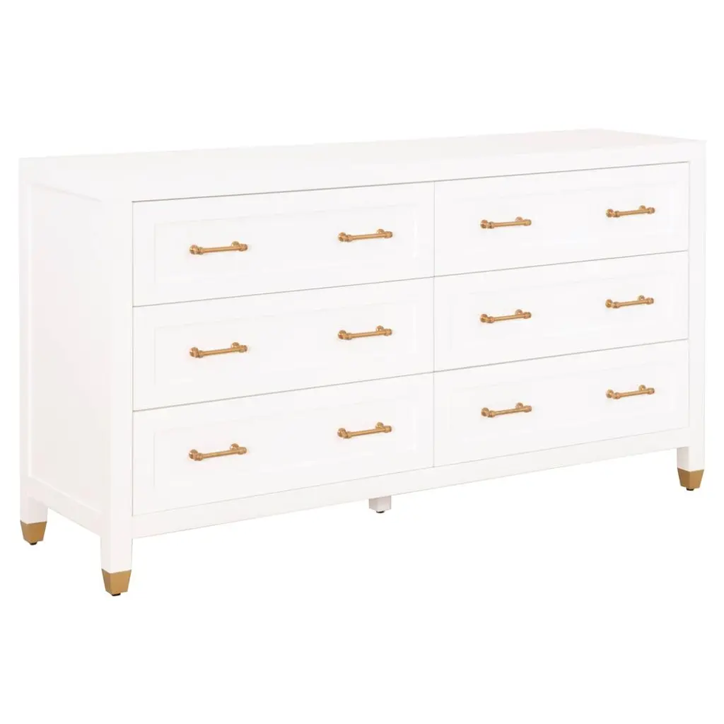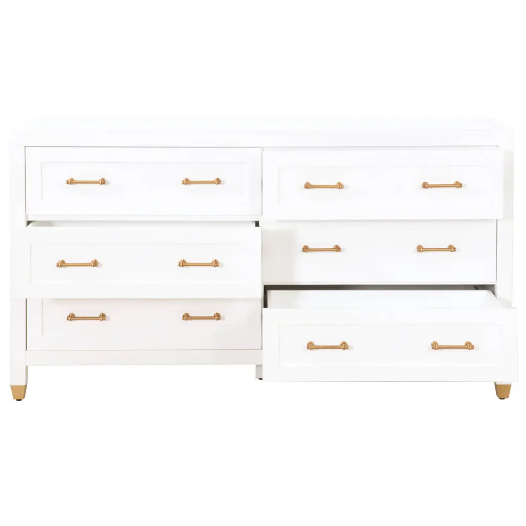 Transitional style six drawer dresser with smooth opening storage drawers and Matte White or Honey Oak finish with Brushed Brass accents. Dimensions Drawer Interior Dimensions: 28.5" x 16" x 6" Drawer Handles: 5" x 5/8" Features Materials: Lacquer, Solid Rubberwood, MDF, Plywood, Steel PO Hardware: Brushed Brass Handles & Foot Caps 6 Storage Drawers Full Extension Metal Drawer Glides Brushed Brass Handles and Feet Hold-In Detent Prevents Drawer Roll Out Free shipping in the continental U.S.