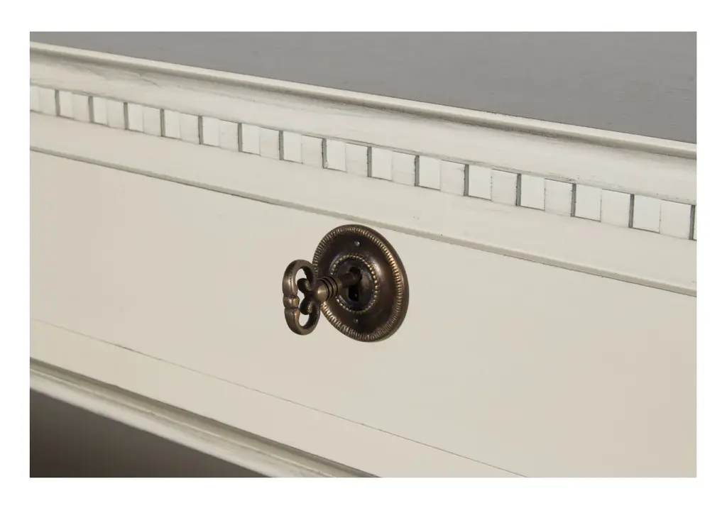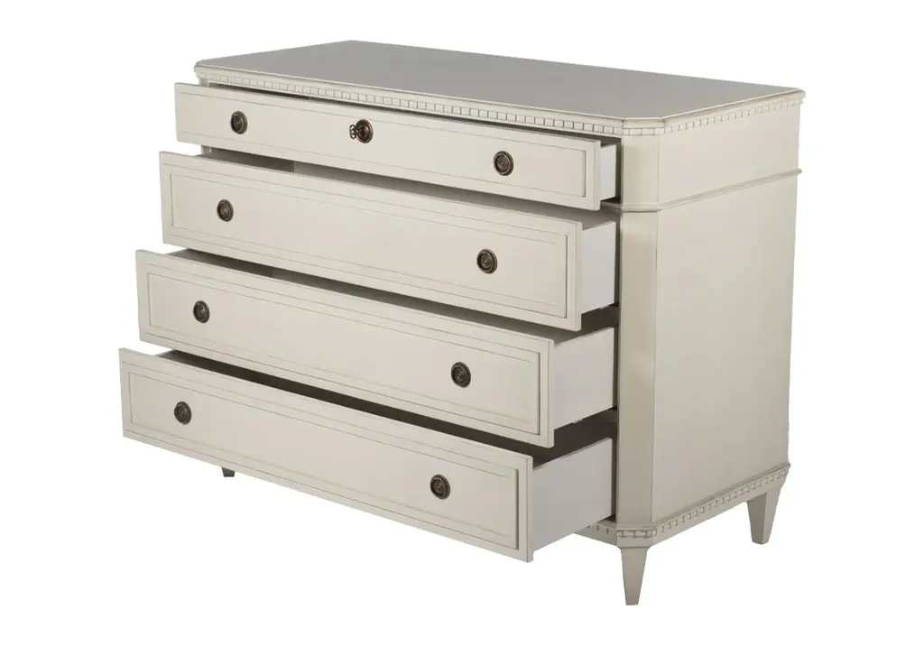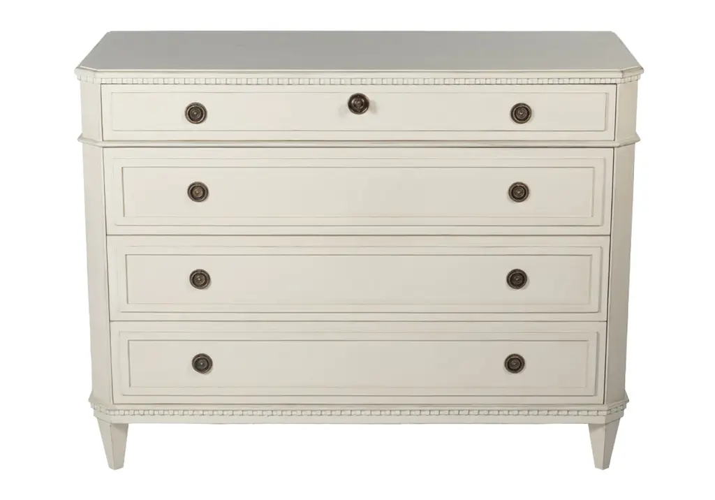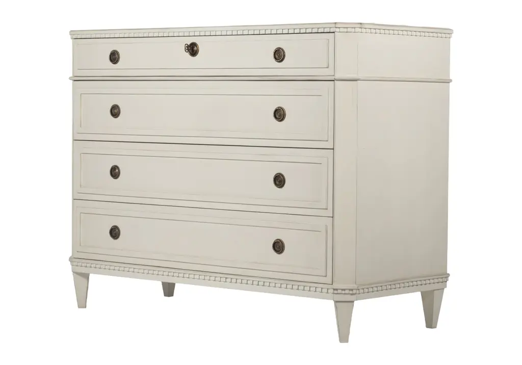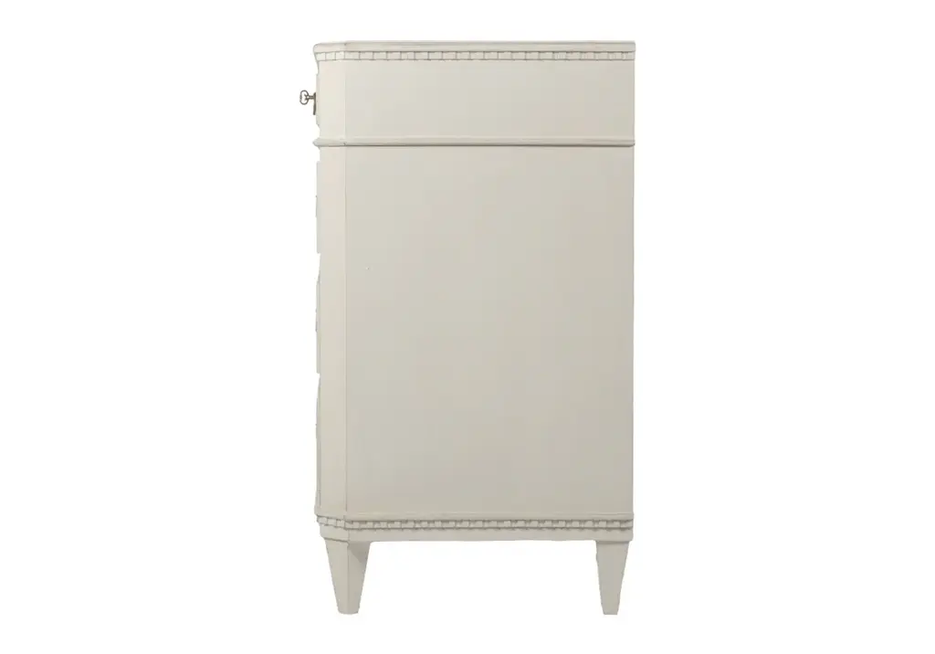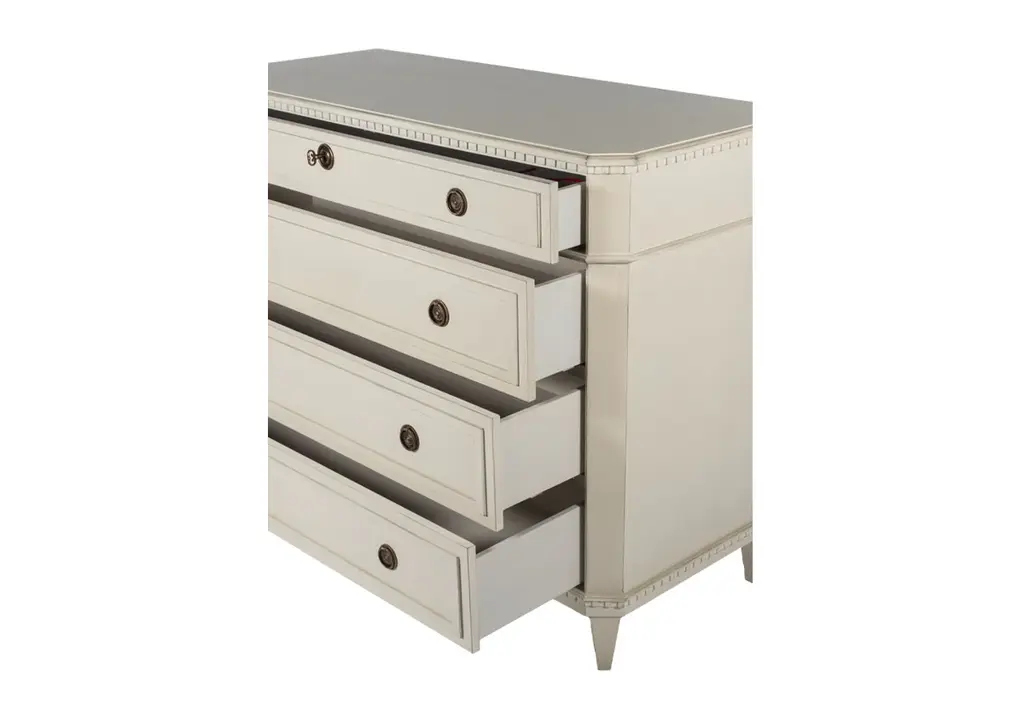 The Estelle Chest makes an elegant statement with its generous size complemented by a slim top drawer with a functioning lock and key, and three large drawers with ring pulls in antiqued brass. A tasteful dentil moulding runs along the top and bottom for additional detailing. Beveled corners and a 45-degree tapered feet soften its look, styling easily into an entryway, hallway, music room, living room, dining room, or bedroom.