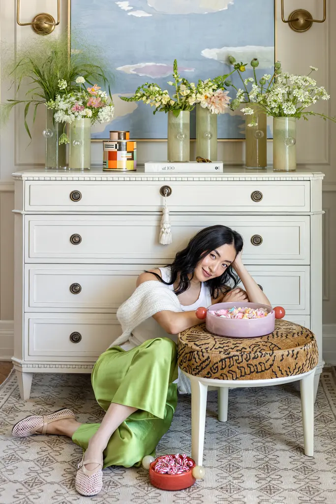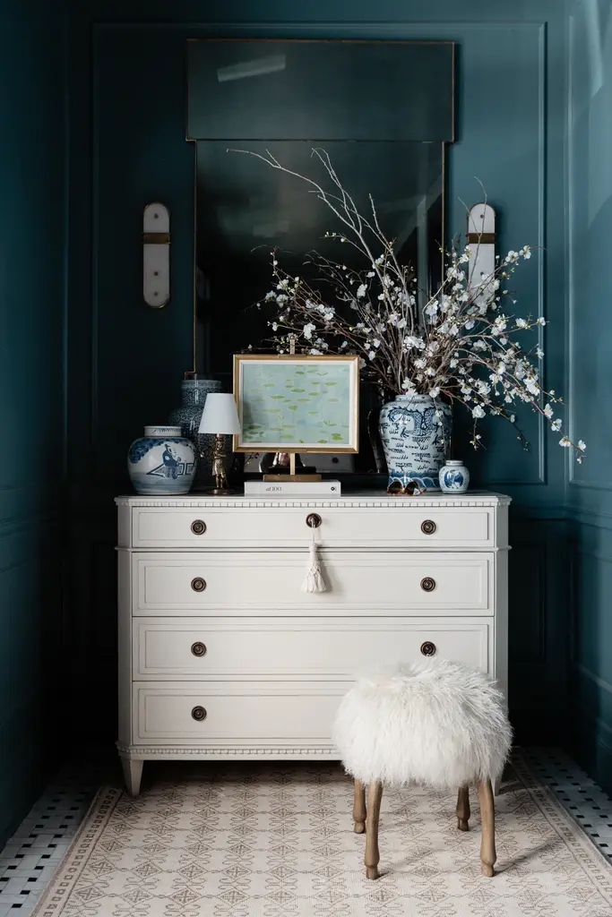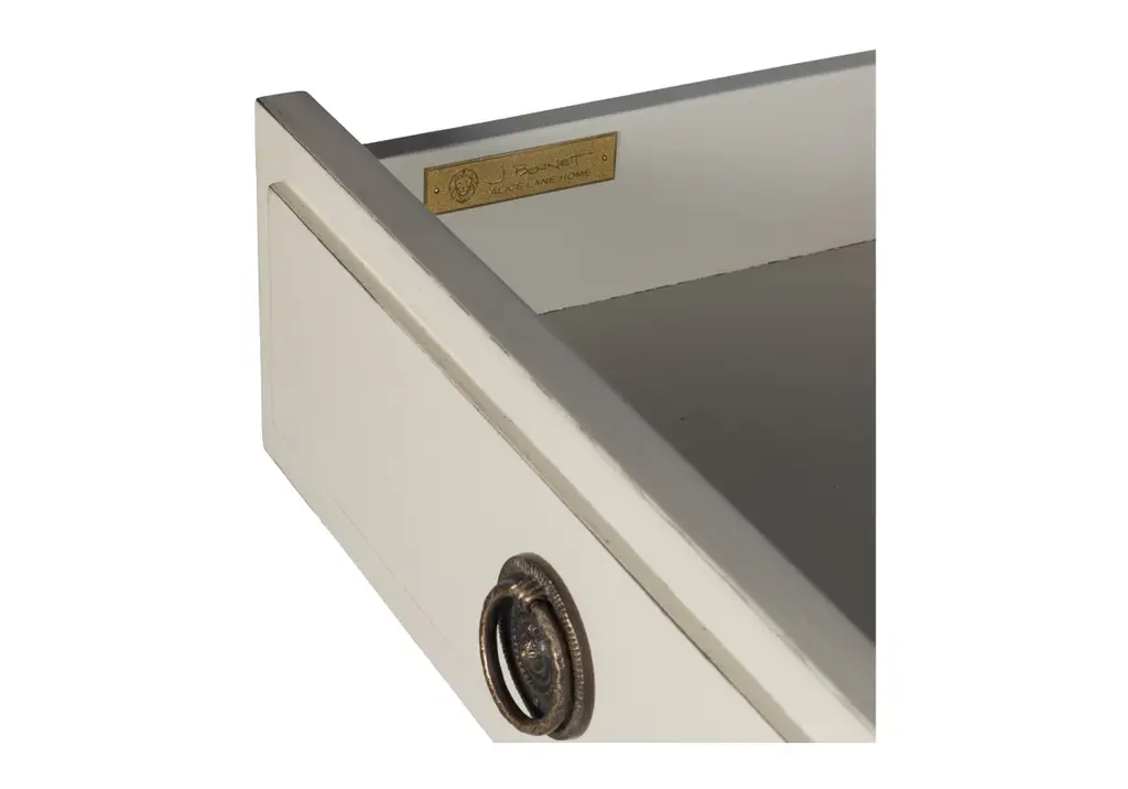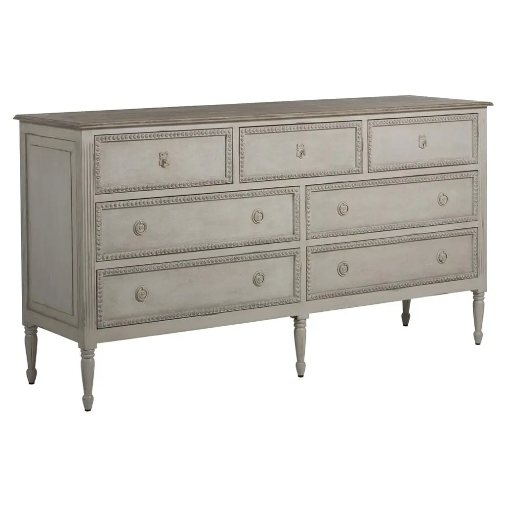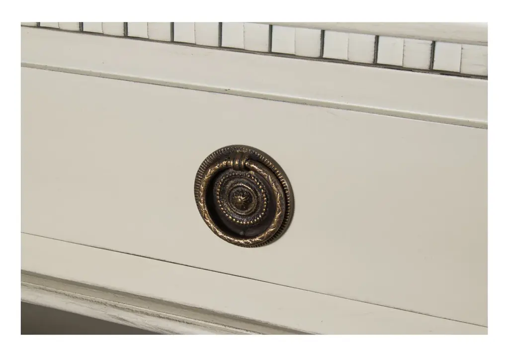 The Estelle Chest makes an elegant statement with its generous size complemented by a slim top drawer with a functioning lock and key, and three large drawers with ring pulls in antiqued brass. A tasteful dentil moulding runs along the top and bottom for additional detailing. Beveled corners and a 45-degree tapered feet soften its look, styling easily into an entryway, hallway, music room, living room, dining room, or bedroom.