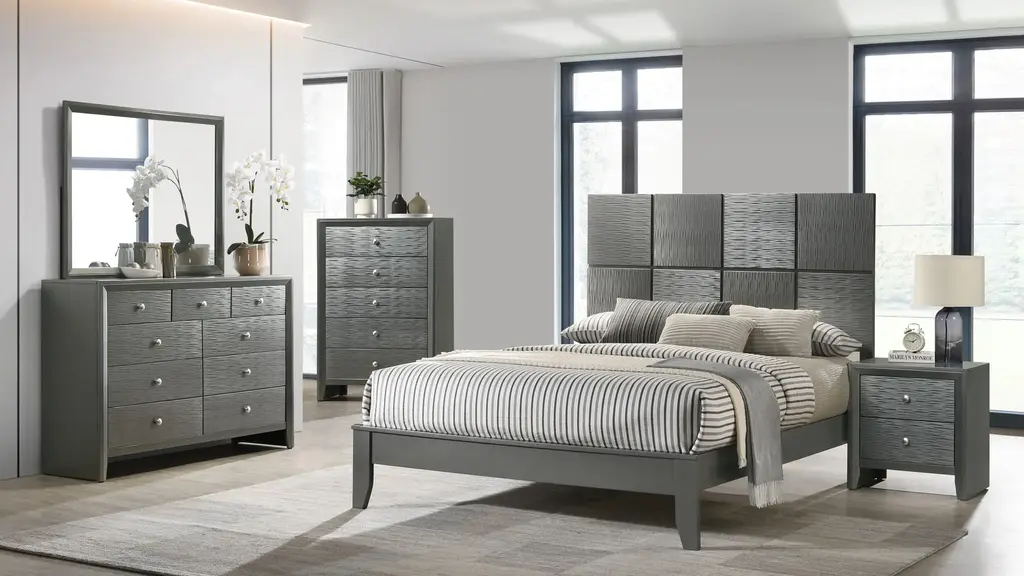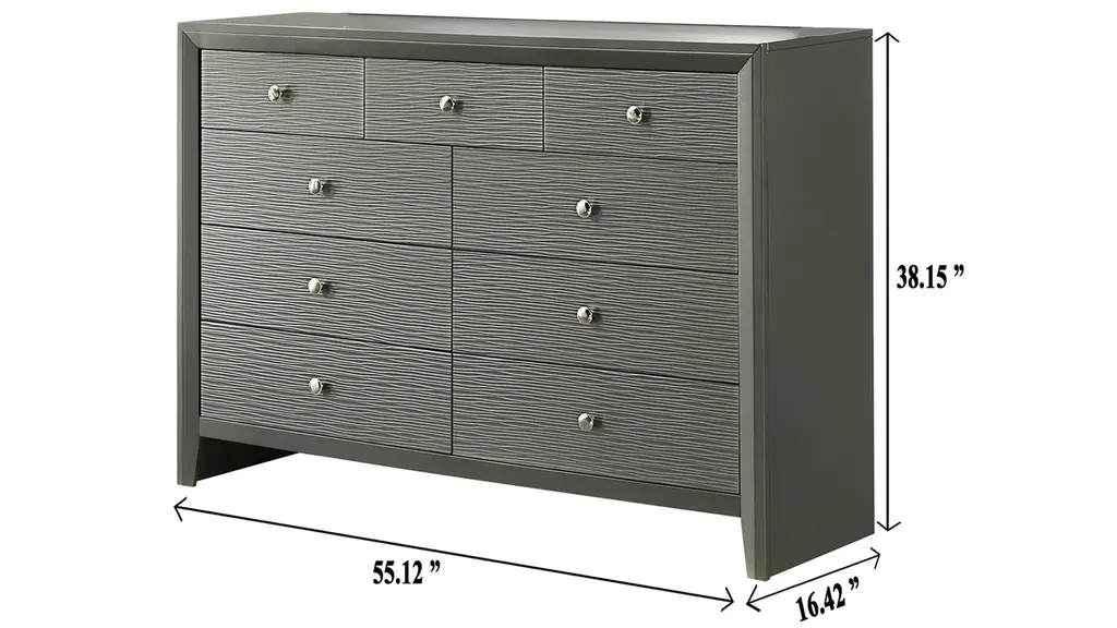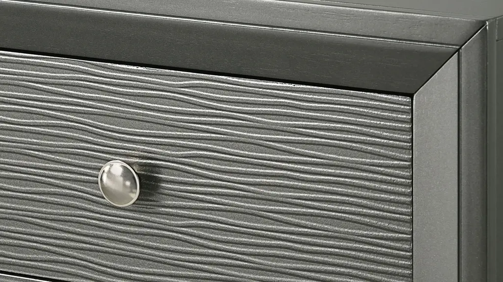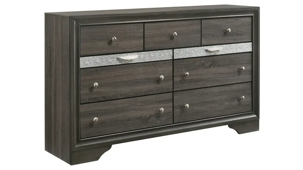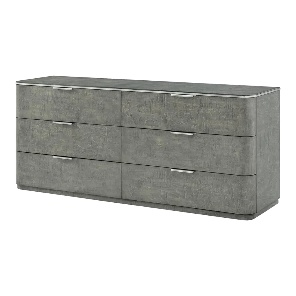 Elevate your sanctuary with this chic and contemporary Evan Dresser blends functionality with a sleek, modern aesthetic. The dresser exudes comfort and sophistication, sporting a minimalist design with textured fronts with chrome-accented drawer pulls.