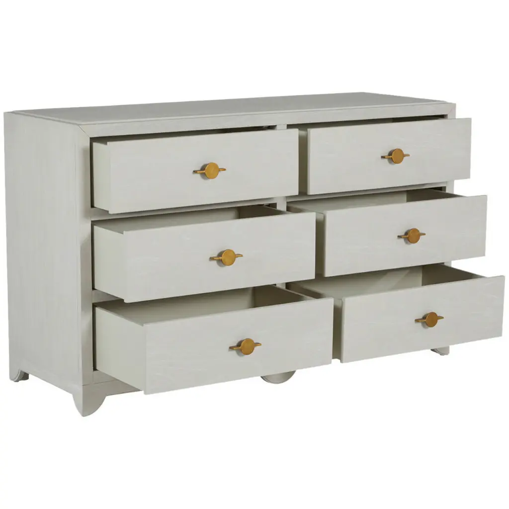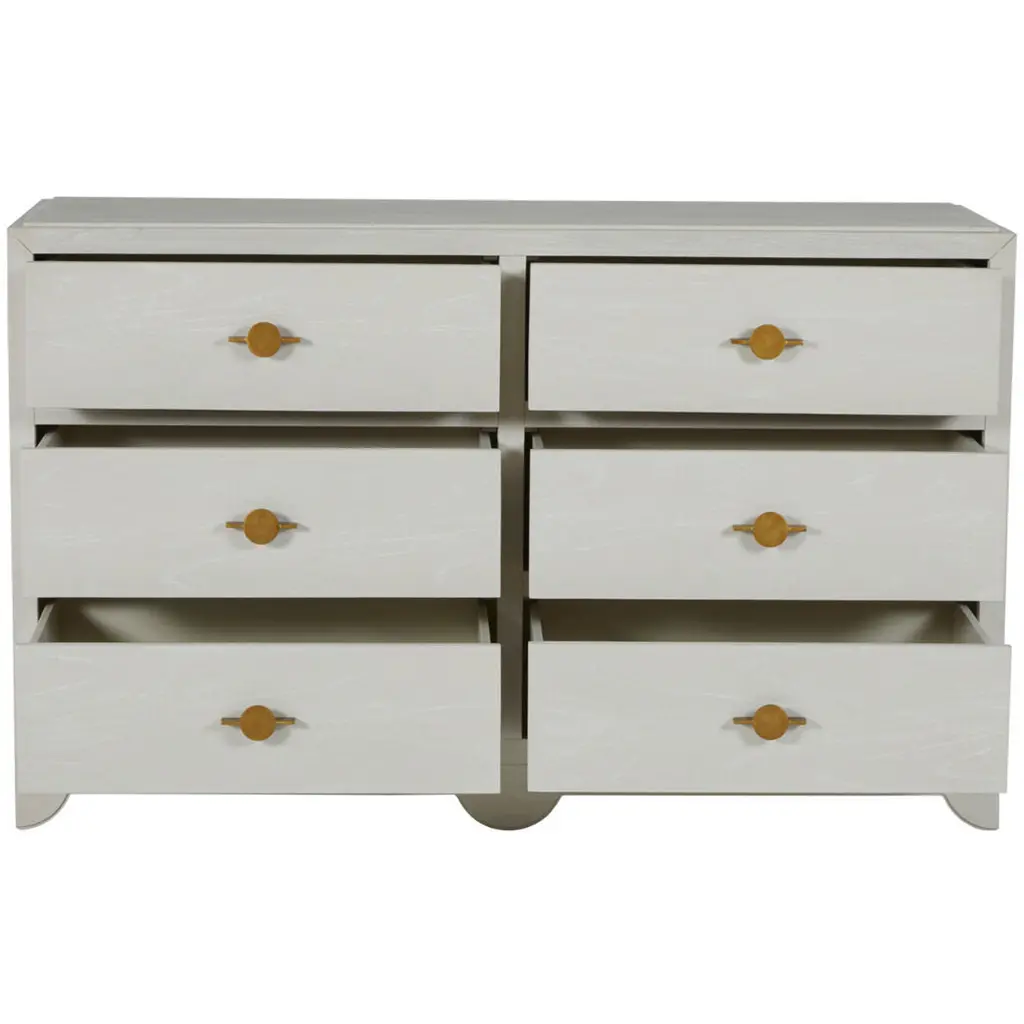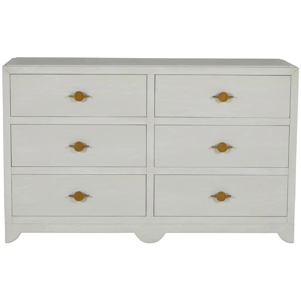 The Fairmont Dresser showcases a harmonious blend of classic design and modern functionality. With its sleek silhouette finished in a refined cerused white, this dresser brings elegance to any bedroom or living space. It features six spacious drawers, each adorned with unique circular stained gold hardware that adds a touch of sophistication. The Fairmont Dresser not only enhances your room's aesthetics but also offers ample storage for your essentials.