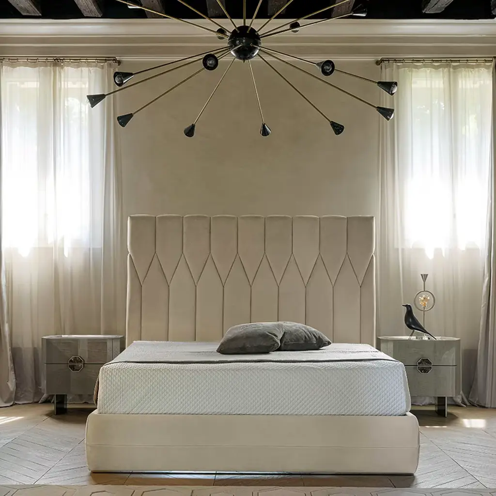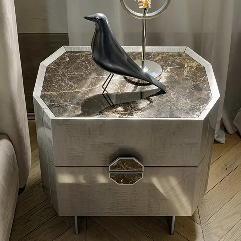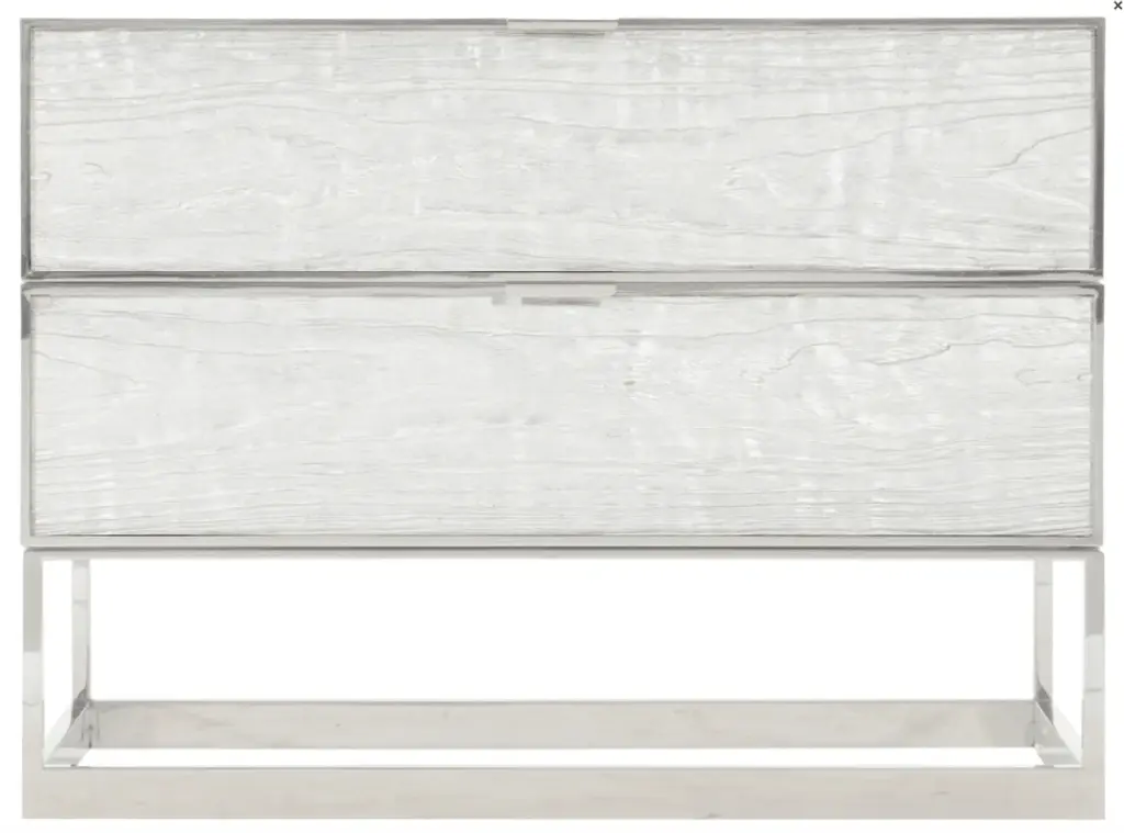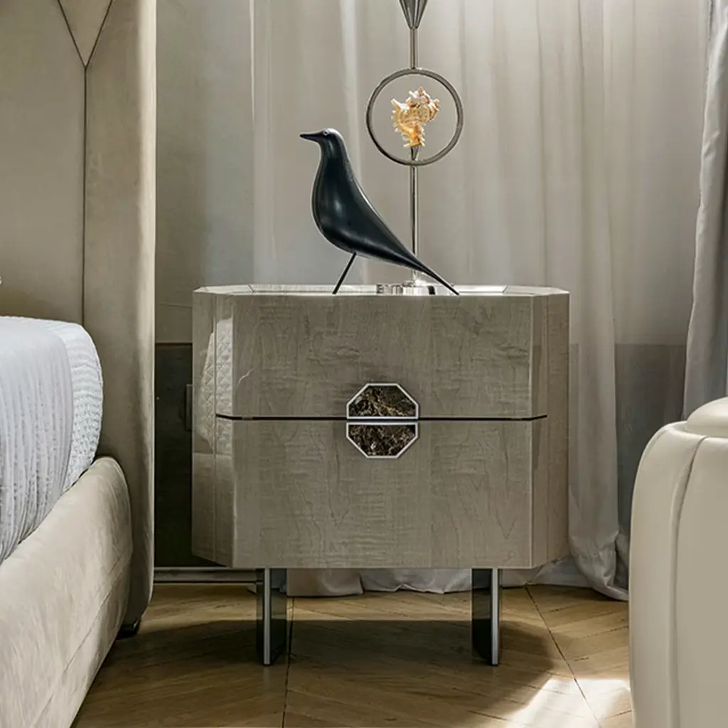 This elegant chest of 2 drawers has a wooden top, metal trims, and lacquered legs. The opening is facilitated by a precious Emperador Dark marble handle. Characterized by Lupo glossy finish, details are made of Nickel metal.
