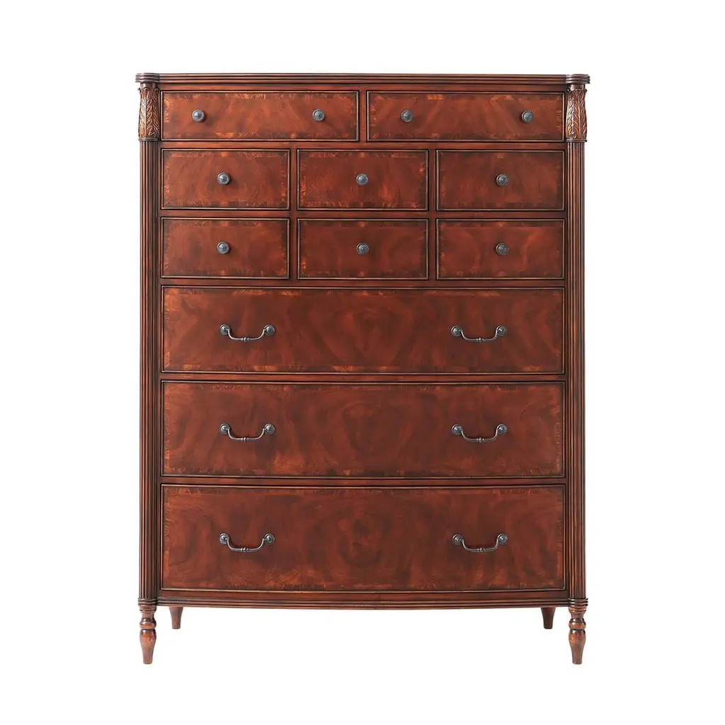 A Federal style mahogany and figured mahogany Gentleman's chest of drawers, the bowfront reeded edge top with protruding corners above leaf carved capital and reeded column supports, with an arrangement of eight short drawers and three long graduated drawers below, on turned feet. Inspired by a Federal Period original.Dimensions: 48.25" W x 20" D x 62" H.